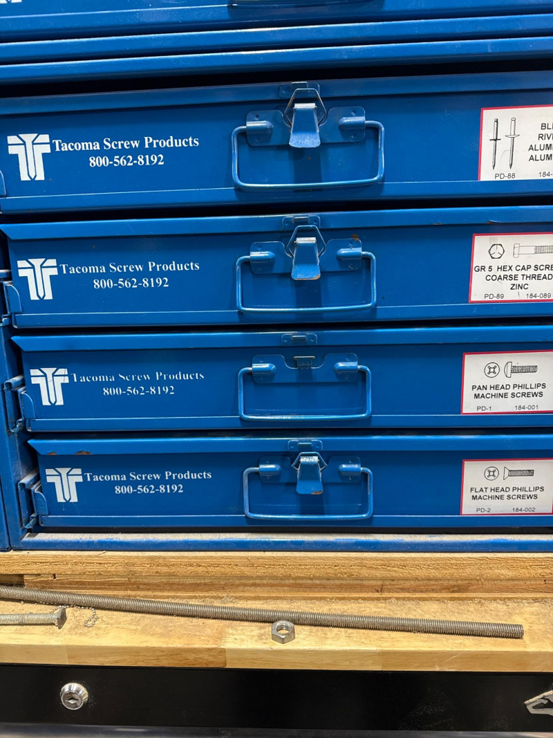 Four metal drawer cases filled with assorted hardware from Tacoma Screw Products, a trusted supplier known for industrial-grade fasteners and fittings. Each drawer contains a curated mix of screws, bolts, washers, anchors, and specialty components—ideal for contractors, shop owners, or anyone maintaining a well-stocked workbench. Includes all hardware as photographed. These cases are built for durability and organization, with labeled drawers and compartmentalized interiors. A practical, high-value lot for mechanical, electrical, or construction use. Includes 4 cases in detached single unit frame.
