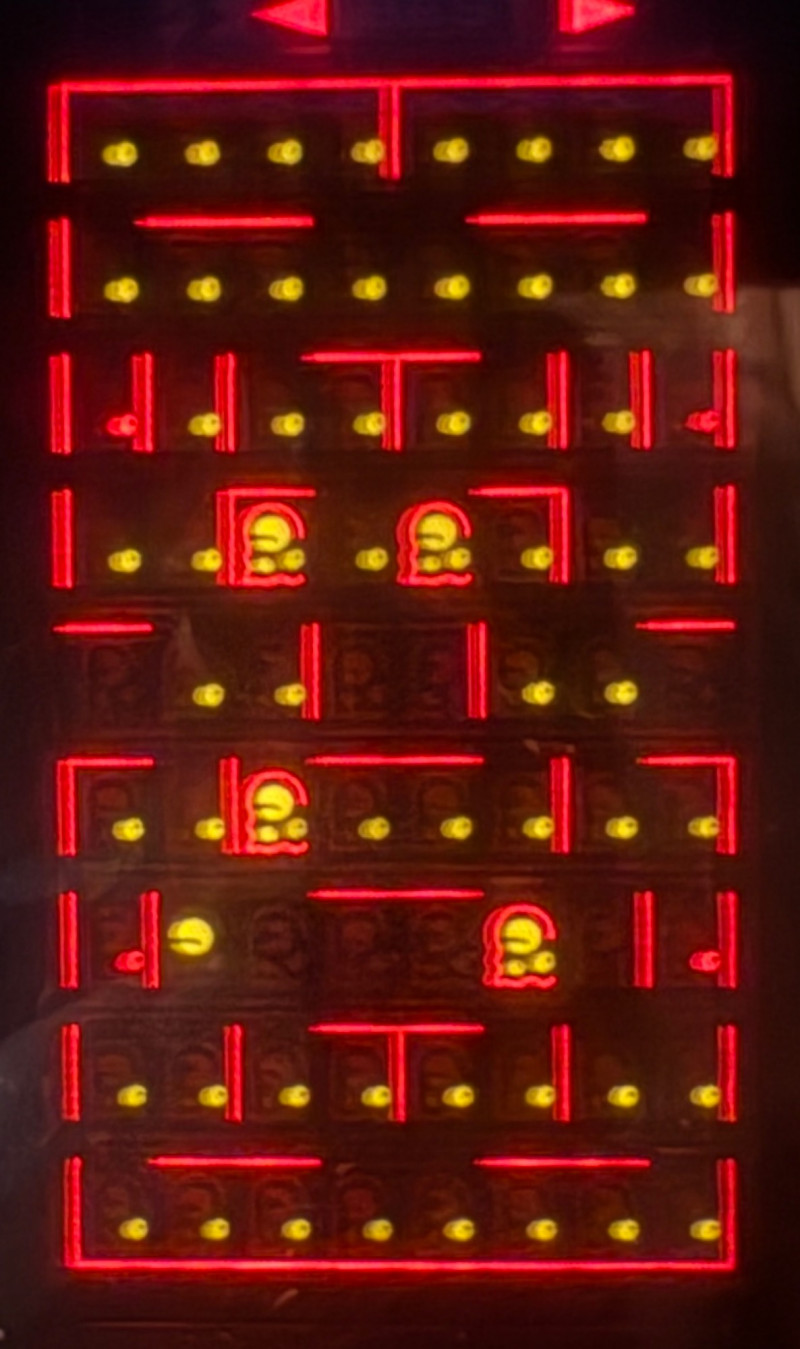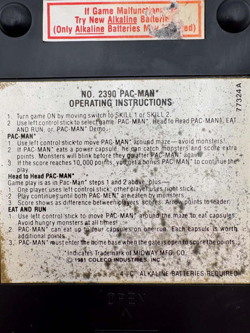 Great Pac-Man early video game from 1981! Powers up with all the "bing bing" and running scale sounds we remember from those early games in the late 1970s/1980s. Video screen lights up in orange on black and you see the little fellas chomping around the maze - we don't know how to play, but it appears to be functioning although the levers seem a bit sluggish in our limited experience (we've only played Pong). Uses 4 "C" batteries Model # 2390 from 1981.