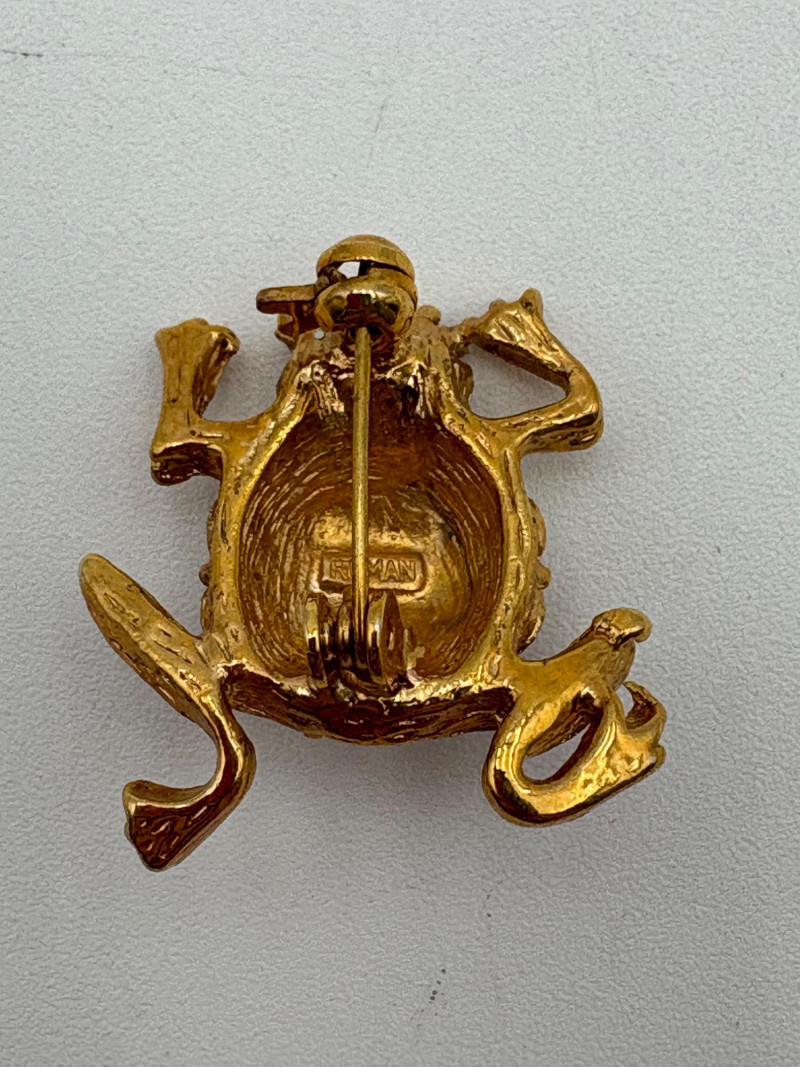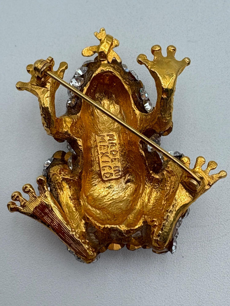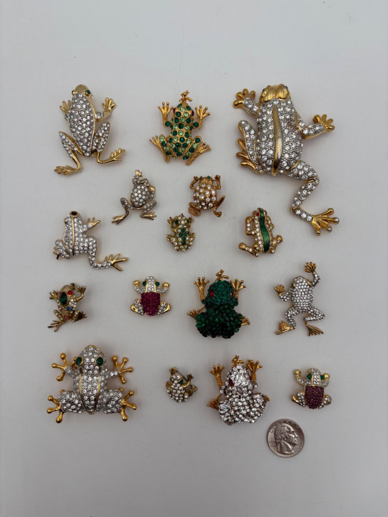 Group of 16 vintage costume jewelry pins with frog theme. From various sources - Mexico, Korea, etc and most are of good quality in heavy metal. Largest measures approx. 4" L. while the smallest measures approx. .75" L. Please look at photos - what you see is what you get!