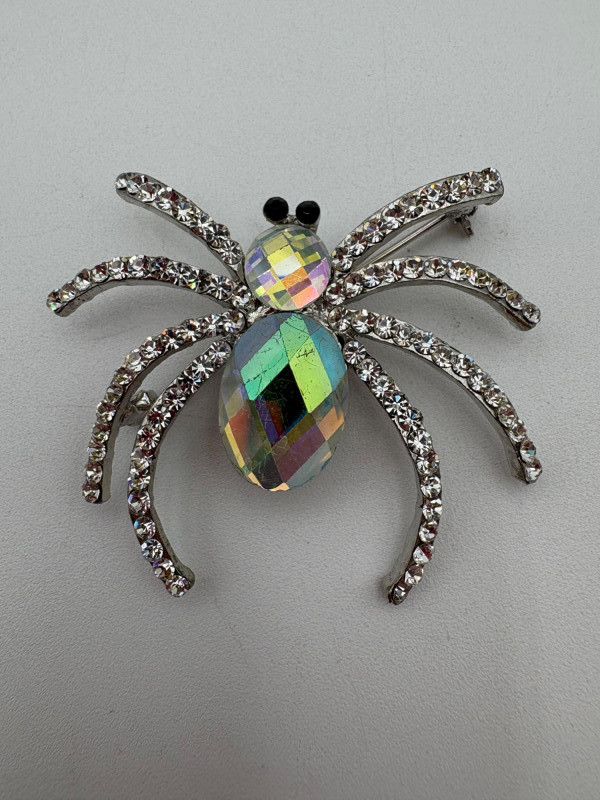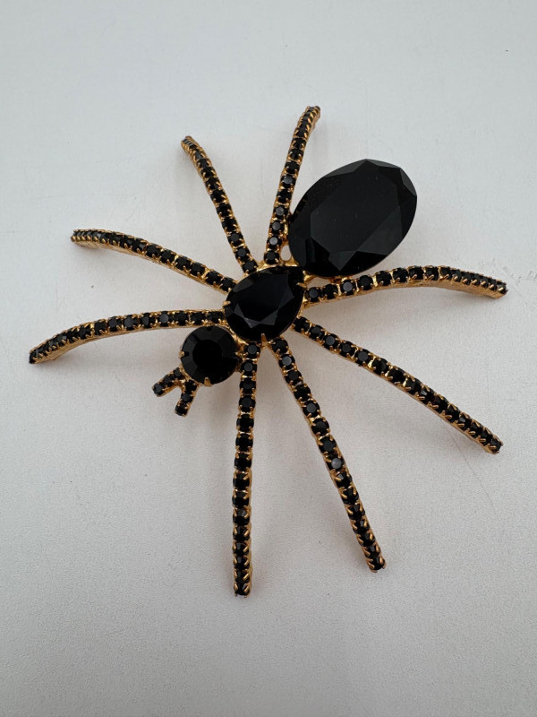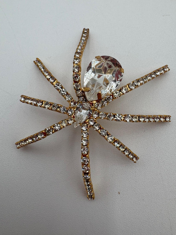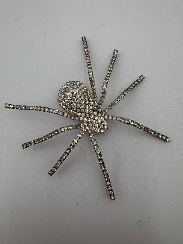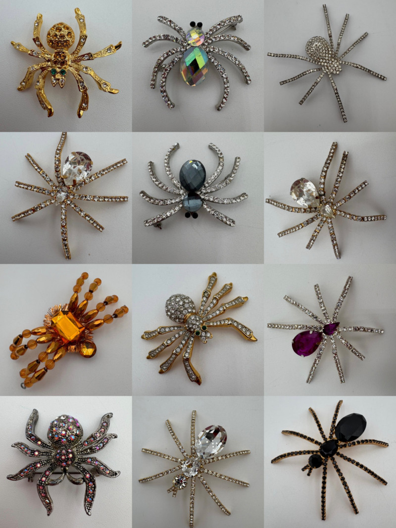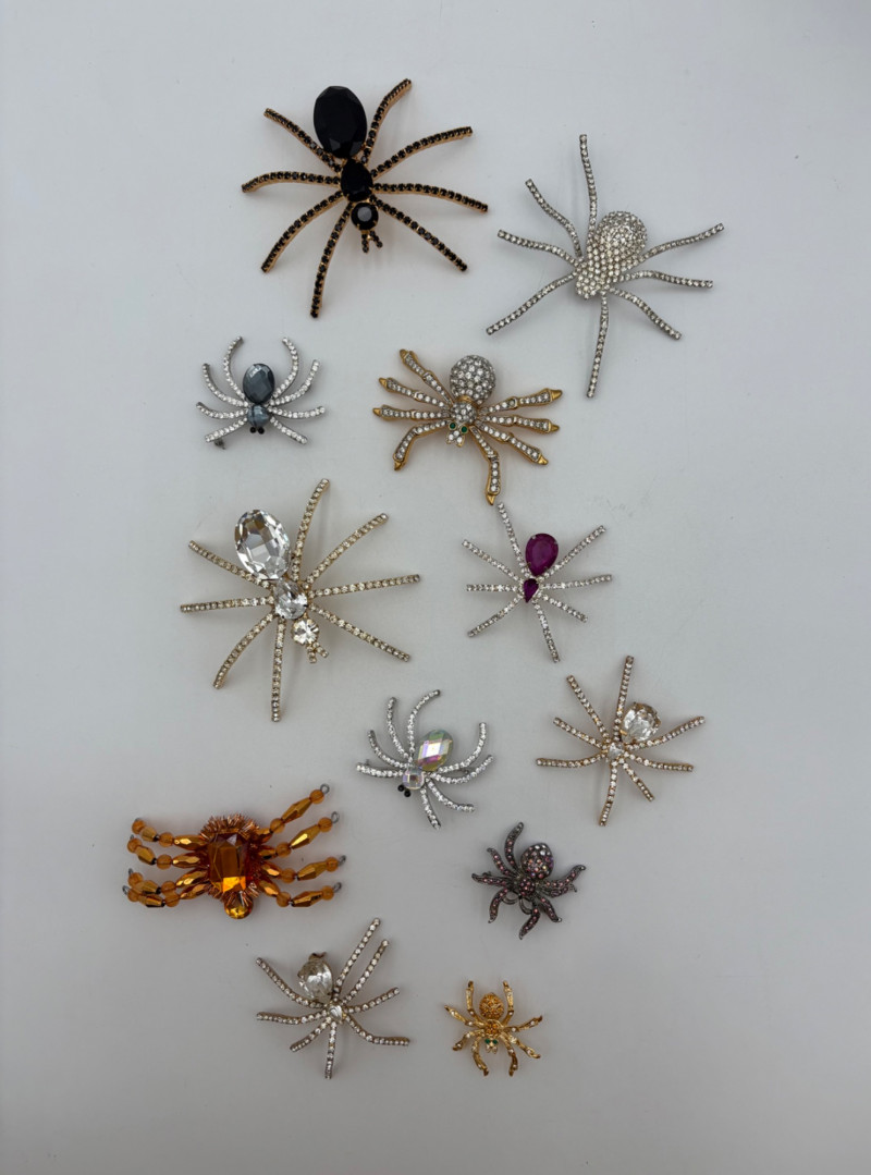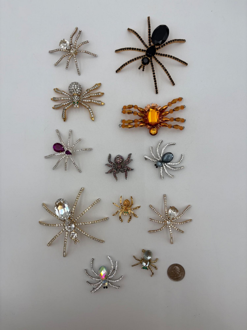 One dozen sparkly spiders to wear year-round (these aren't the scary Halloween kind, they are the nice "Charlotte's Web kind!). Most are vintage, but a few are newer. Please see photos - the largest ones are quite big; almost 4" L x 4" W!