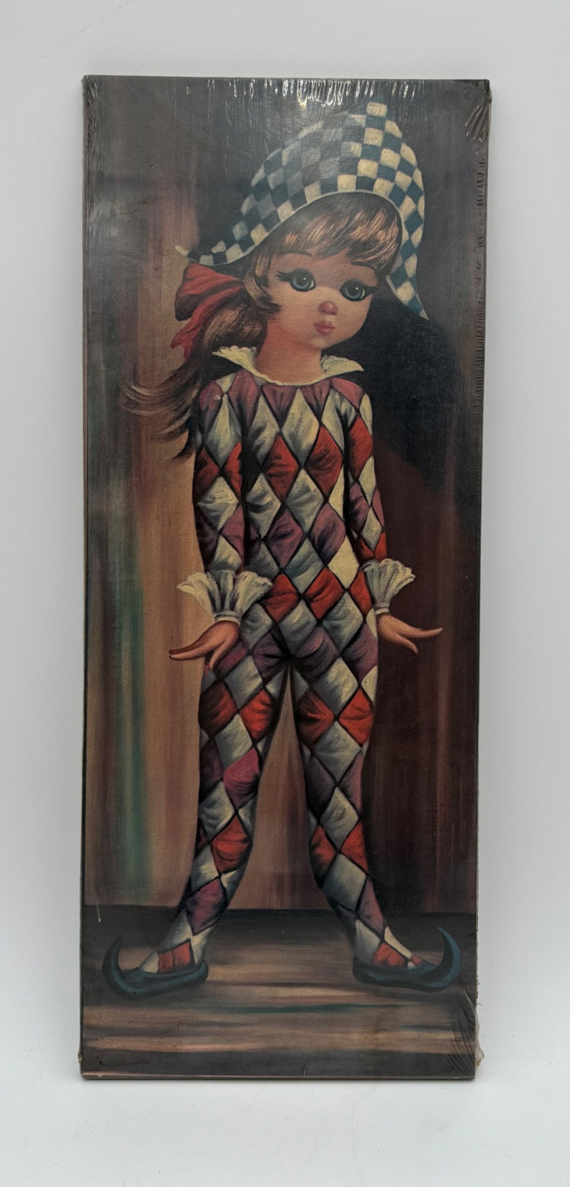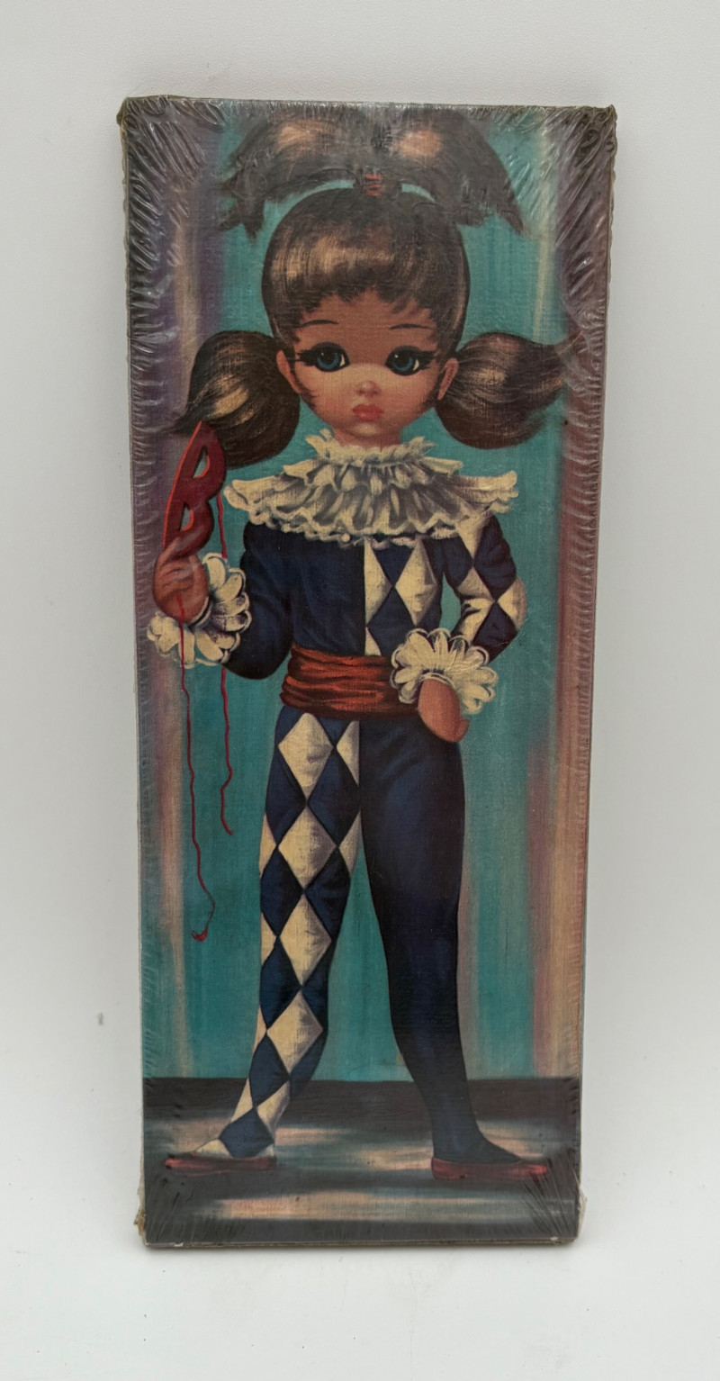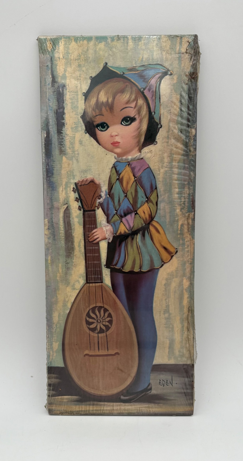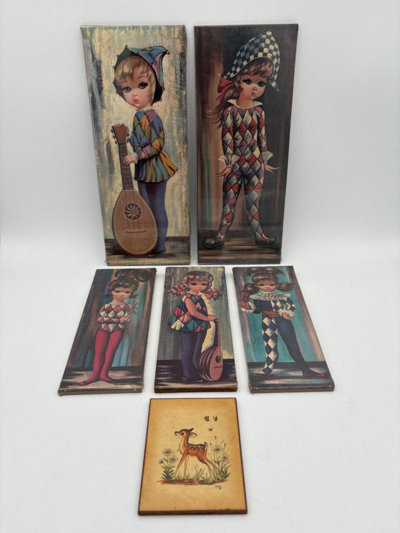 5 decorative wall panels with lithos of portraits by Eden (see the tag in the photos for who this person is - one of us was an art history major in college and has never heard of this supposedly famous artist - guess we learn something everyday....) Lithos were done in the USA by Soroka Sales in the mid-1960s. 4 of the 5 panels are still in the original shrinkwrap - our client hung them in the plastic on the wall for many years so the plastic may be dirty, but not the print underneath. The new owner will probably want to remove this covering - they show a lot better without the plastic glare. The two large panels measure 15" H x 6" W, while the 3 smaller panels measure 10" H x 4" W. The little deer we threw in because it felt like the same vibe as the harlequins! It's on wood and measures 5" H x 4" W. In case you are interested in this artist: https://www.etsy.com/market/eden_moppet_series