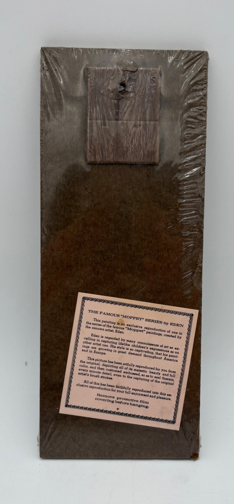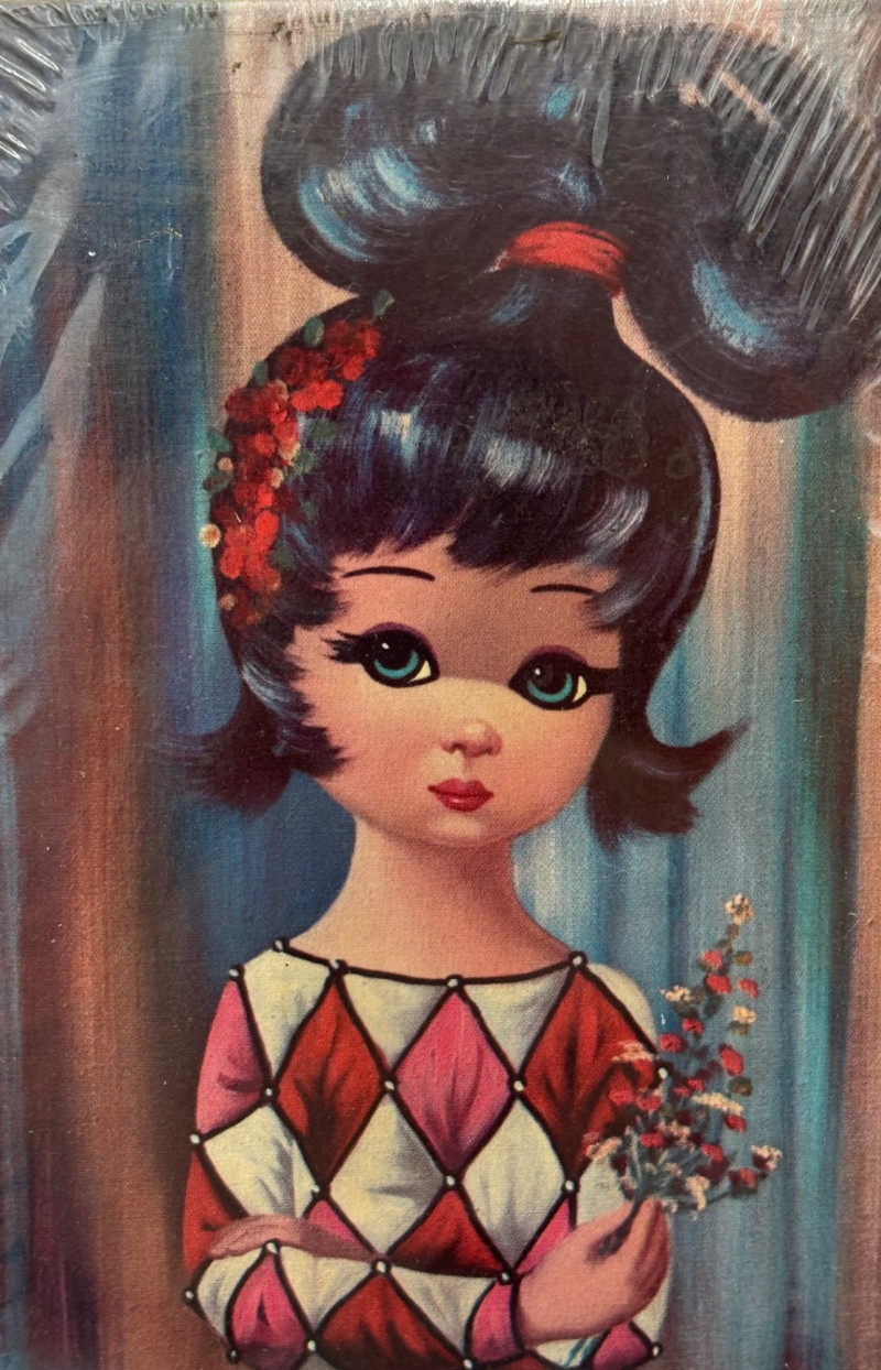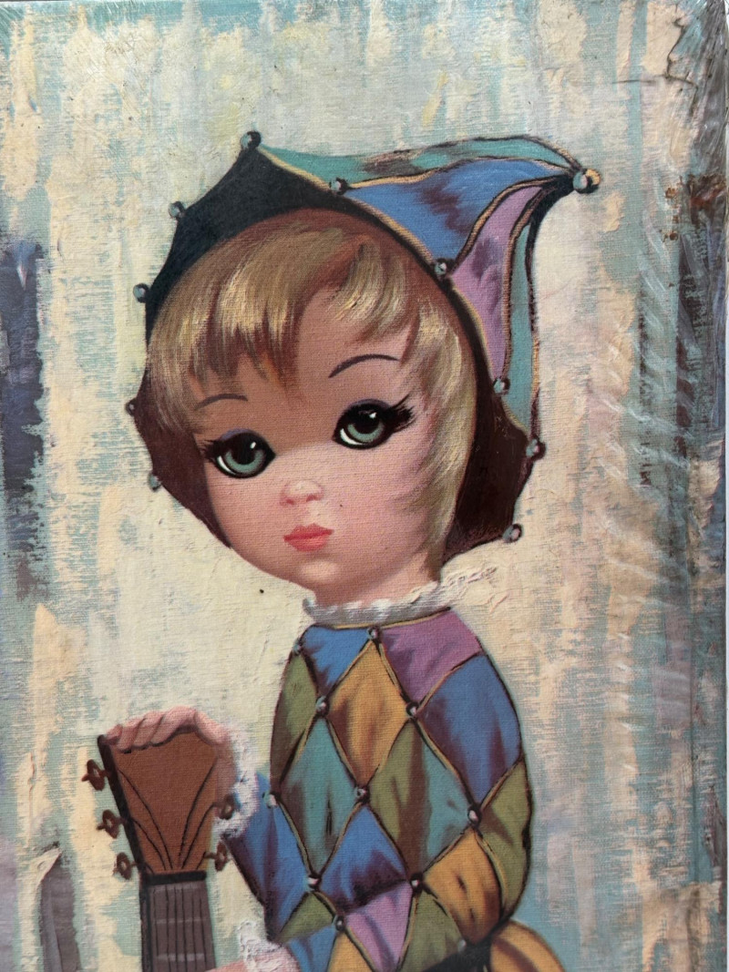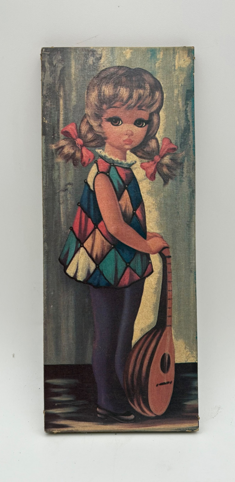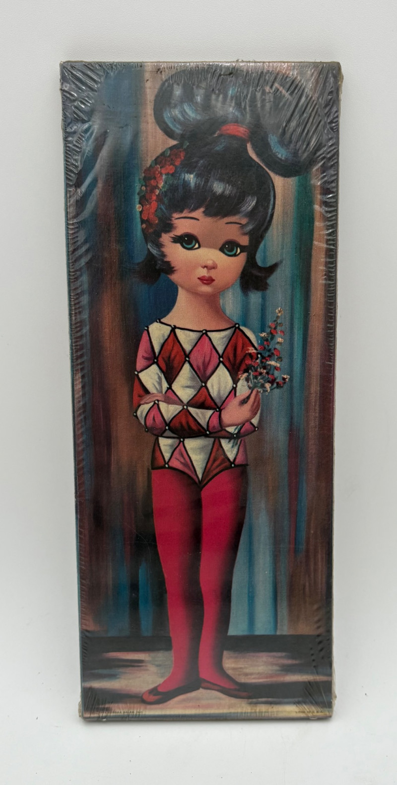 5 decorative wall panels with lithos of portraits by Eden (see the tag in the photos for who this person is - one of us was an art history major in college and has never heard of this supposedly famous artist - guess we learn something everyday....) Lithos were done in the USA by Soroka Sales in the mid-1960s. 4 of the 5 panels are still in the original shrinkwrap - our client hung them in the plastic on the wall for many years so the plastic may be dirty, but not the print underneath. The new owner will probably want to remove this covering - they show a lot better without the plastic glare. The two large panels measure 15" H x 6" W, while the 3 smaller panels measure 10" H x 4" W. The little deer we threw in because it felt like the same vibe as the harlequins! It's on wood and measures 5" H x 4" W. In case you are interested in this artist: https://www.etsy.com/market/eden_moppet_series