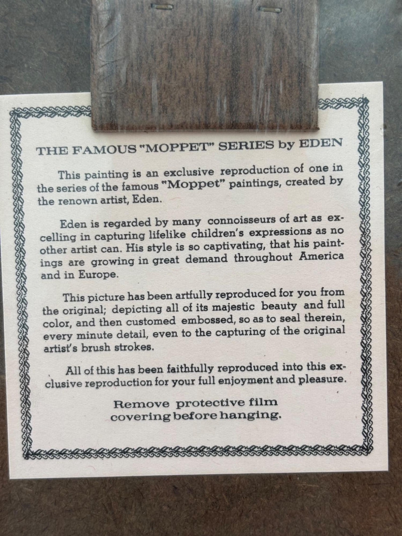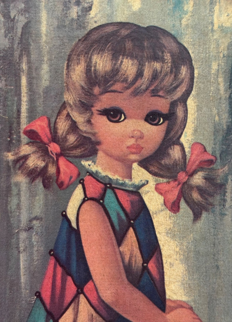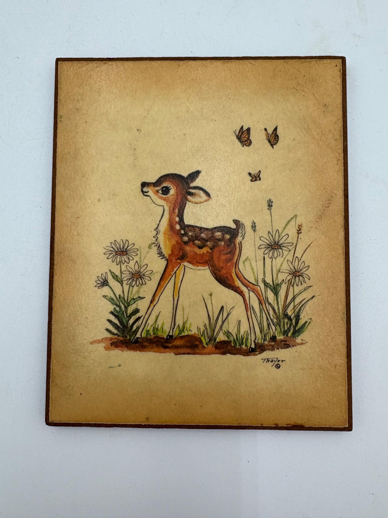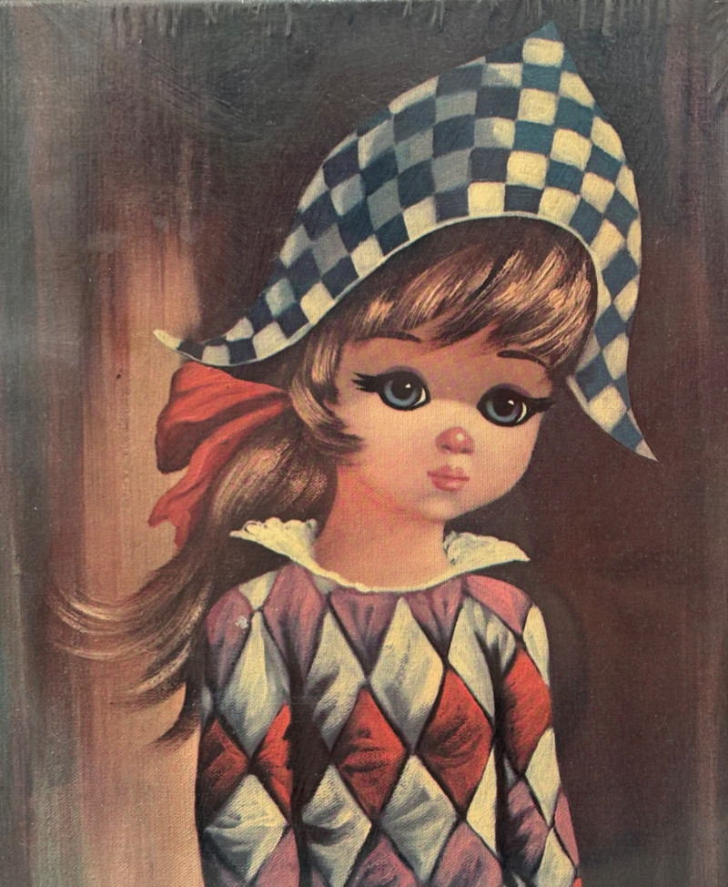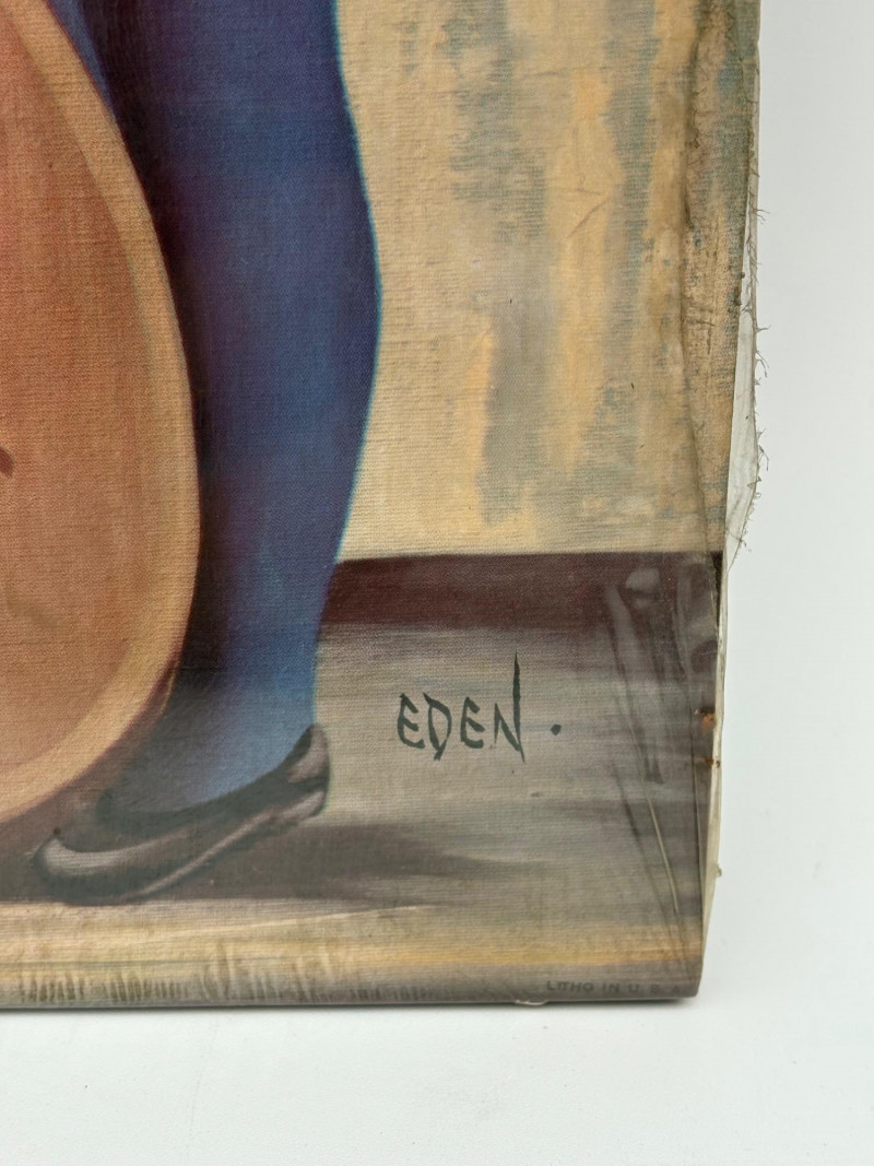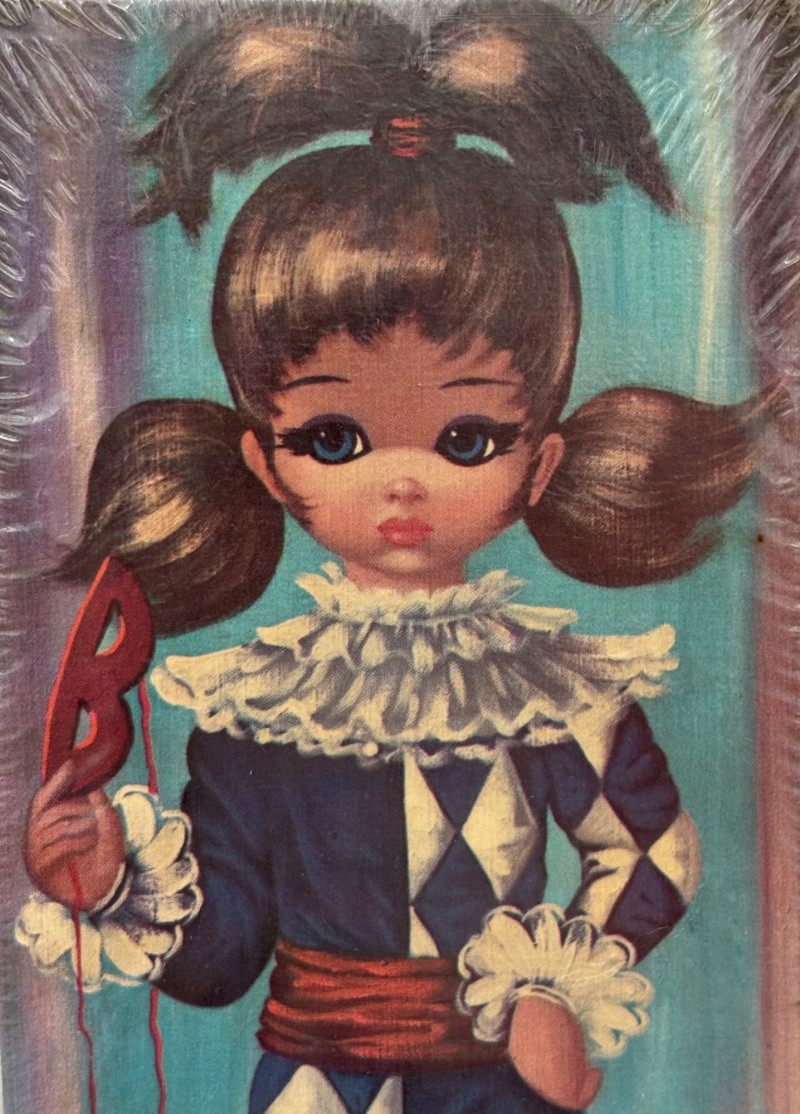 5 decorative wall panels with lithos of portraits by Eden (see the tag in the photos for who this person is - one of us was an art history major in college and has never heard of this supposedly famous artist - guess we learn something everyday....) Lithos were done in the USA by Soroka Sales in the mid-1960s. 4 of the 5 panels are still in the original shrinkwrap - our client hung them in the plastic on the wall for many years so the plastic may be dirty, but not the print underneath. The new owner will probably want to remove this covering - they show a lot better without the plastic glare. The two large panels measure 15" H x 6" W, while the 3 smaller panels measure 10" H x 4" W. The little deer we threw in because it felt like the same vibe as the harlequins! It's on wood and measures 5" H x 4" W. In case you are interested in this artist: https://www.etsy.com/market/eden_moppet_series