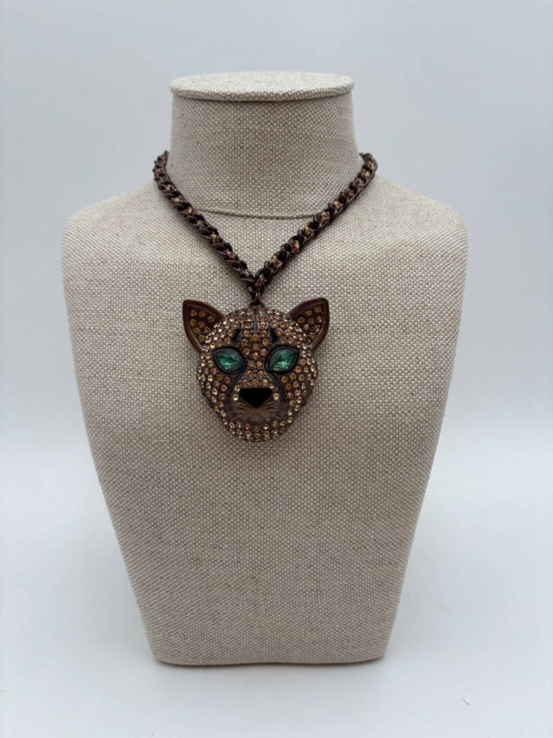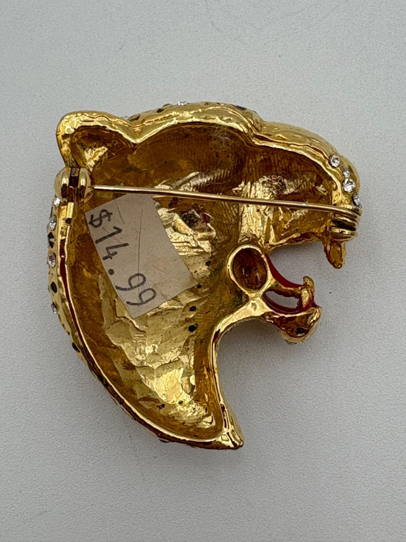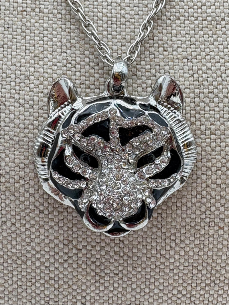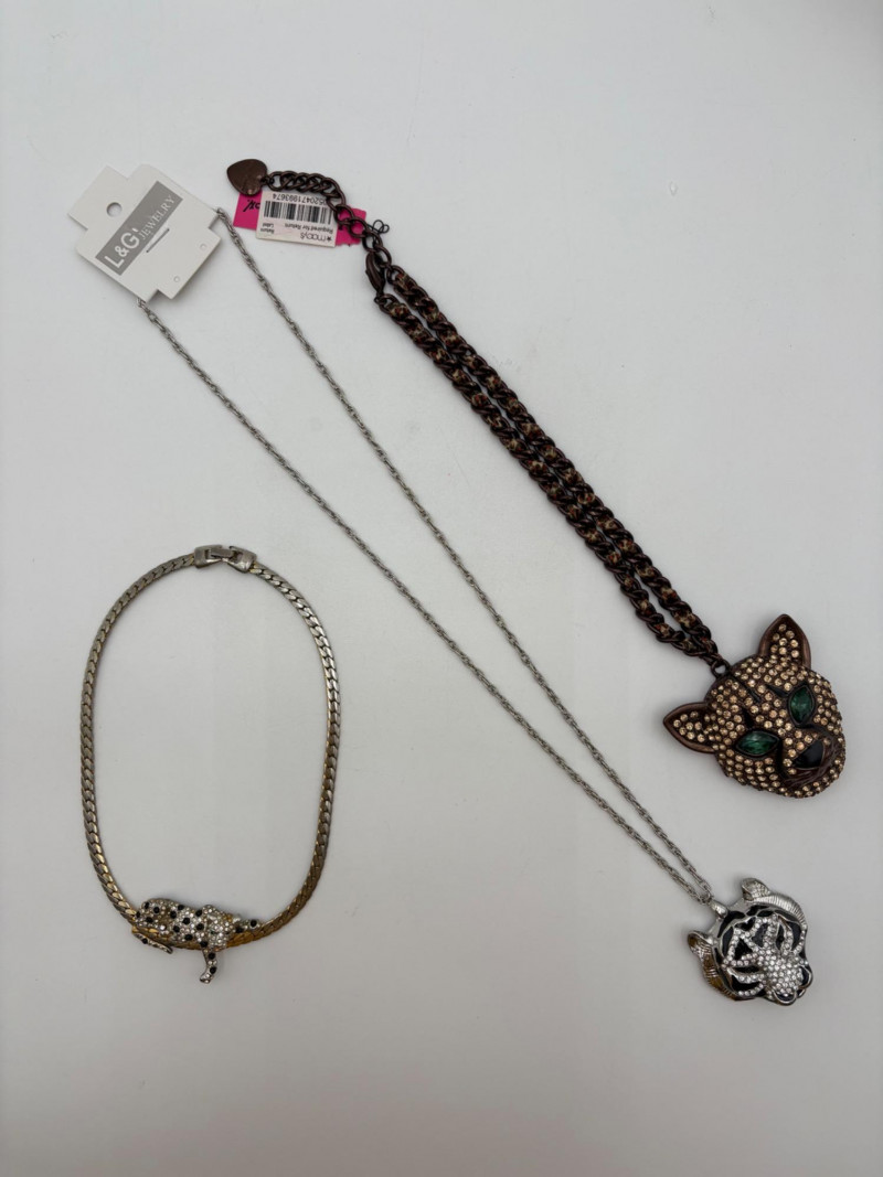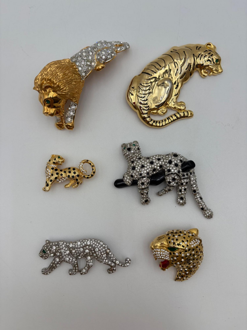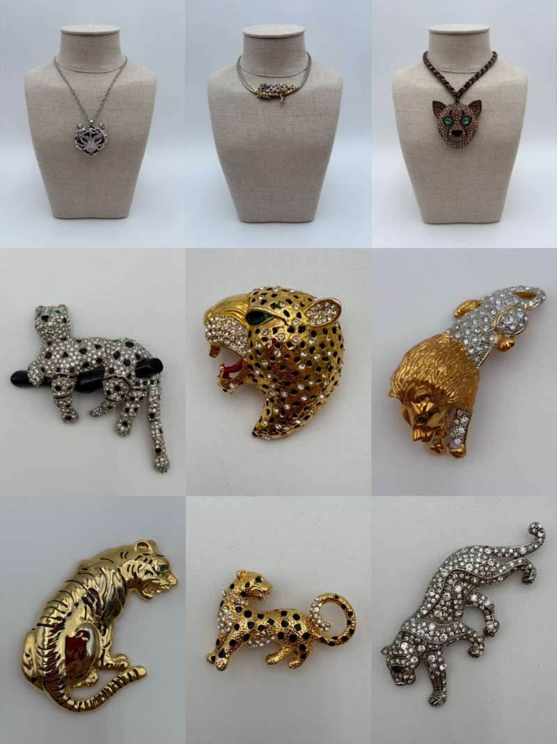 The focus of this lot is on big cats - lions, tigers, and their cousins. Lot includes 3 necklaces and 6 pins of varying age/maker. Most are high quality metal pieces. Please see photos for details - largest piece (gold tiger) measures 4" H while smallest piece (spotted leopard looking backward) measures 2" W.