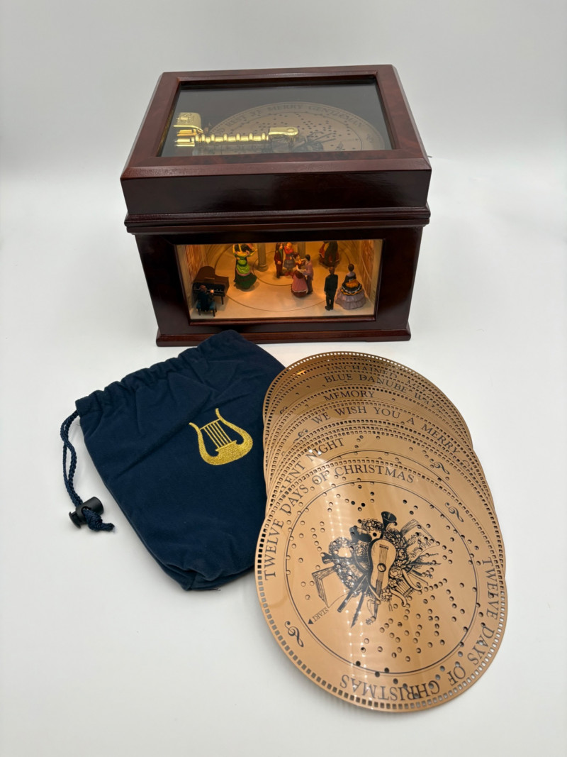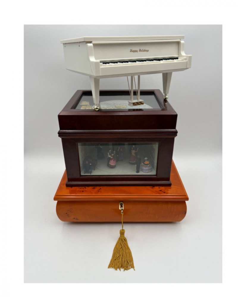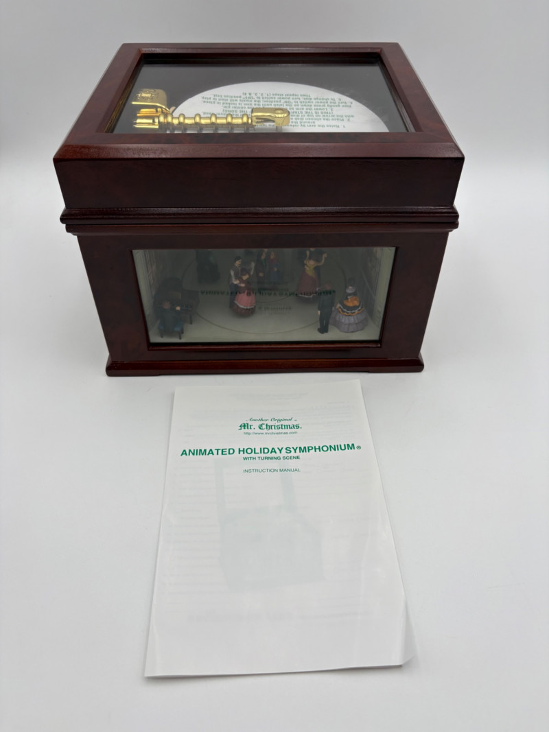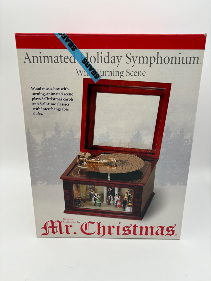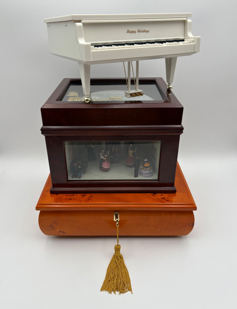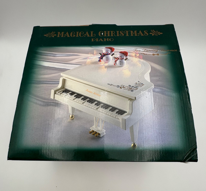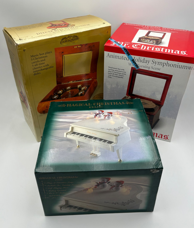 Trio of higher-end music boxes with a Christmas theme. All are in excellent condition* and work beautifully (they appear to have been used once or twice at the most). - Aminated Holiday Symphonium from Mr. Christmas in dark wood with dancers in the lower section & turntable on top. Dancers light up and move as music plays from the turntable. Includes adaptor and 8 Christmas discs along with 8 more classic discs. Measures 7.5" H x 10.5" W x 9" D. From 2002. - Deluxe Bell Symphonium in burlwood from Gold Label Collection. Runs on included adaptor and has locking key with tassel. There are 10 metal player discs - 5 Christmas-themed and 5 classics (you can order additional disks of other genres). Measures 4" H x 12.5" W x 10.5" D. From 2002. - Musical Christmas Piano in white comes with 2 dancing snowmen (they are magnetic) who whirl around on the top of the piano while music plays. Made of plastic; open the keyboard & the music plays. Close to turn off. Runs on 2 "C" batteries. Measures 5.5" H x 9" W x 10" L. *Note that the boxes on all show storage wear.