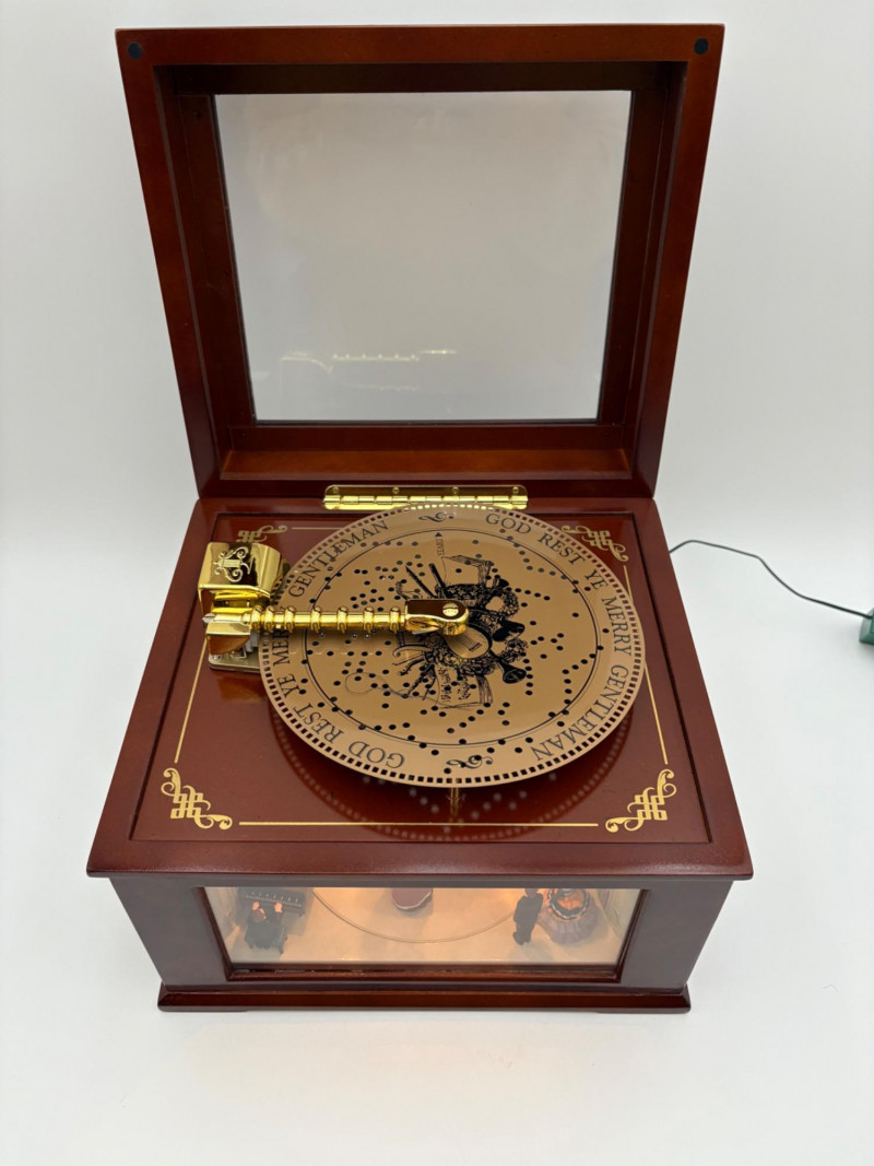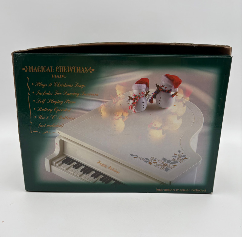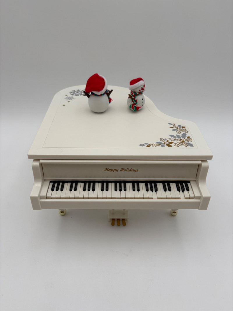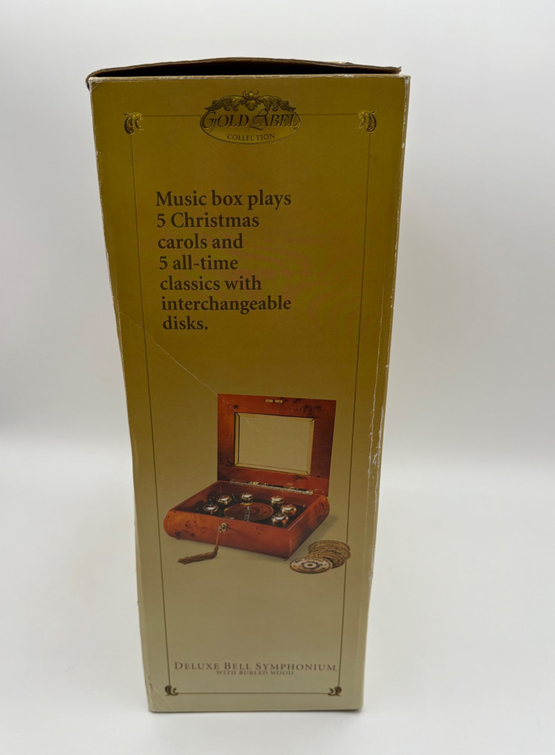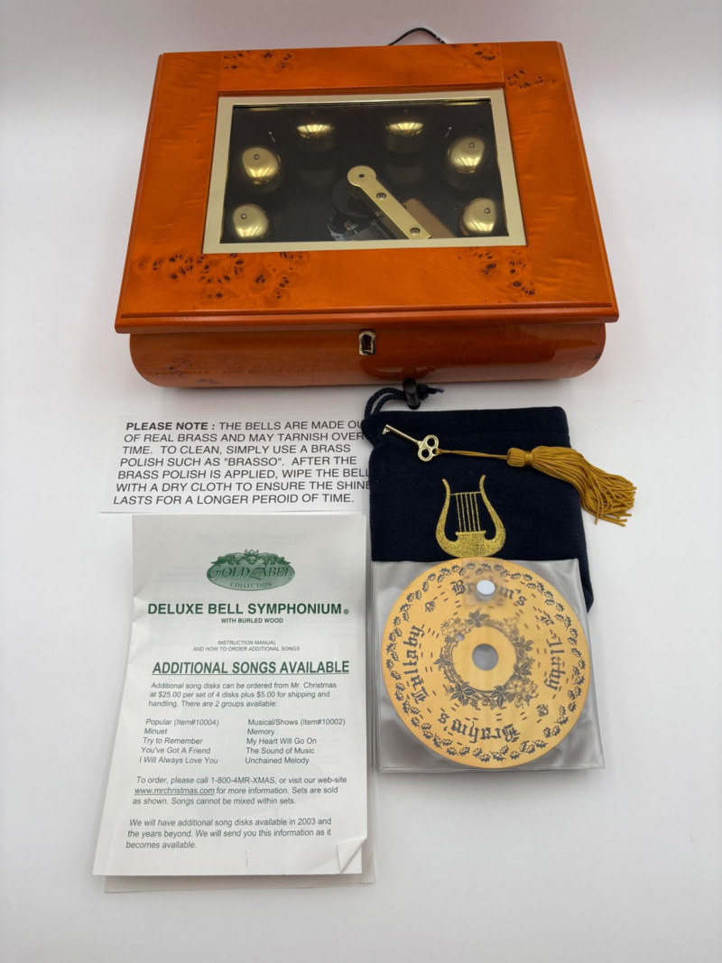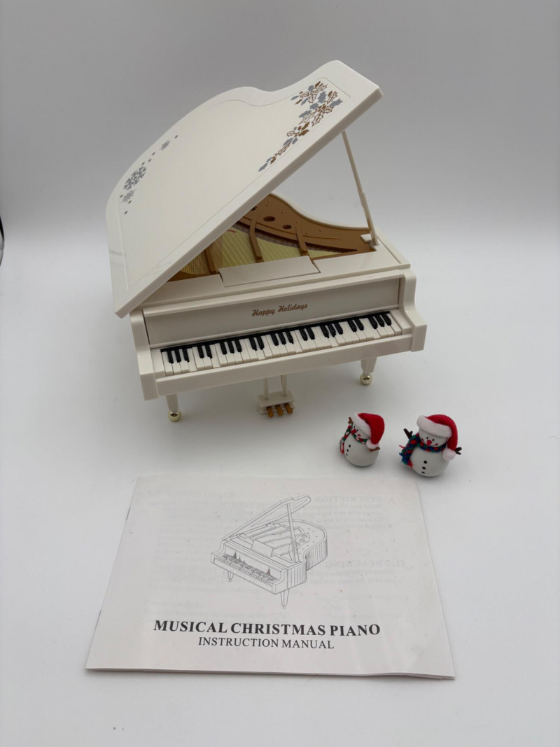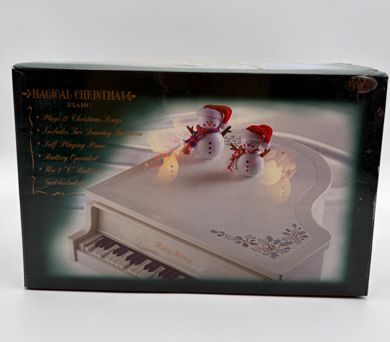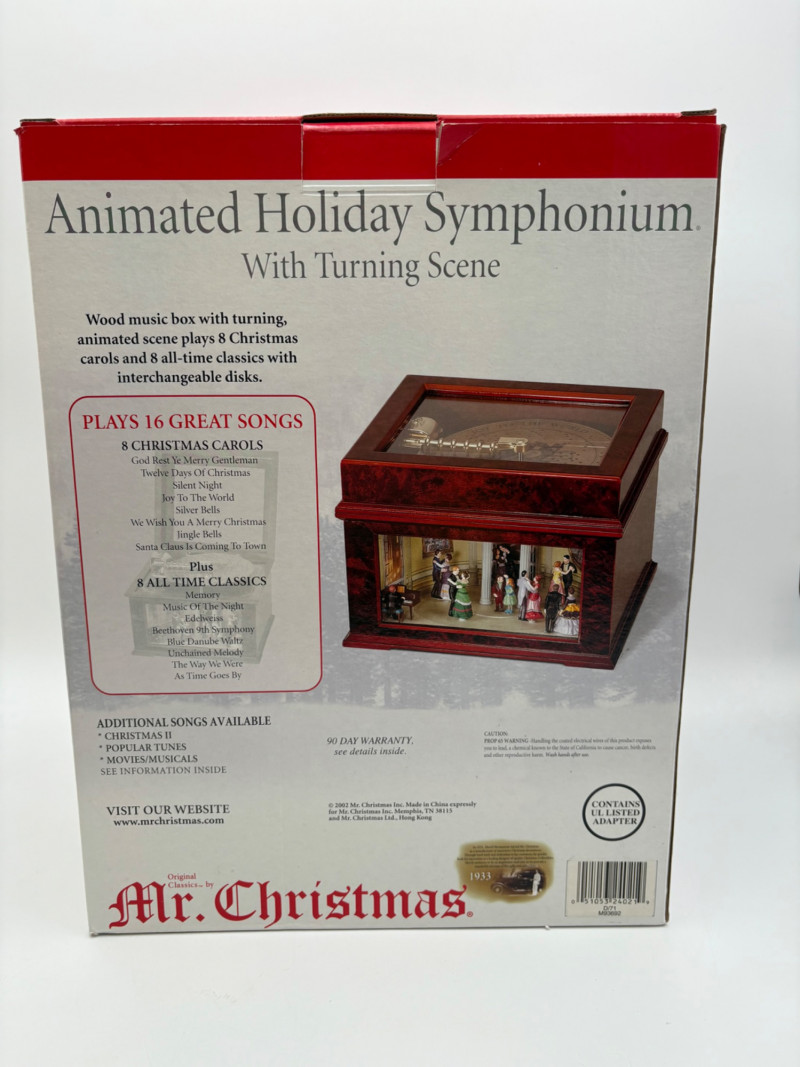 Trio of higher-end music boxes with a Christmas theme. All are in excellent condition* and work beautifully (they appear to have been used once or twice at the most). - Aminated Holiday Symphonium from Mr. Christmas in dark wood with dancers in the lower section & turntable on top. Dancers light up and move as music plays from the turntable. Includes adaptor and 8 Christmas discs along with 8 more classic discs. Measures 7.5" H x 10.5" W x 9" D. From 2002. - Deluxe Bell Symphonium in burlwood from Gold Label Collection. Runs on included adaptor and has locking key with tassel. There are 10 metal player discs - 5 Christmas-themed and 5 classics (you can order additional disks of other genres). Measures 4" H x 12.5" W x 10.5" D. From 2002. - Musical Christmas Piano in white comes with 2 dancing snowmen (they are magnetic) who whirl around on the top of the piano while music plays. Made of plastic; open the keyboard & the music plays. Close to turn off. Runs on 2 "C" batteries. Measures 5.5" H x 9" W x 10" L. *Note that the boxes on all show storage wear.