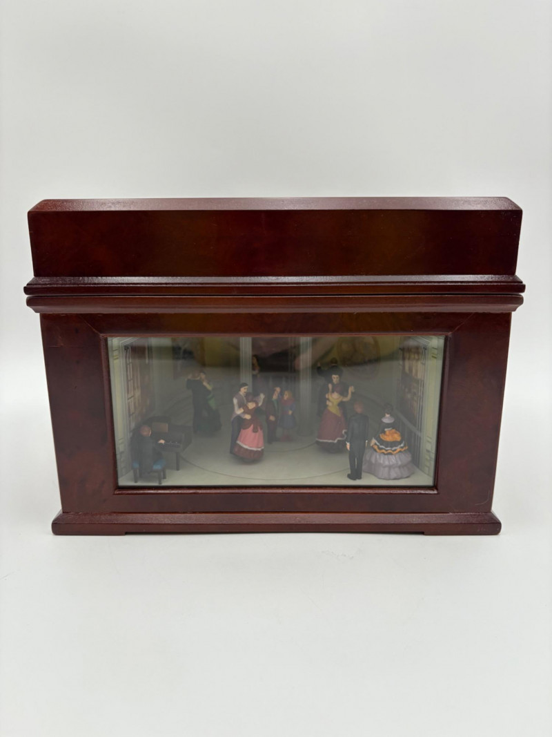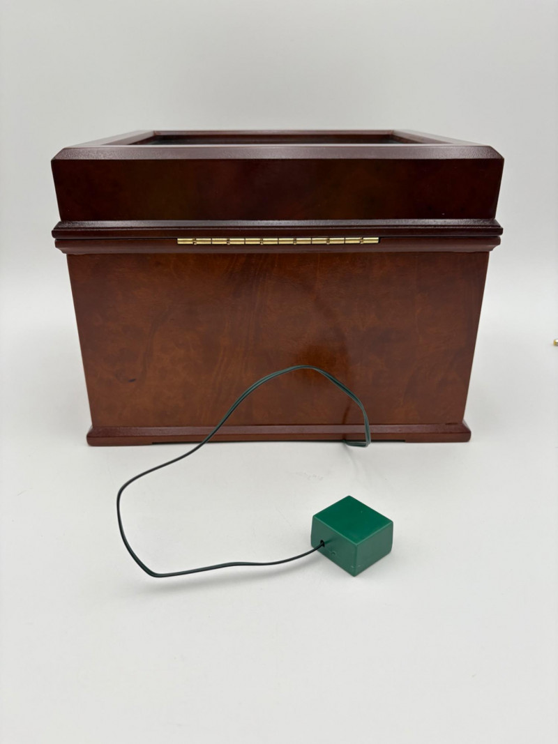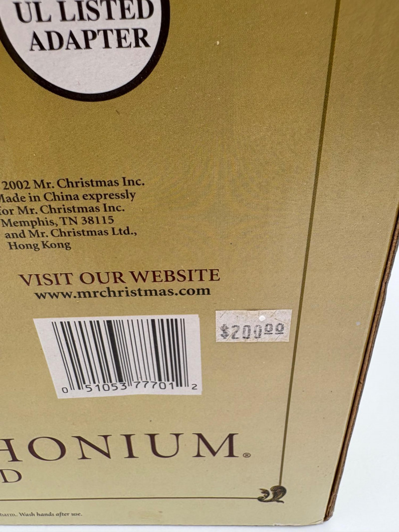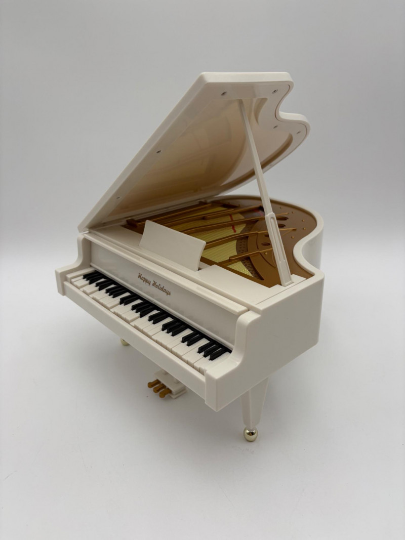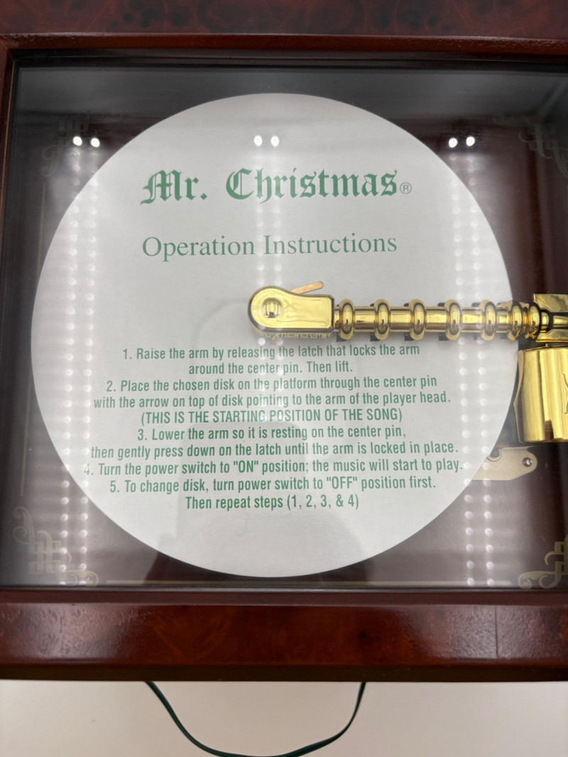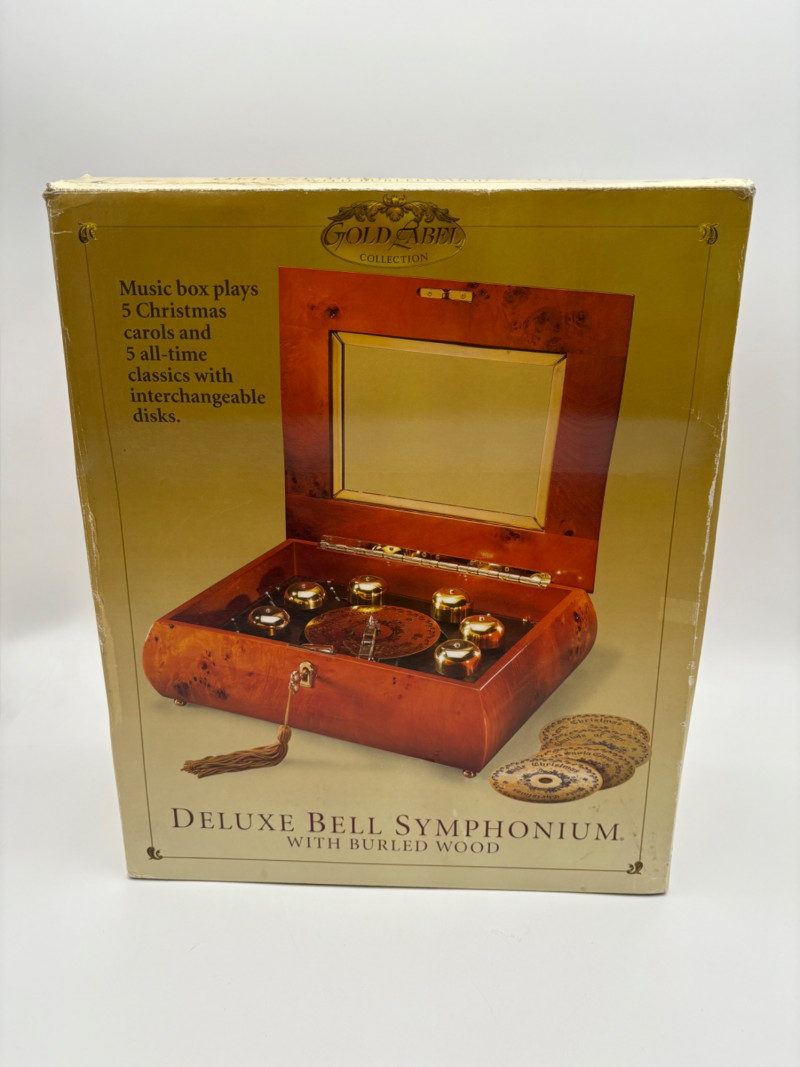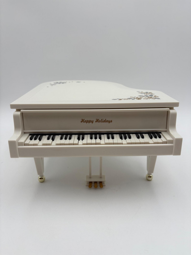 Trio of higher-end music boxes with a Christmas theme. All are in excellent condition* and work beautifully (they appear to have been used once or twice at the most). - Aminated Holiday Symphonium from Mr. Christmas in dark wood with dancers in the lower section & turntable on top. Dancers light up and move as music plays from the turntable. Includes adaptor and 8 Christmas discs along with 8 more classic discs. Measures 7.5" H x 10.5" W x 9" D. From 2002. - Deluxe Bell Symphonium in burlwood from Gold Label Collection. Runs on included adaptor and has locking key with tassel. There are 10 metal player discs - 5 Christmas-themed and 5 classics (you can order additional disks of other genres). Measures 4" H x 12.5" W x 10.5" D. From 2002. - Musical Christmas Piano in white comes with 2 dancing snowmen (they are magnetic) who whirl around on the top of the piano while music plays. Made of plastic; open the keyboard & the music plays. Close to turn off. Runs on 2 "C" batteries. Measures 5.5" H x 9" W x 10" L. *Note that the boxes on all show storage wear.