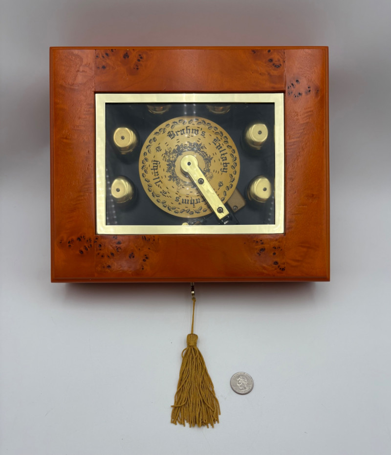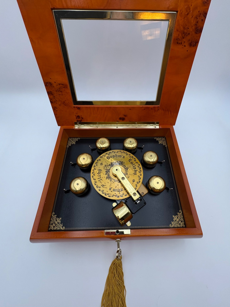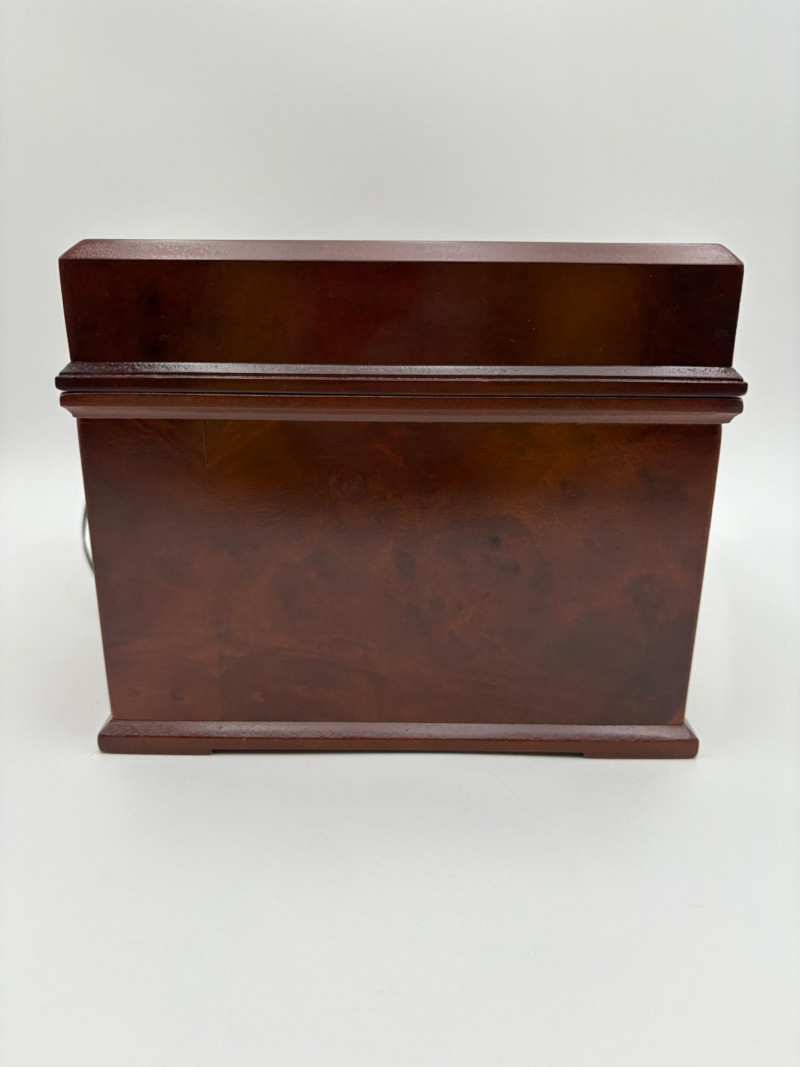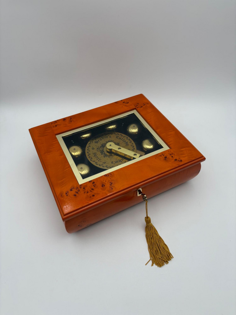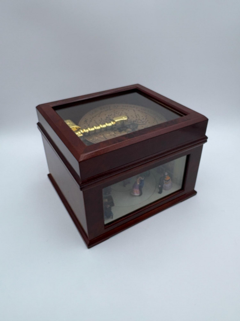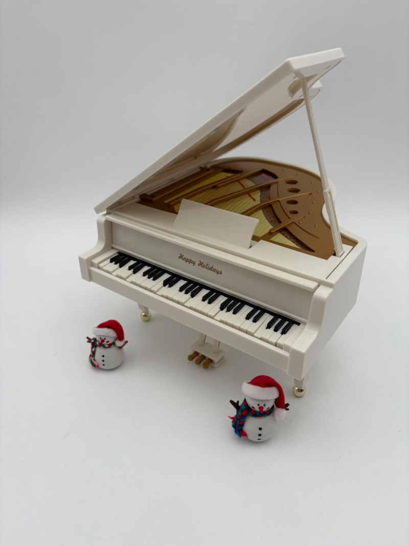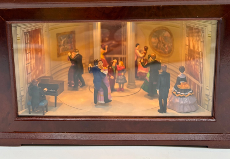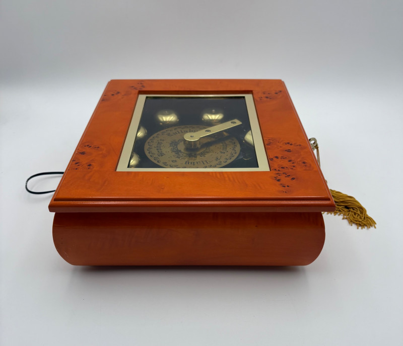 Trio of higher-end music boxes with a Christmas theme. All are in excellent condition* and work beautifully (they appear to have been used once or twice at the most). - Aminated Holiday Symphonium from Mr. Christmas in dark wood with dancers in the lower section & turntable on top. Dancers light up and move as music plays from the turntable. Includes adaptor and 8 Christmas discs along with 8 more classic discs. Measures 7.5" H x 10.5" W x 9" D. From 2002. - Deluxe Bell Symphonium in burlwood from Gold Label Collection. Runs on included adaptor and has locking key with tassel. There are 10 metal player discs - 5 Christmas-themed and 5 classics (you can order additional disks of other genres). Measures 4" H x 12.5" W x 10.5" D. From 2002. - Musical Christmas Piano in white comes with 2 dancing snowmen (they are magnetic) who whirl around on the top of the piano while music plays. Made of plastic; open the keyboard & the music plays. Close to turn off. Runs on 2 "C" batteries. Measures 5.5" H x 9" W x 10" L. *Note that the boxes on all show storage wear.