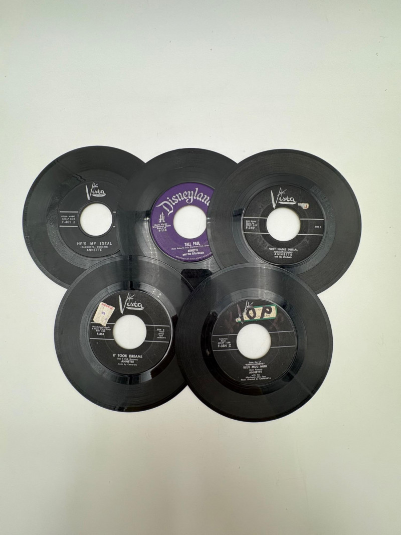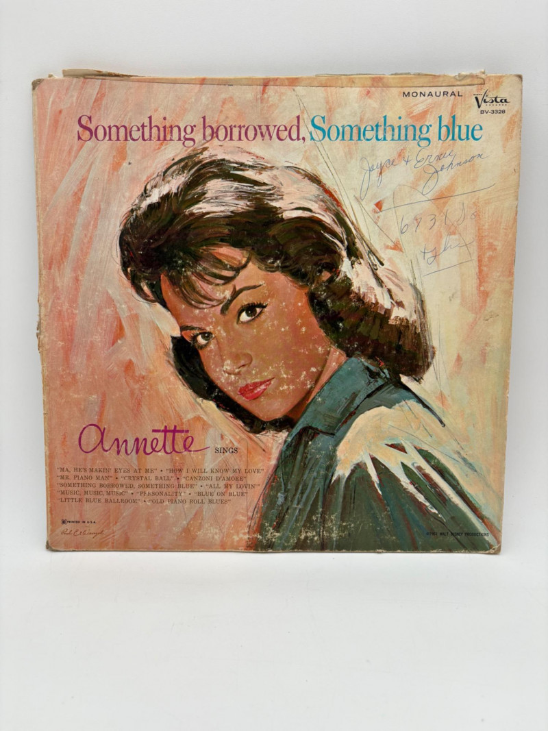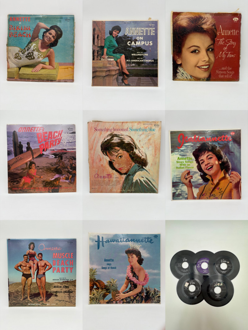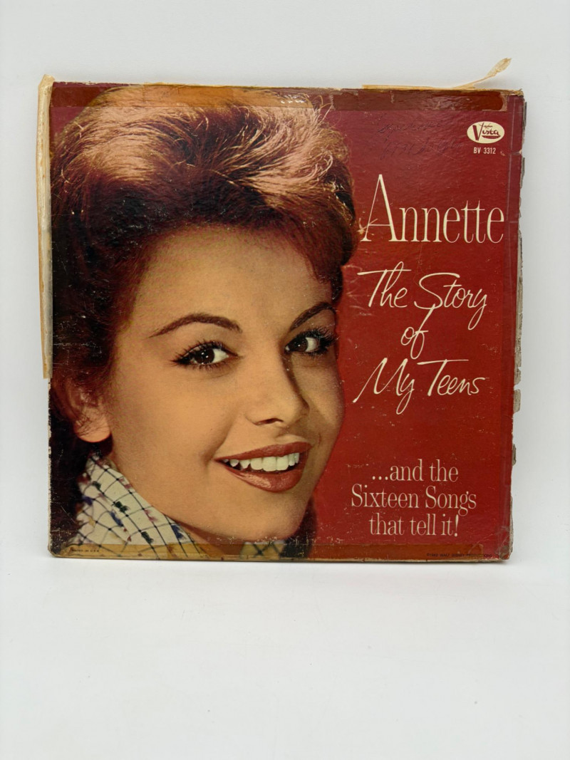 9 vintage LPs for your retro turntable! While our clients LOVED classic country music, Elvis, and popular music of the 1960s/1970s, they were also in love with Annette Funicello - former Mouseketeer best known for her beach movies like "Beach Blanket Bingo" with Frankie Avalon. This particular lot of records was loved a bit too much - the records look fine given a cursory glance, but many of the covers are in poor condition - check the photos to judge for youself.* All records in this lot are by Annette Funicello. ABLUM TITLES: Hawaiiannette Muscle Beach Party Italiannette Something Borrowed, Something Blue Annette’s Beach Party The Story of My Teens Annette on Campus Annette at Bikini Beach + 5 additional 45s by Annette *Please note that we checked to make sure the correct record was in the correct sleeve, but we did not test for condition.