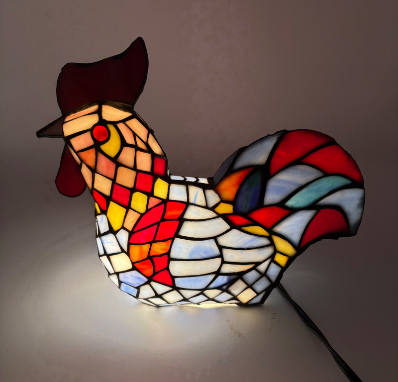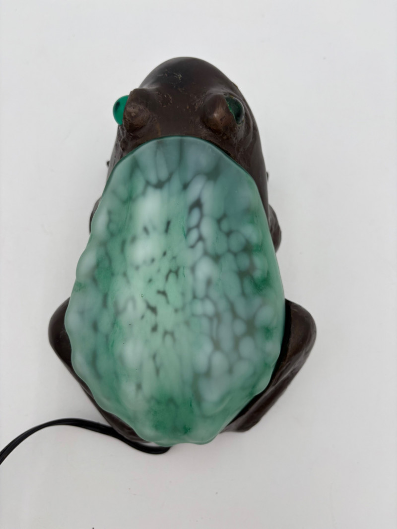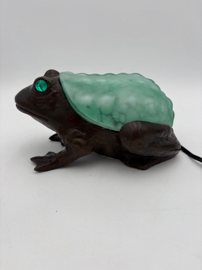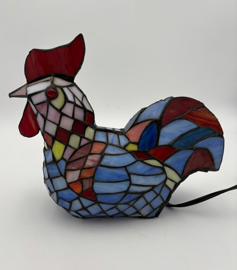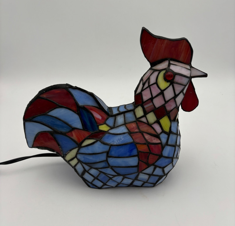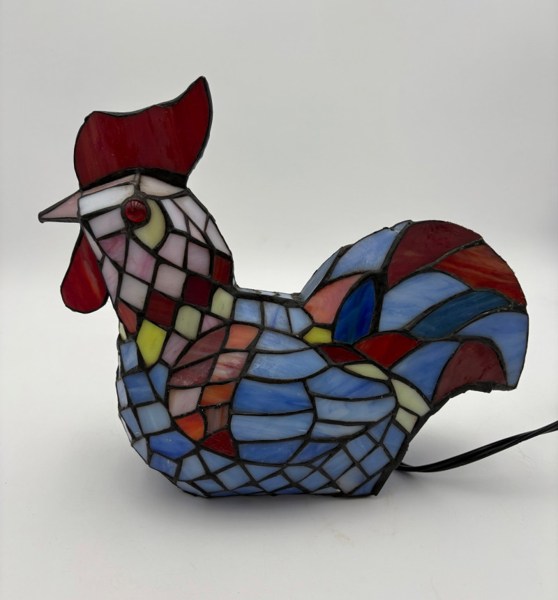 Fun lamp pair! Little frog lamp of cast metal (looks like bronze) with a translucent back in glass with a greenish tint. Heavy and very stable with 2-prong older plug and cord with rolling switch. Measures 4.5" H x 9" L x 6.5" W. Small gauge bulb inside with glass held on by tension clips. In very good vintage condition. Vintage lamp in the shape of a chicken in stained/leaded glass. In good condition with only on small flaw along the spine/start of the tail - see last photo. Has 2-prong plug with roller switch and uses a small low watt bulb. Measures 9.5" H x 12" L x 5" W.