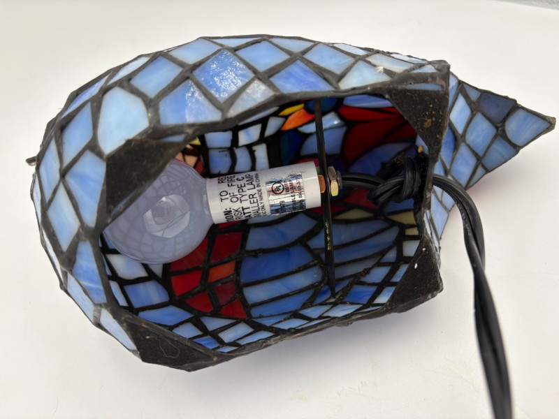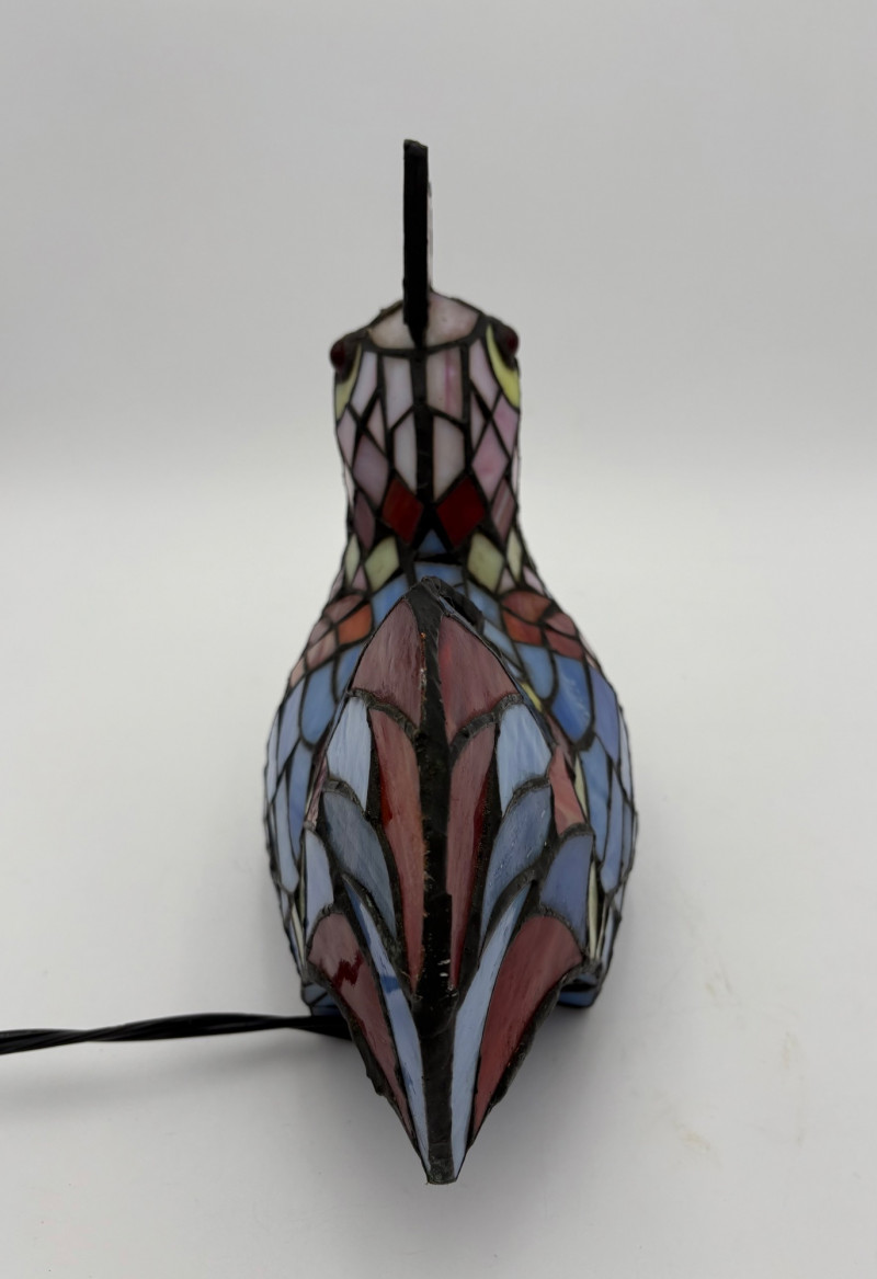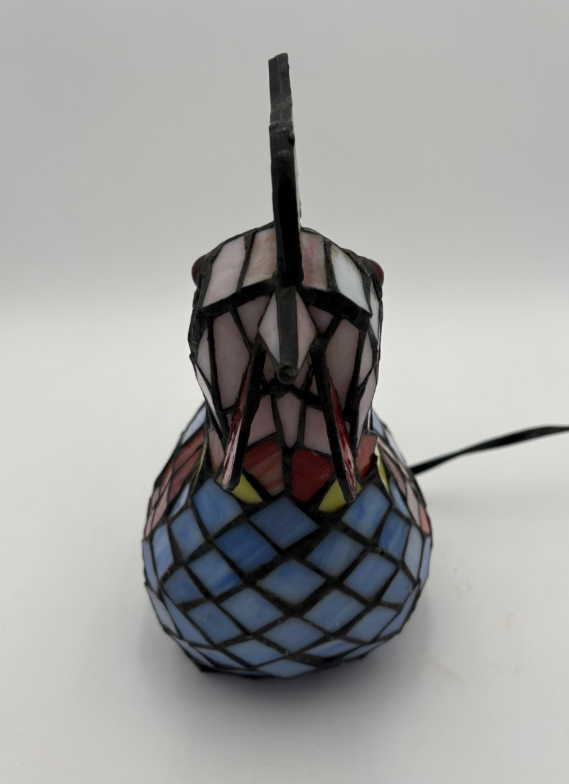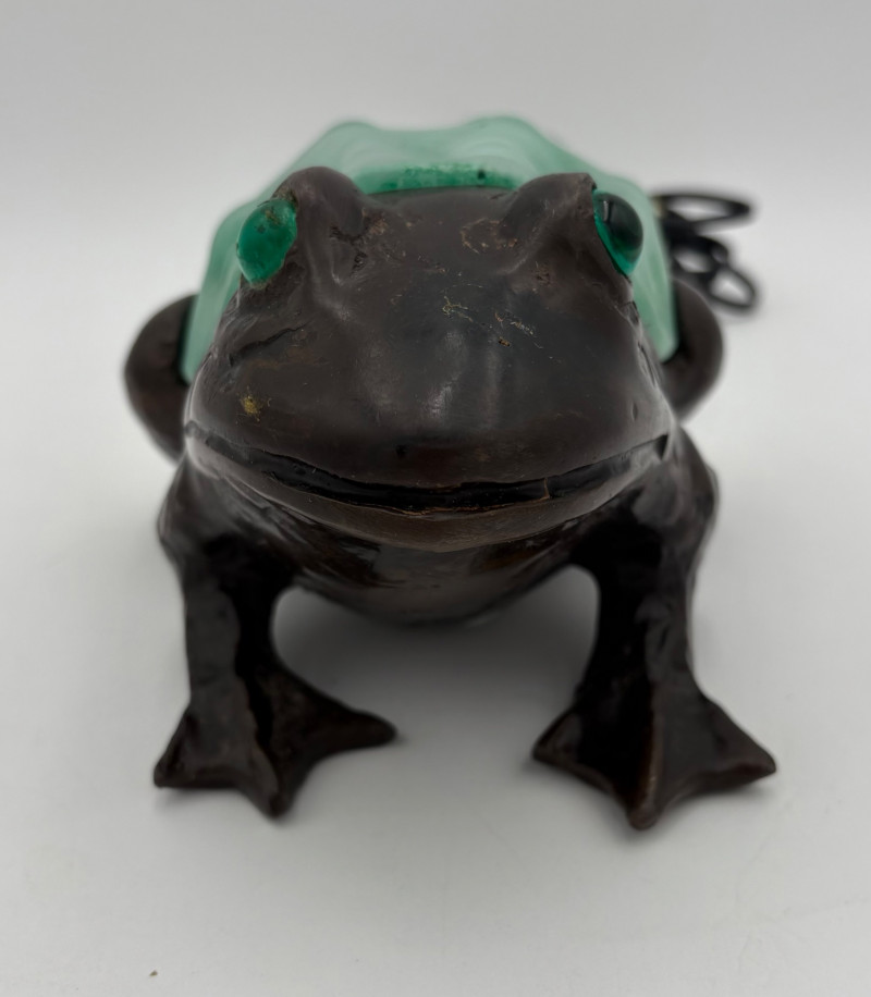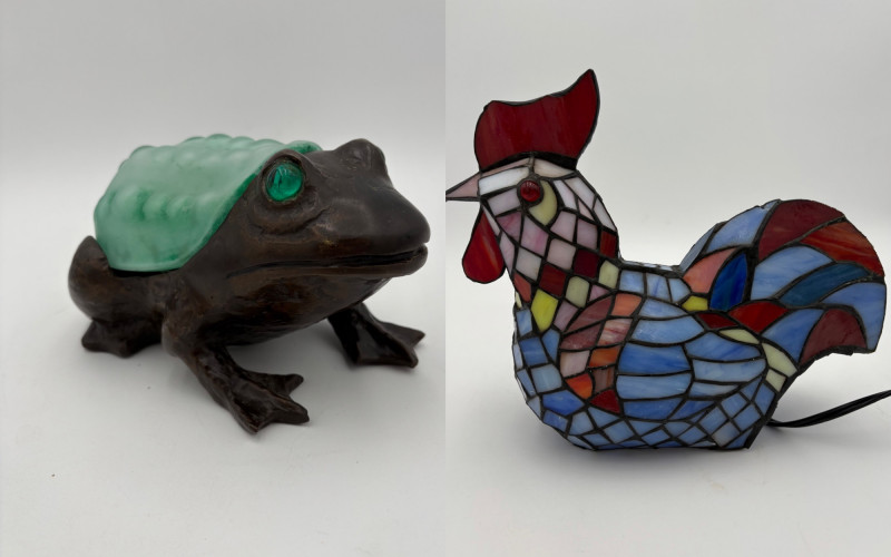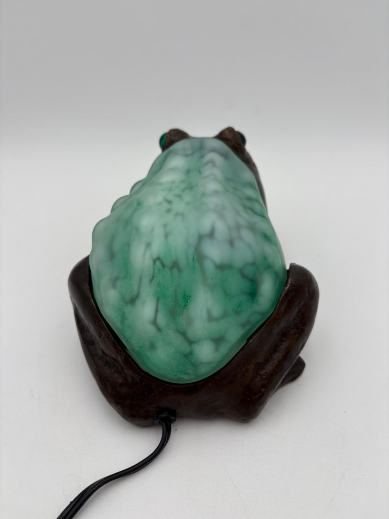 Fun lamp pair! Little frog lamp of cast metal (looks like bronze) with a translucent back in glass with a greenish tint. Heavy and very stable with 2-prong older plug and cord with rolling switch. Measures 4.5" H x 9" L x 6.5" W. Small gauge bulb inside with glass held on by tension clips. In very good vintage condition. Vintage lamp in the shape of a chicken in stained/leaded glass. In good condition with only on small flaw along the spine/start of the tail - see last photo. Has 2-prong plug with roller switch and uses a small low watt bulb. Measures 9.5" H x 12" L x 5" W.