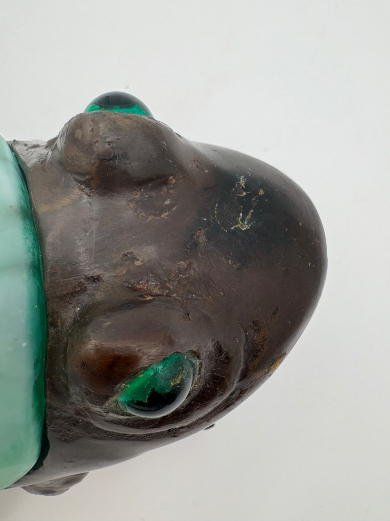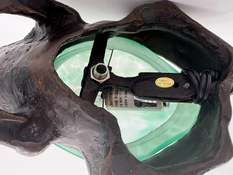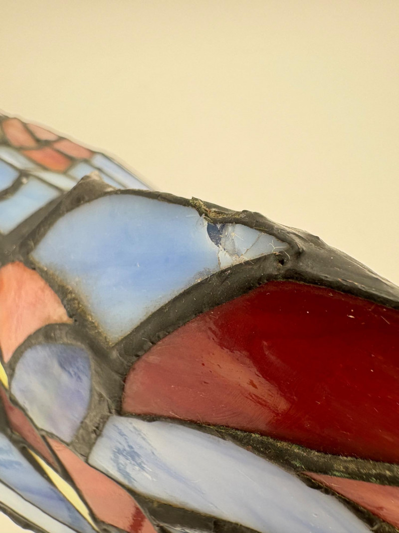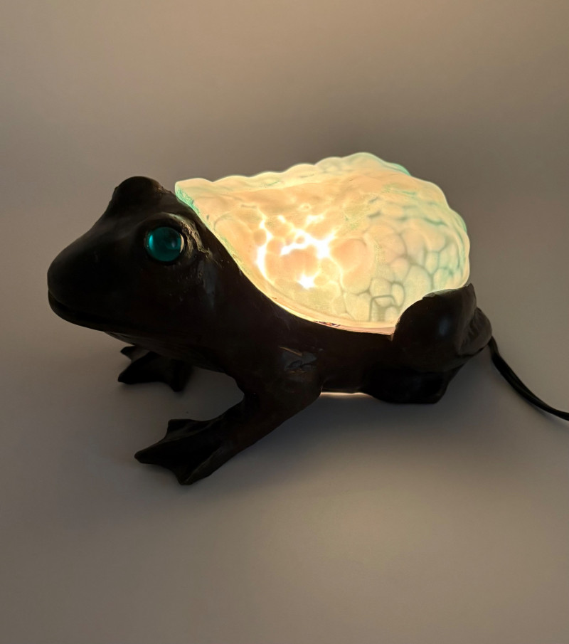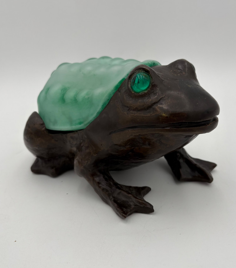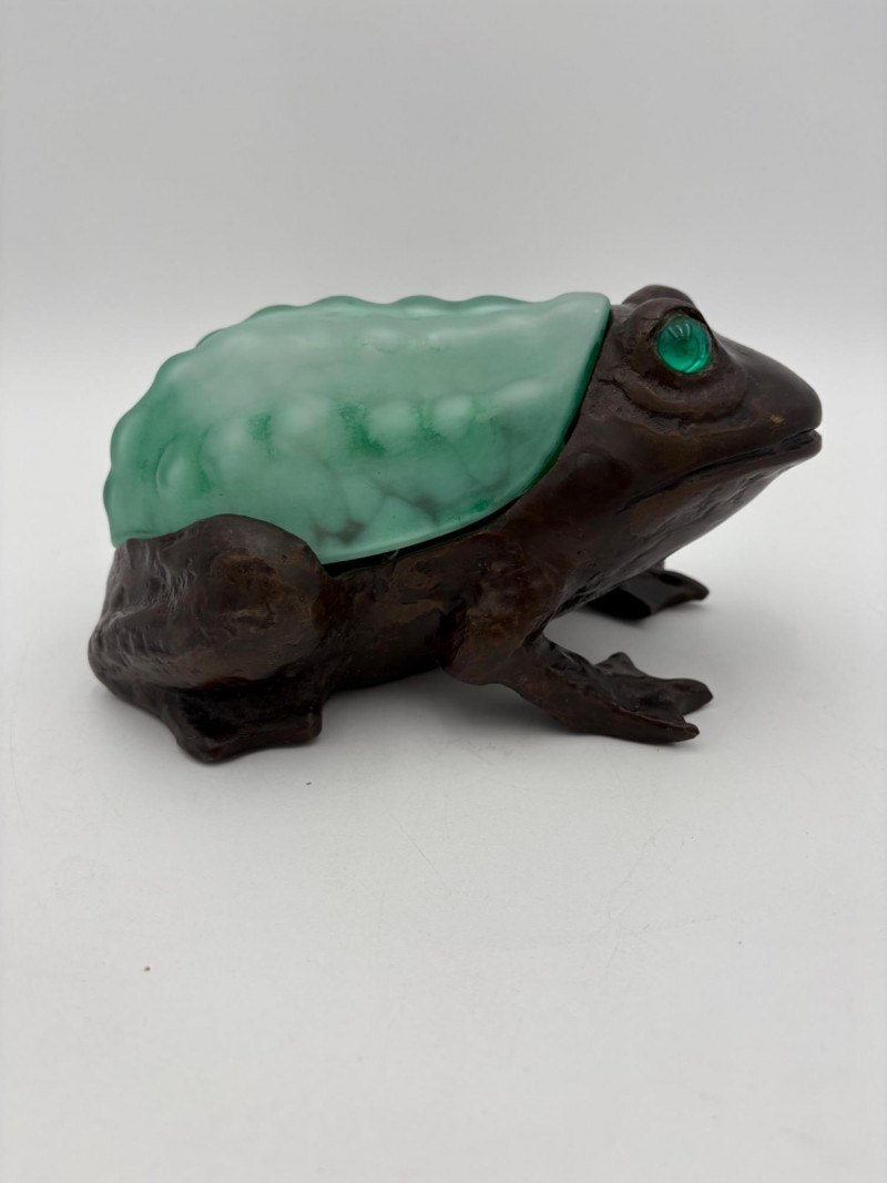 Fun lamp pair! Little frog lamp of cast metal (looks like bronze) with a translucent back in glass with a greenish tint. Heavy and very stable with 2-prong older plug and cord with rolling switch. Measures 4.5" H x 9" L x 6.5" W. Small gauge bulb inside with glass held on by tension clips. In very good vintage condition. Vintage lamp in the shape of a chicken in stained/leaded glass. In good condition with only on small flaw along the spine/start of the tail - see last photo. Has 2-prong plug with roller switch and uses a small low watt bulb. Measures 9.5" H x 12" L x 5" W.