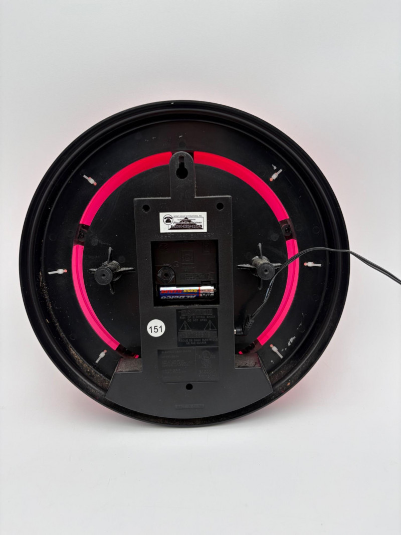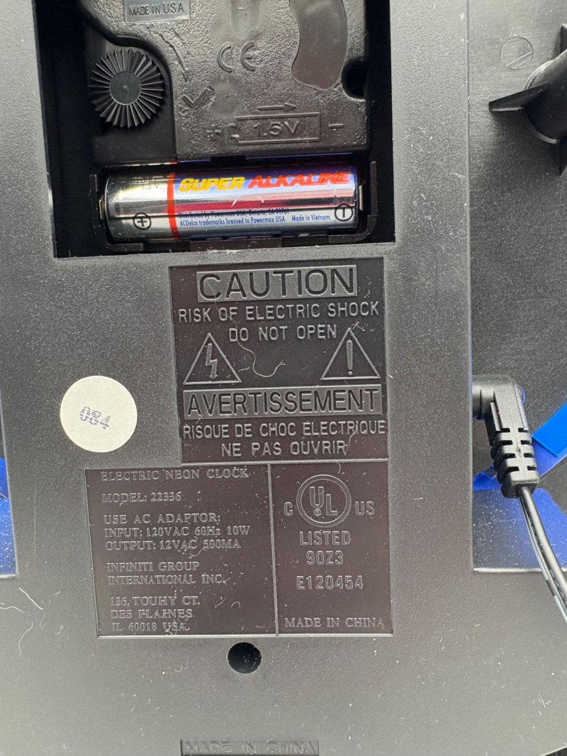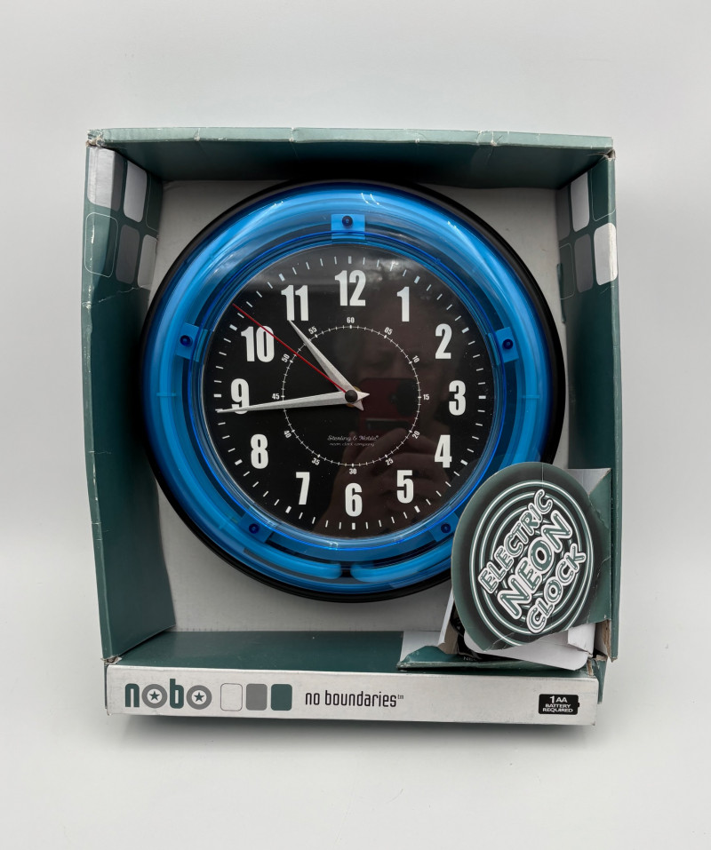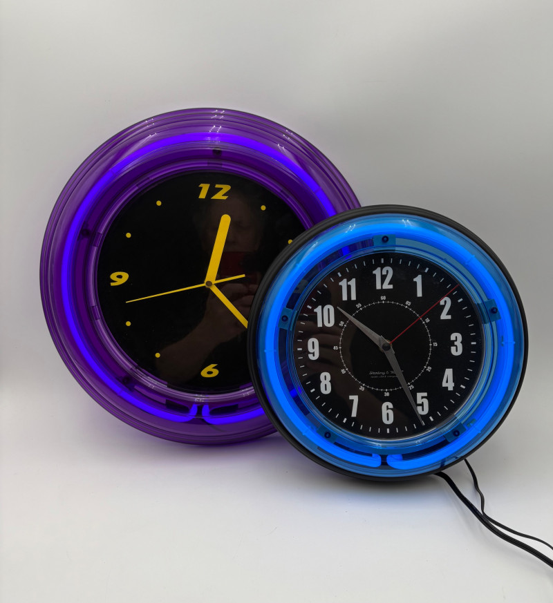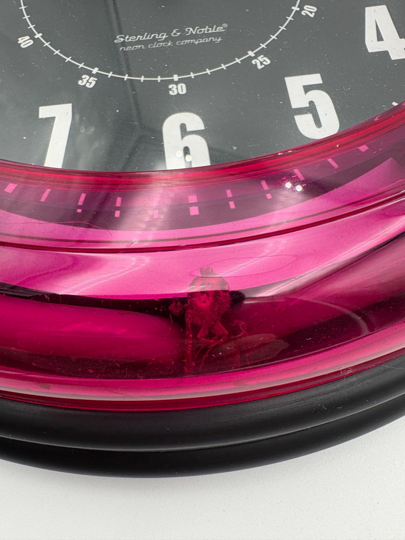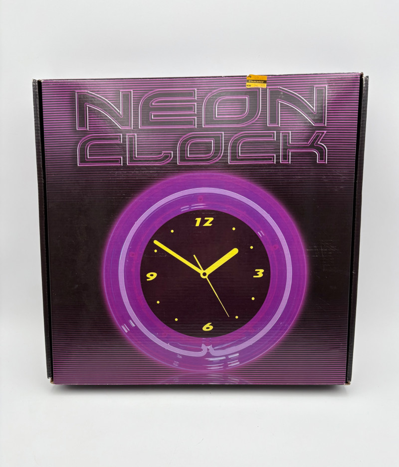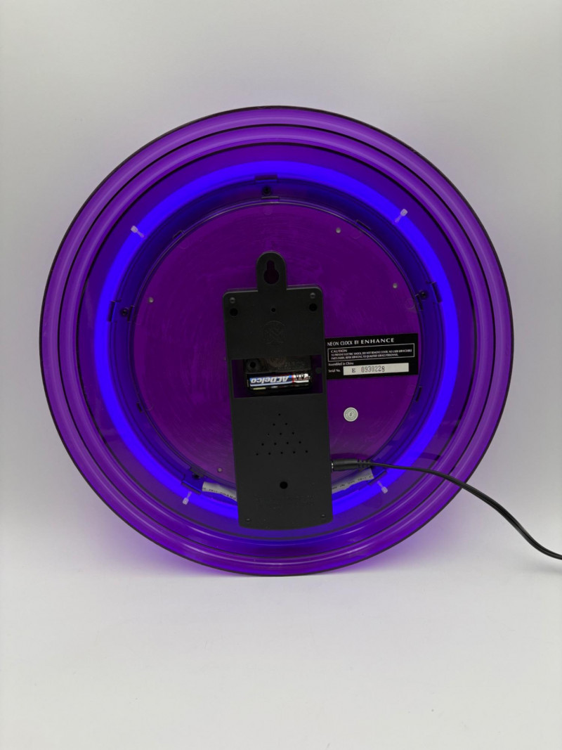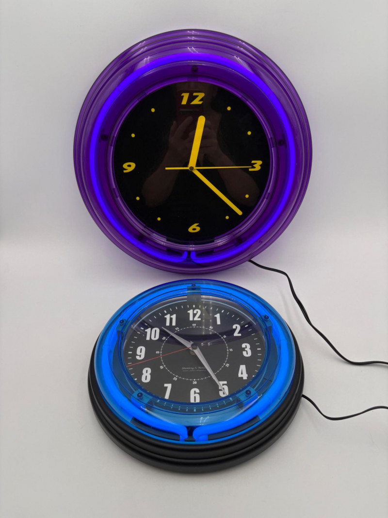 Two new/nearly new neon clocks in blue and purple. Blue neon clock is from Sterling & Noble Clock Company. Clock runs on a single "AA" battery and comes with an adaptor to run the neon part. Appears to be nearly new/seldom used. Measures approx. 11" diameter. Box is in poor shape. Purple neon clock is from Spencer Gifts. Clock runs on a single "AA" battery and comes with an adaptor to run the neon part. Appears to be new and never used. Measures approx. 14" diameter. Box in good shape. BONUS: we have a third red neon clock that has been used extensively. Still works great & keeps time but has a moth passenger we can't seem to remove and shows a bit of wear (see last photo). Same size & make as blue one above. No box.