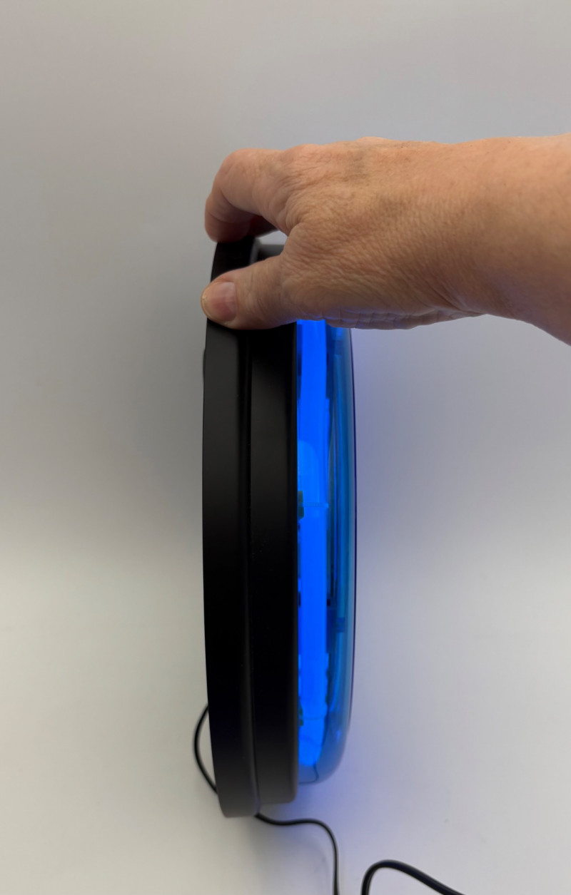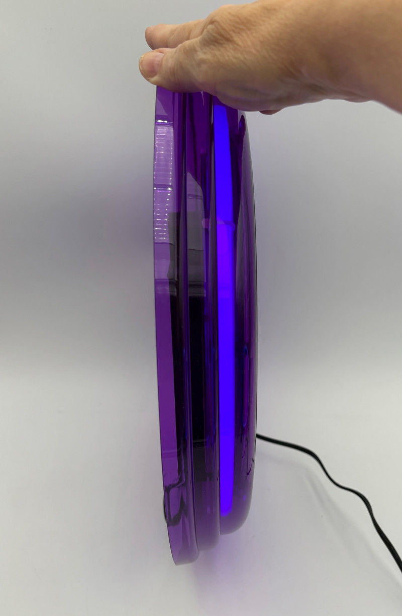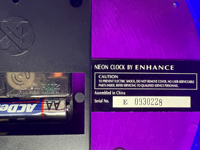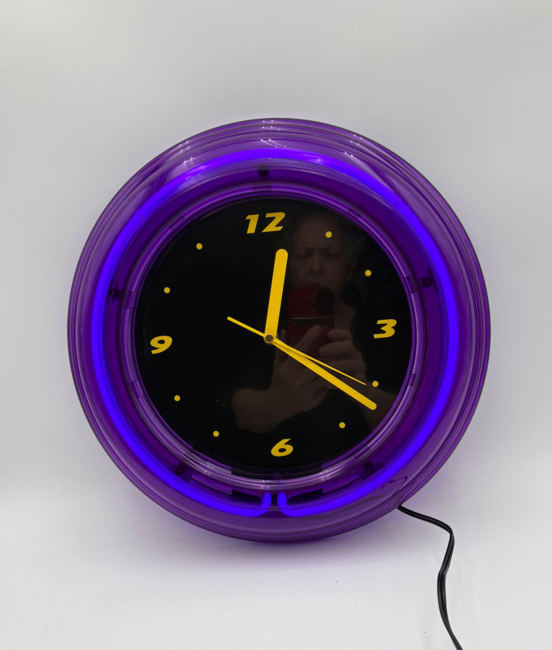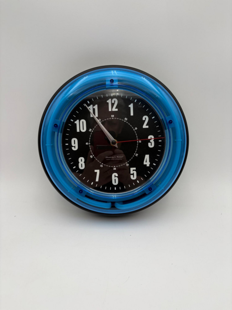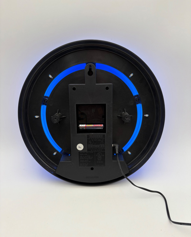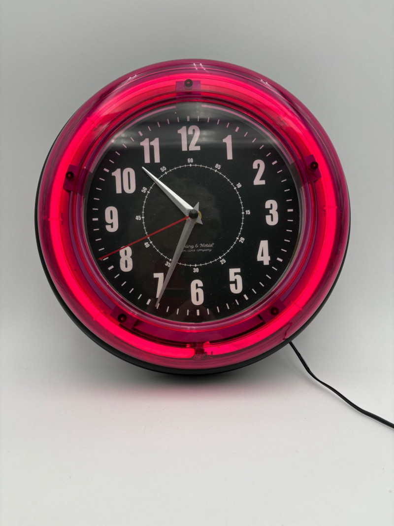 Two new/nearly new neon clocks in blue and purple. Blue neon clock is from Sterling & Noble Clock Company. Clock runs on a single "AA" battery and comes with an adaptor to run the neon part. Appears to be nearly new/seldom used. Measures approx. 11" diameter. Box is in poor shape. Purple neon clock is from Spencer Gifts. Clock runs on a single "AA" battery and comes with an adaptor to run the neon part. Appears to be new and never used. Measures approx. 14" diameter. Box in good shape. BONUS: we have a third red neon clock that has been used extensively. Still works great & keeps time but has a moth passenger we can't seem to remove and shows a bit of wear (see last photo). Same size & make as blue one above. No box.