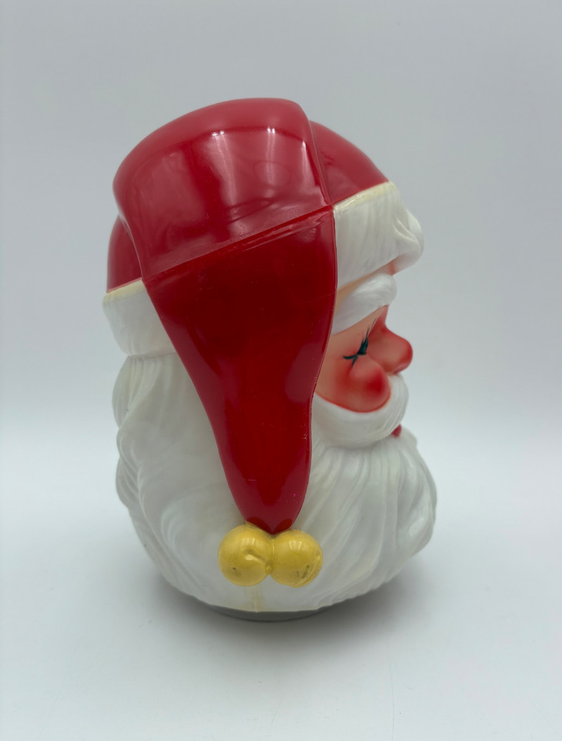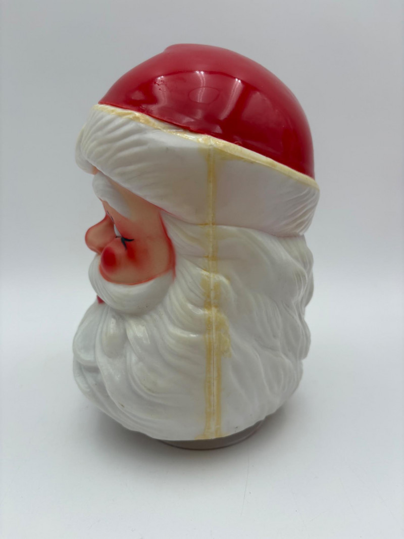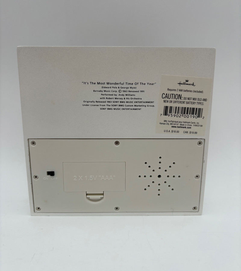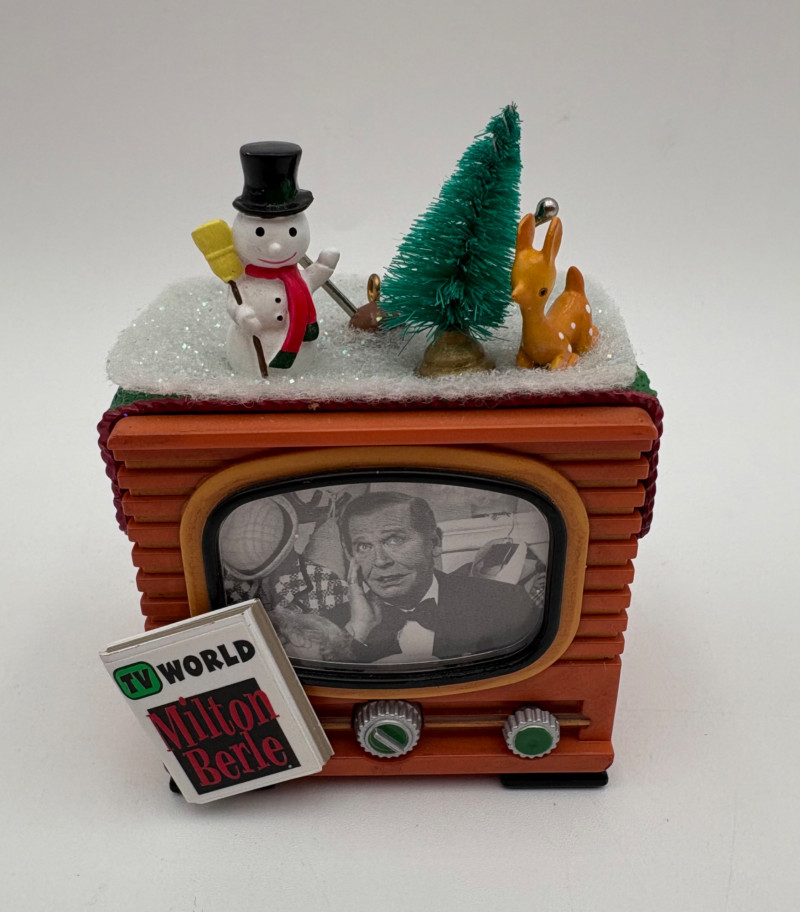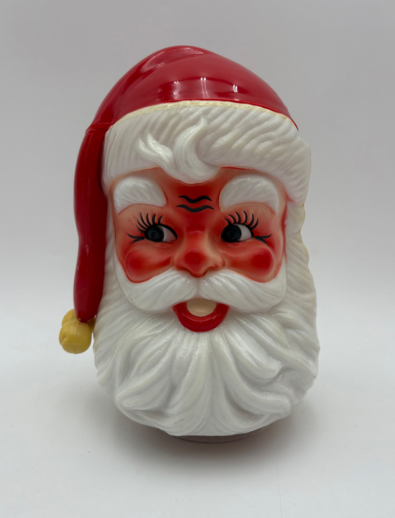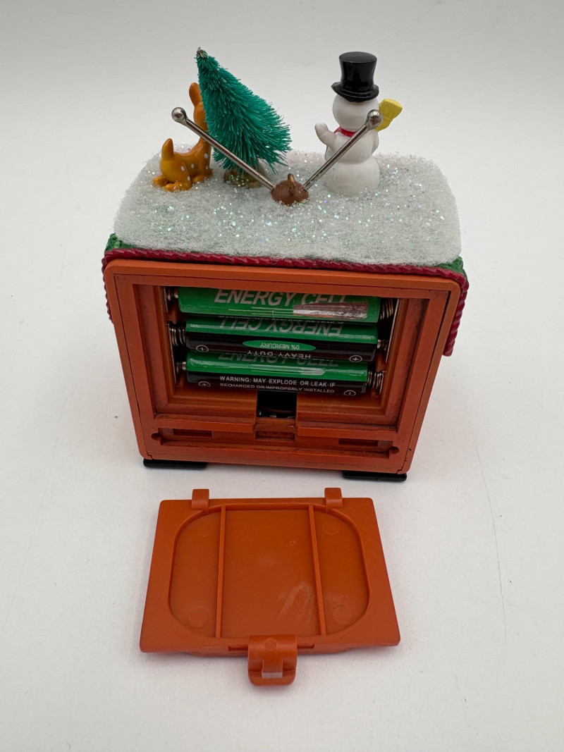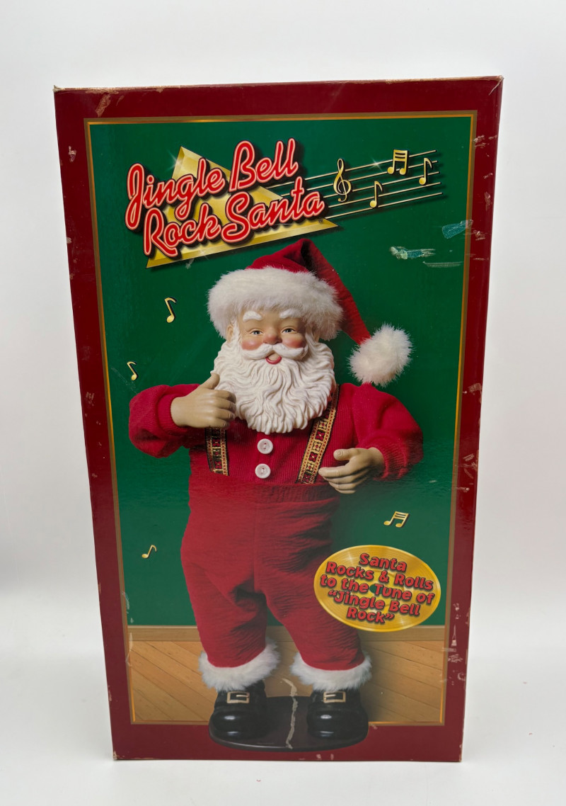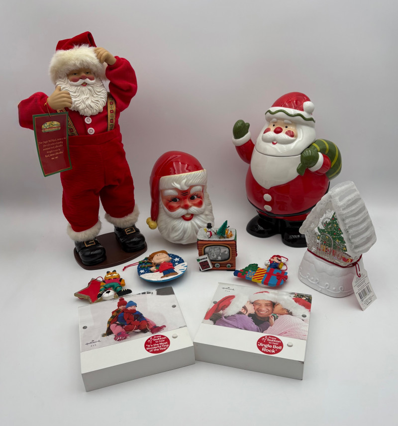Lot of "old school" decorations that all either light up, make noise, or both! - Rockin' Santa from Christmas Fantasy Ltd. wiggles his hips to the beat of Jingle Bell Rock. Used very little if at all. Adapter and on-off switch at the rear of the feet. Measures 14" H. From 1998. - Vintage windup spinning Santa head. Turn the base to wind up and he plays "Jingle Bells" as he slowly spins. Measures approx. 8 " H. Some slight discoloration at seams from age - See photos. From 1973. - Pair of Hallmark photo music boxes - remove the Plexi square, put your photo behind it & replace it (magnetic). Touch the player button and you can hear "It's the most Wonderful Time of the Year" or "Jingle Bell Rock". Great grandparent gift! Appear to be new and both tested fine - each uses 2 AAA batteries. They measure 6" square and hold 4" x 6" photos. - Hallmark light-up "globe" in the shape of a home with swirling snow and changing colors. Works fine with 3 AAA batteries but is a tad noisy in a silent room (probably wouldn't notice, but our booth was super quiet today!). Tree is equally visible from front or back and pump swirls snow while changing colors. From 2010. - Milton Berle TV ornament from Carlton Cards lights up and plays dialogue from the show. Measures approx. 4' H and runs on 3 AAA batteries. From 2003. - 3 pushbutton ornaments featuring Charlie Brown, Garfield, and Mario. All play a little ditty when the button on the back is pushed. They measure about 4" H. From the late 1990s. - Santa Claus cookie jar from Target Home - head lifts off. Measures 11" H. Appears new. OK - this item doesn't light up or make noise, but if you eat cookies in it you may light up and say "Yum."