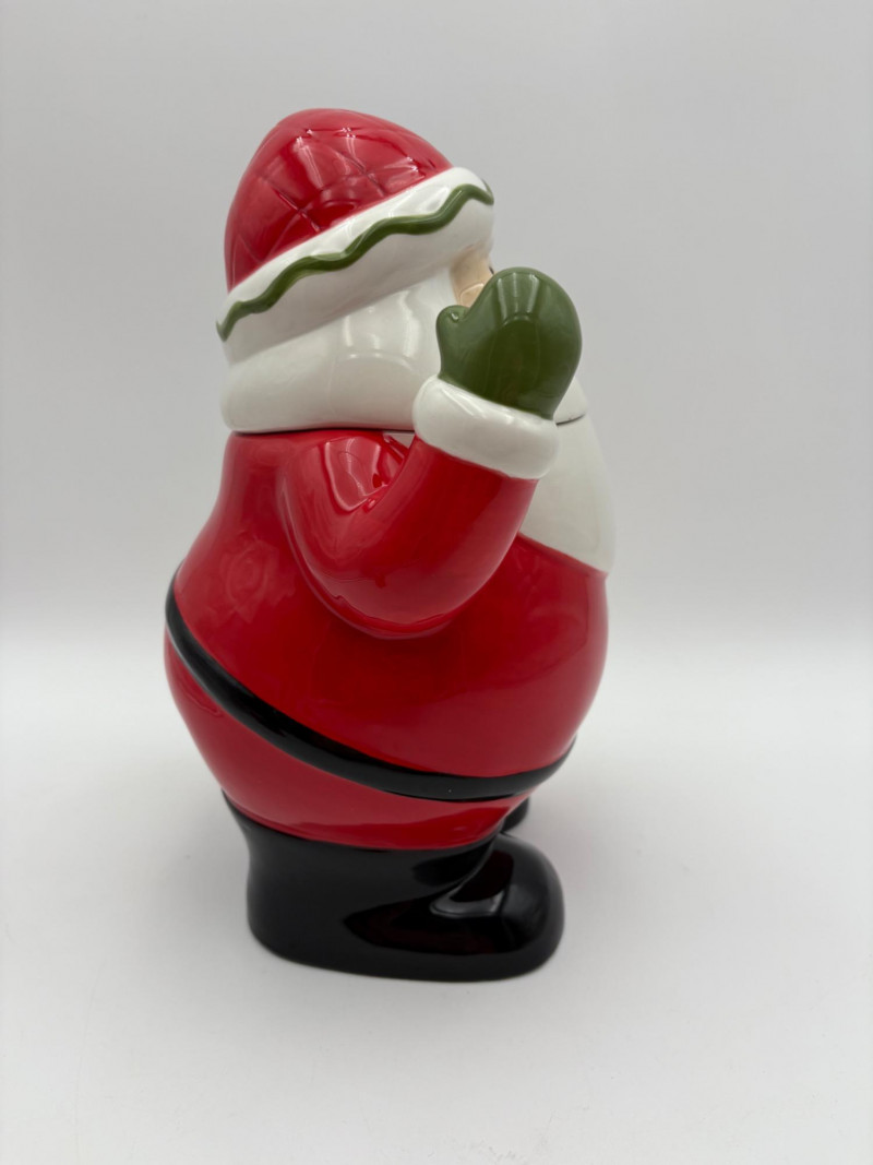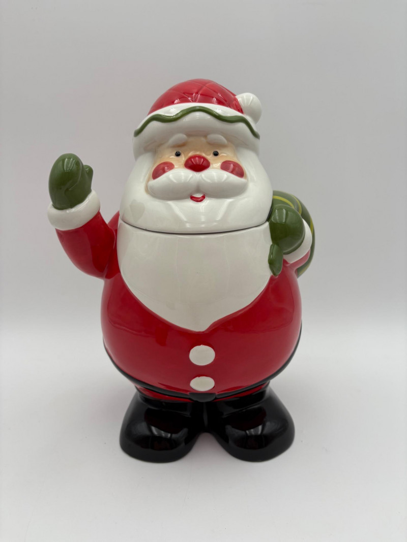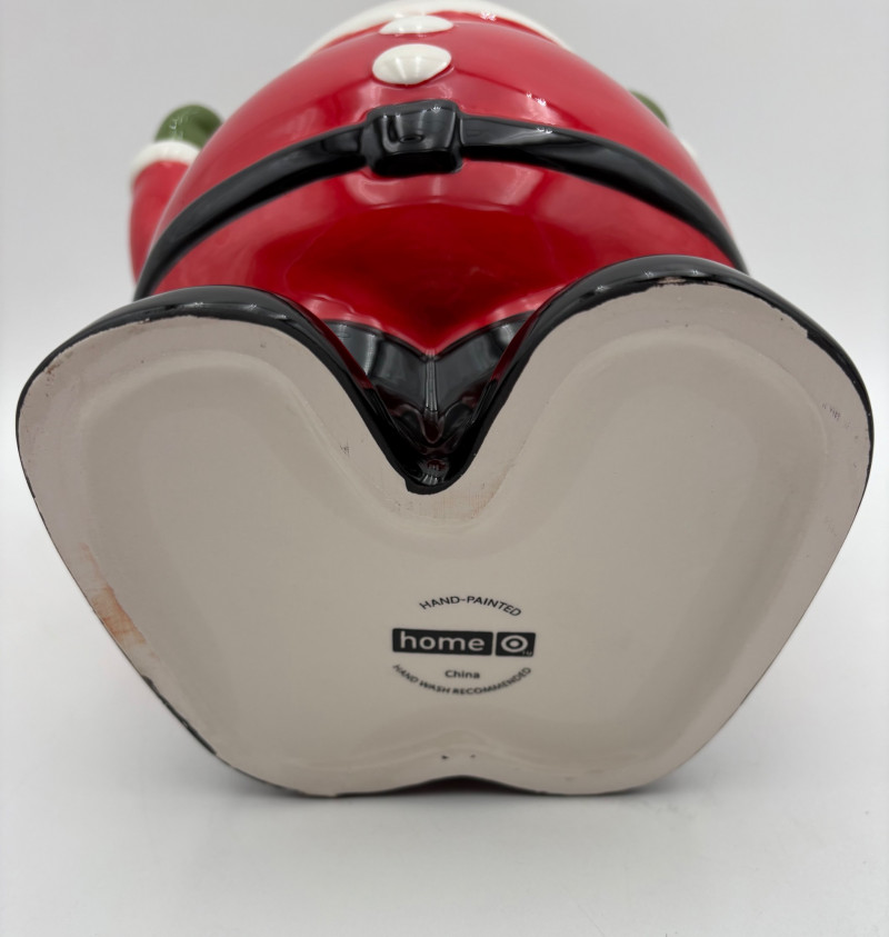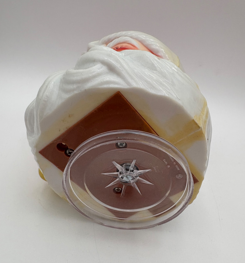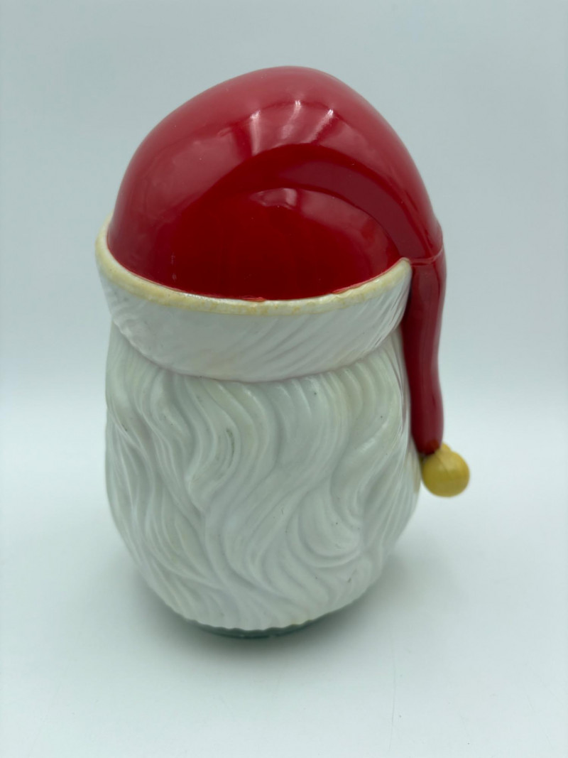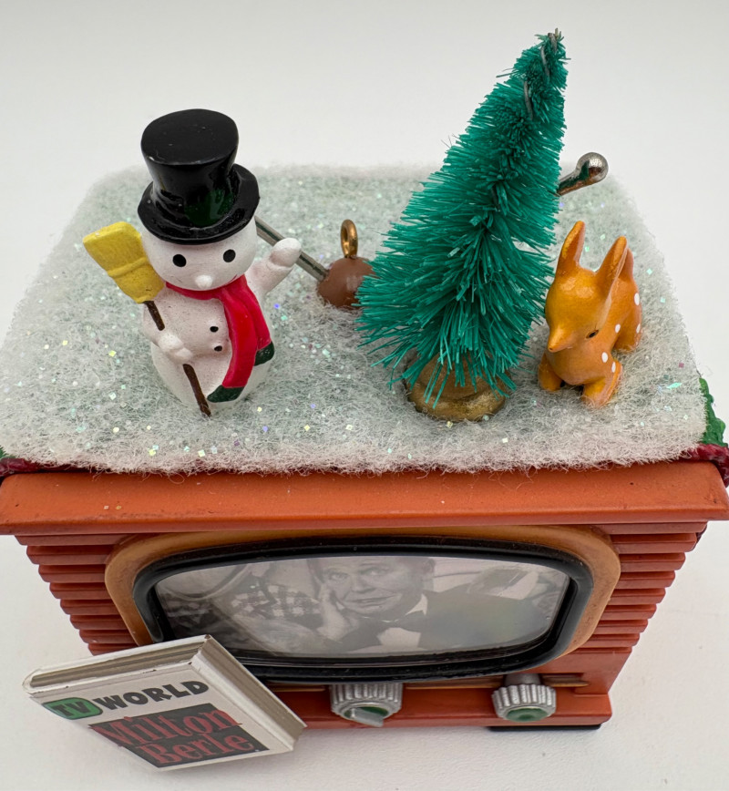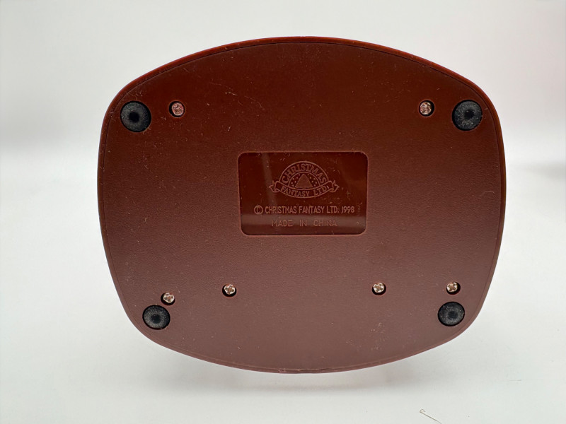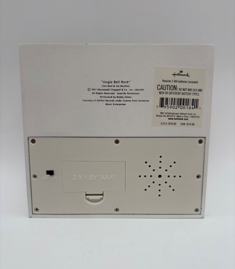 Lot of "old school" decorations that all either light up, make noise, or both! - Rockin' Santa from Christmas Fantasy Ltd. wiggles his hips to the beat of Jingle Bell Rock. Used very little if at all. Adapter and on-off switch at the rear of the feet. Measures 14" H. From 1998. - Vintage windup spinning Santa head. Turn the base to wind up and he plays "Jingle Bells" as he slowly spins. Measures approx. 8 " H. Some slight discoloration at seams from age - See photos. From 1973. - Pair of Hallmark photo music boxes - remove the Plexi square, put your photo behind it & replace it (magnetic). Touch the player button and you can hear "It's the most Wonderful Time of the Year" or "Jingle Bell Rock". Great grandparent gift! Appear to be new and both tested fine - each uses 2 AAA batteries. They measure 6" square and hold 4" x 6" photos. - Hallmark light-up "globe" in the shape of a home with swirling snow and changing colors. Works fine with 3 AAA batteries but is a tad noisy in a silent room (probably wouldn't notice, but our booth was super quiet today!). Tree is equally visible from front or back and pump swirls snow while changing colors. From 2010. - Milton Berle TV ornament from Carlton Cards lights up and plays dialogue from the show. Measures approx. 4' H and runs on 3 AAA batteries. From 2003. - 3 pushbutton ornaments featuring Charlie Brown, Garfield, and Mario. All play a little ditty when the button on the back is pushed. They measure about 4" H. From the late 1990s. - Santa Claus cookie jar from Target Home - head lifts off. Measures 11" H. Appears new. OK - this item doesn't light up or make noise, but if you eat cookies in it you may light up and say "Yum."