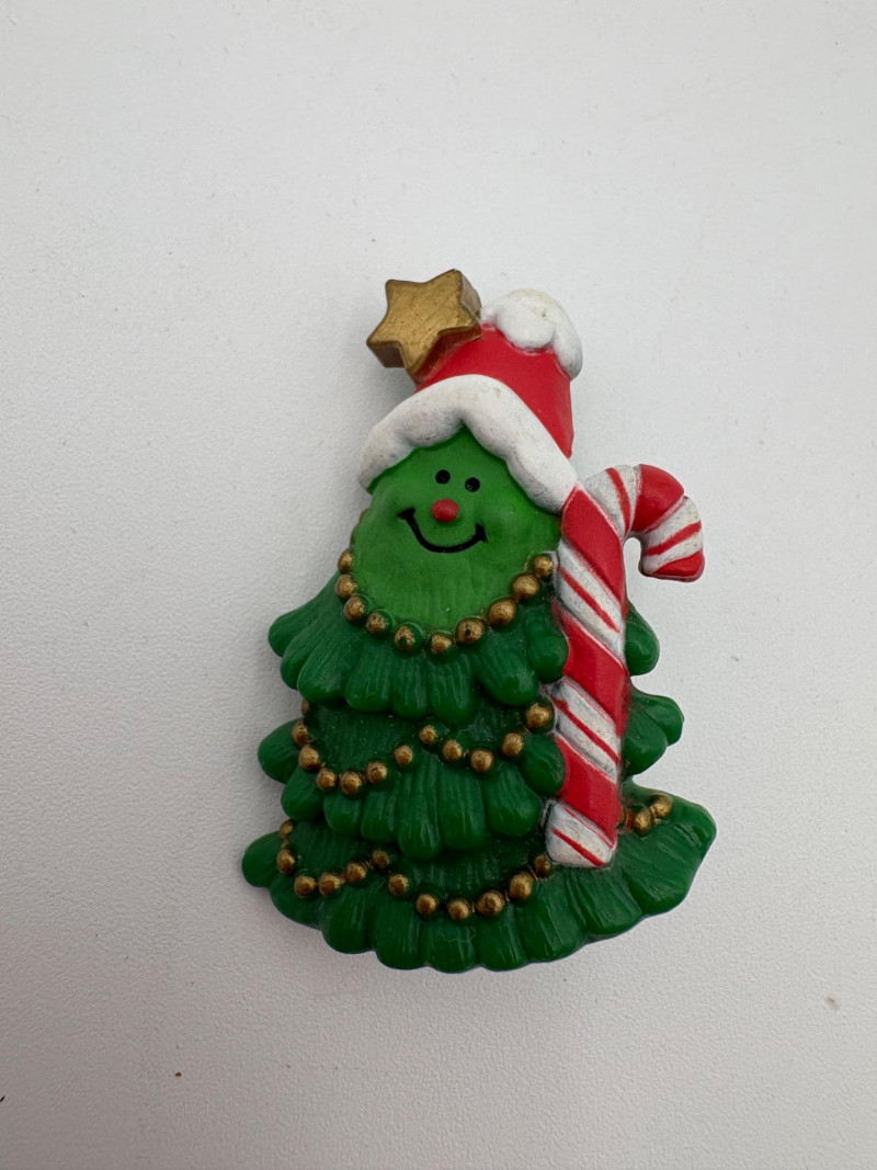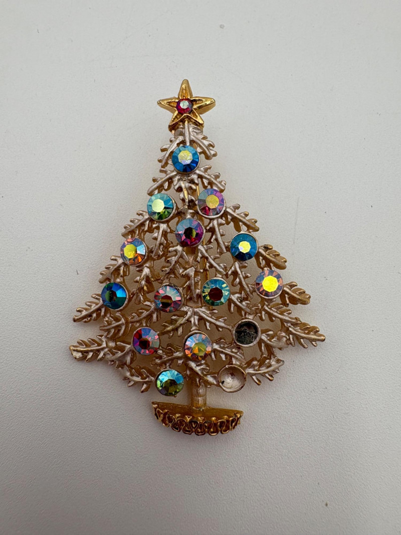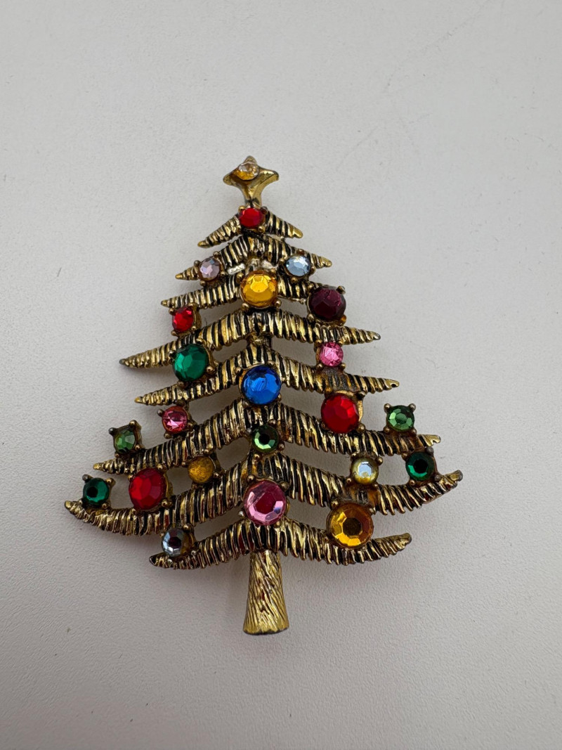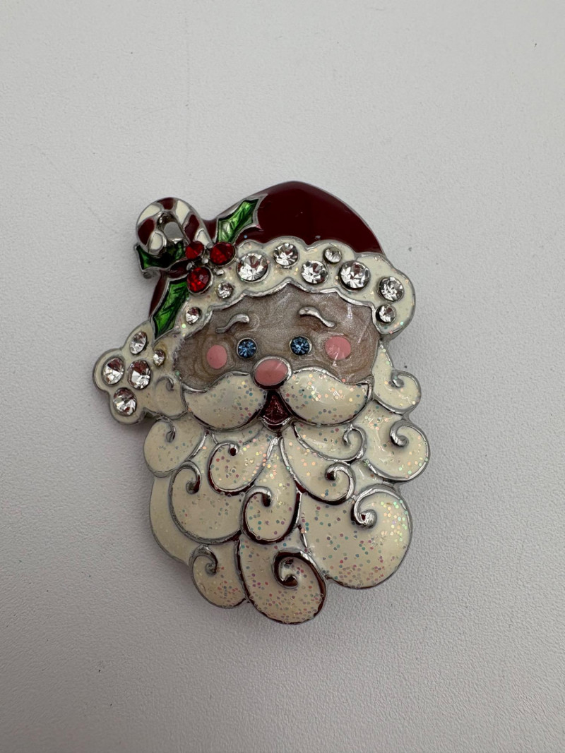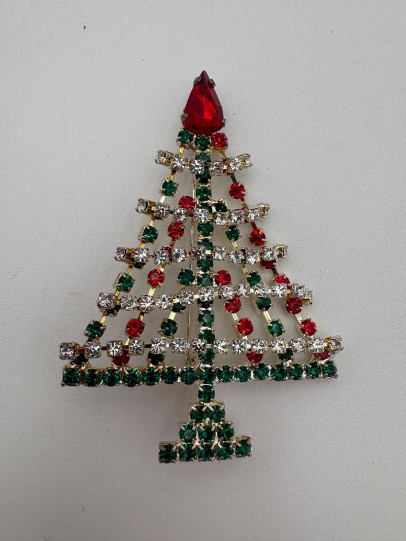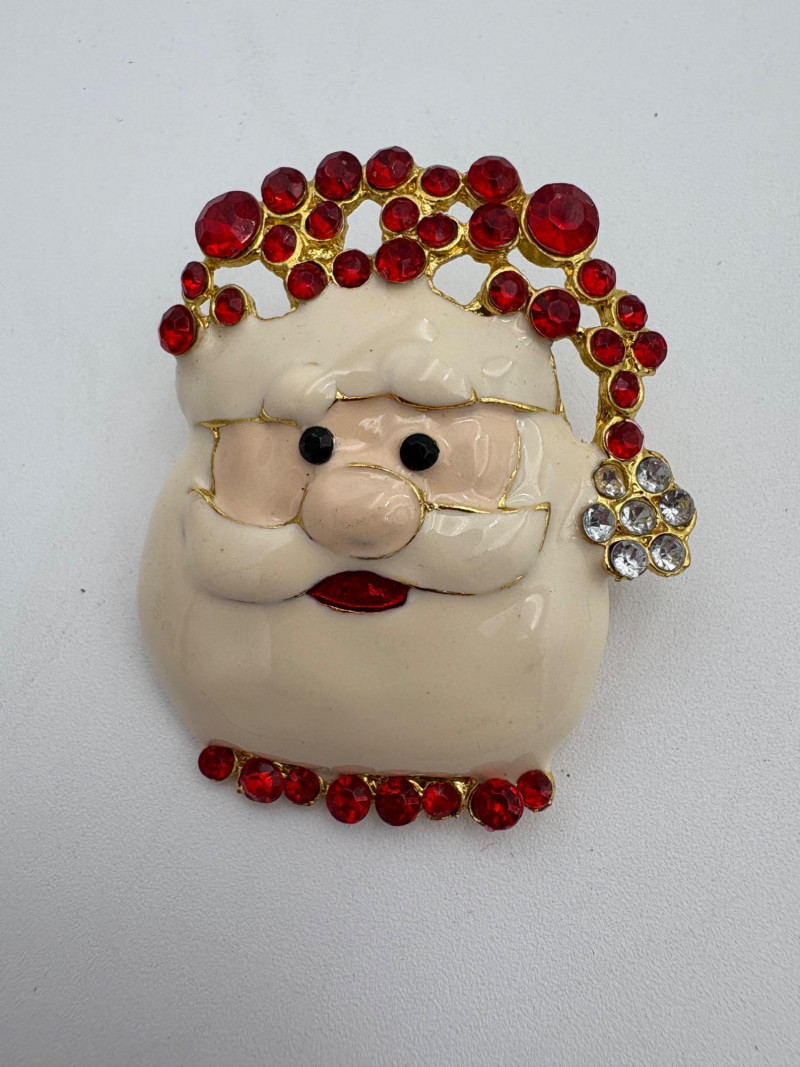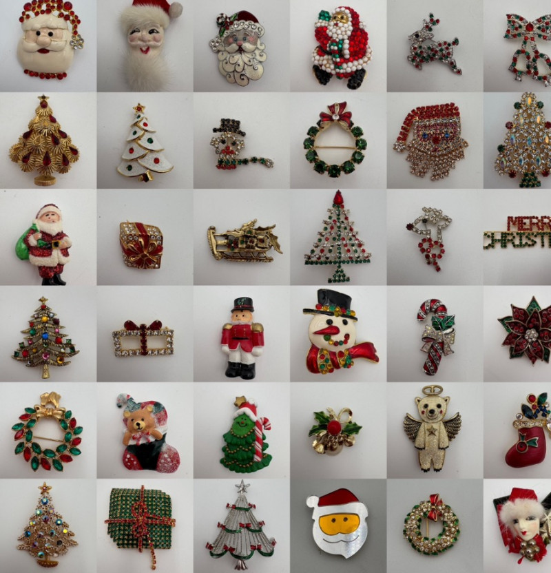 Large group of mixed vintage and newer Christmas themed pins. Some excellent vintage Christmas trees (the last one still has a price of $37 on the reverse) and we love the furry Santa face. Other pieces are just for novelty made of plastic. Please look at photos closely - a couple of pieces are missing a stone or two, but they are not really noticeable when taken as a whole.