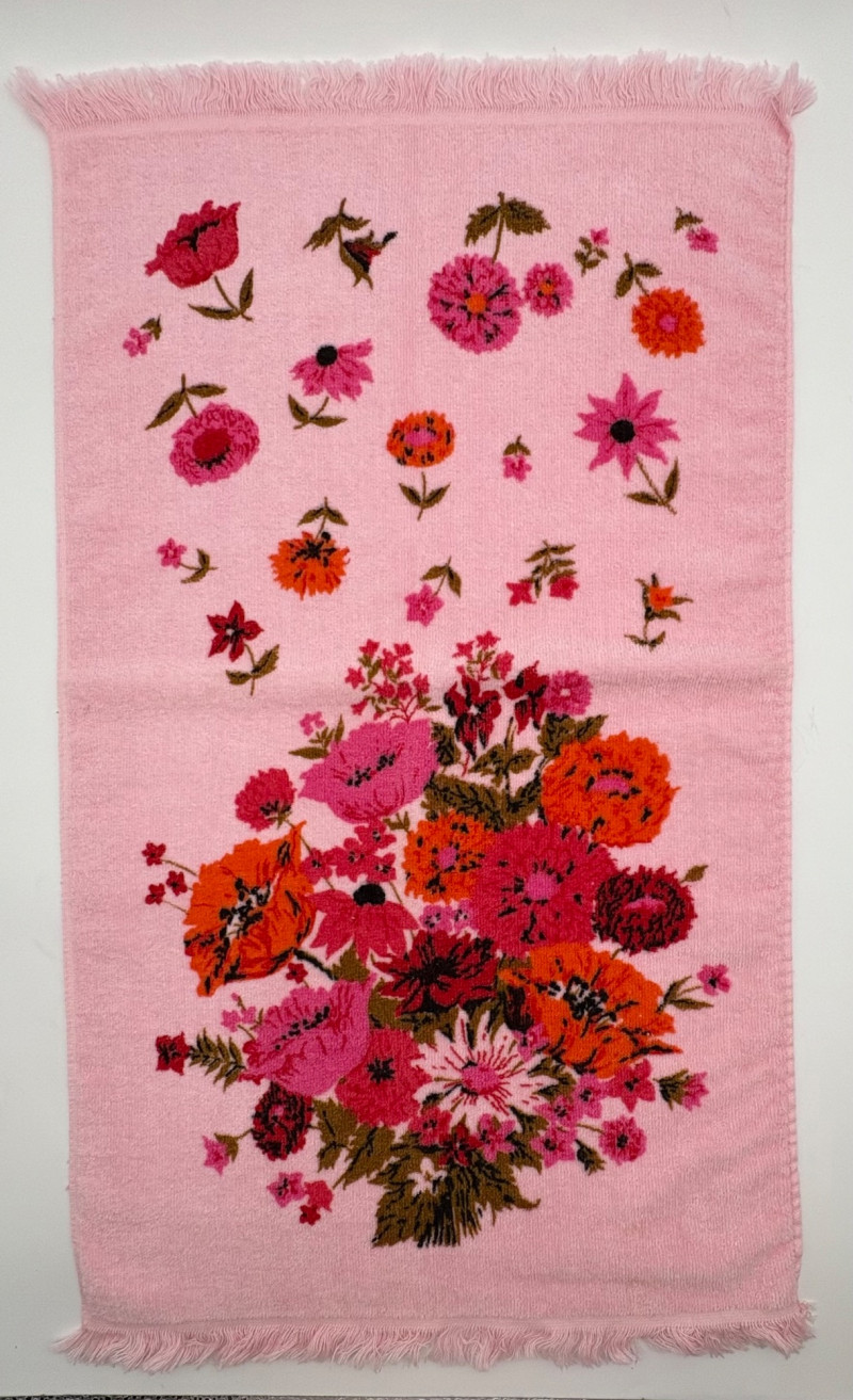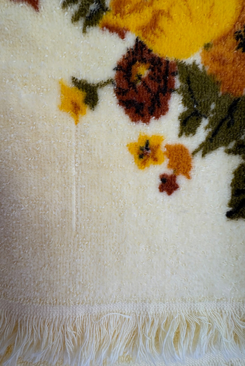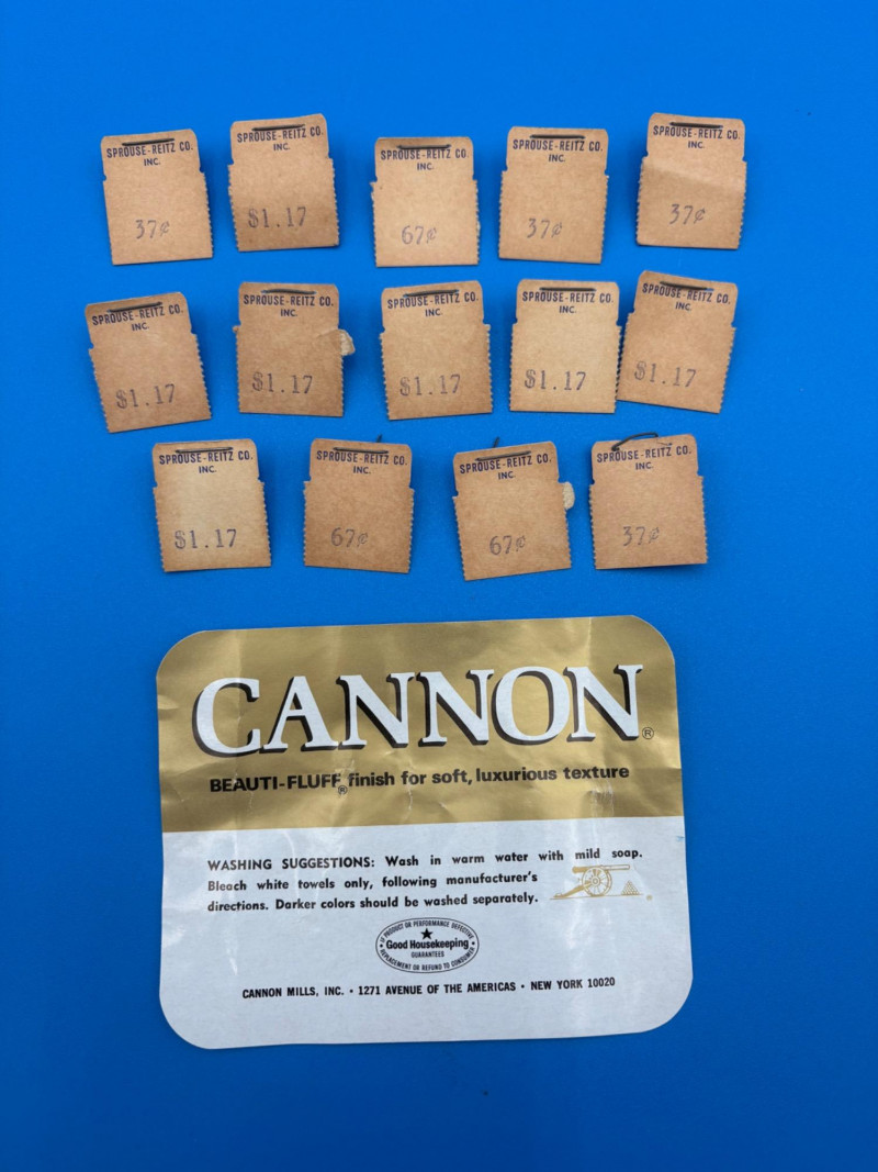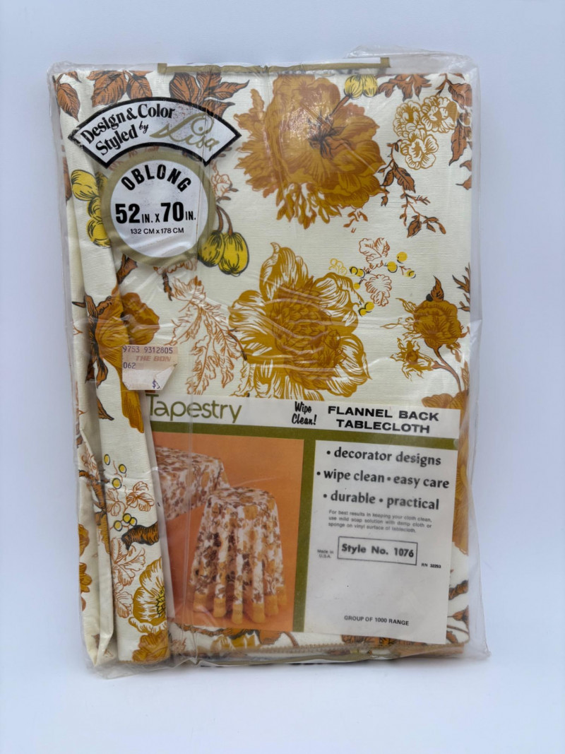 This is a wonderful group of "old school" floral terrycloth towels and vinyl tablecloths with flannel backing. We think all items are from the 1970s/1980s (Sprouse-Reitz changed its name to just "Sprouse" in 1989, so these are pre-1989 given the price tags). The towels were stored for many years in an open box and were quite dusty, so we need to wash them to do them justice. They were new before we laundered them (they had that stiff feel new towels used to have) and many still had their price tags attached - see blue background photo. PINK TOWELS - 4 bath towels, 3 hand towels, and 3 washcloths. 3 small flaws noticed: dark spot on one bath towel and a misweave on 2 of the hand towels. - see last 3 photos. YELLOW TOWELS (more lemony in color than the photos show) - 4 bath towels, 4 hand towels, and 1 washcloth. 1 small flaw noticed: misweave on 1 hand towel - see 4th from last photo. BONUS A solid yellow bath towel with floral hand towel & washcloth from Cannon were in the same box and were also new and laundered. They go quite well with the yellow set above (not pictured) TABLECLOTHS - 4 variously patterned vinyl tablecloths - all measure 52" x 70" and all are unused in their original packaging. BONUS: 5th tablecloth from the same box that appears to have slight damage (not pictured)