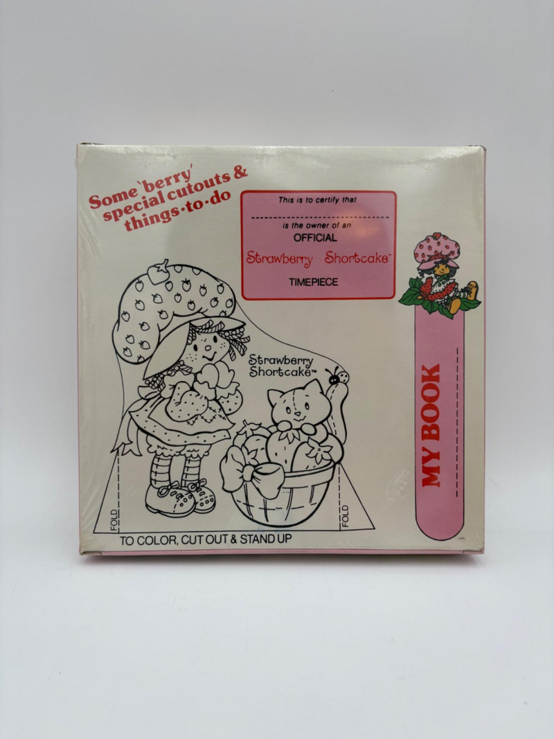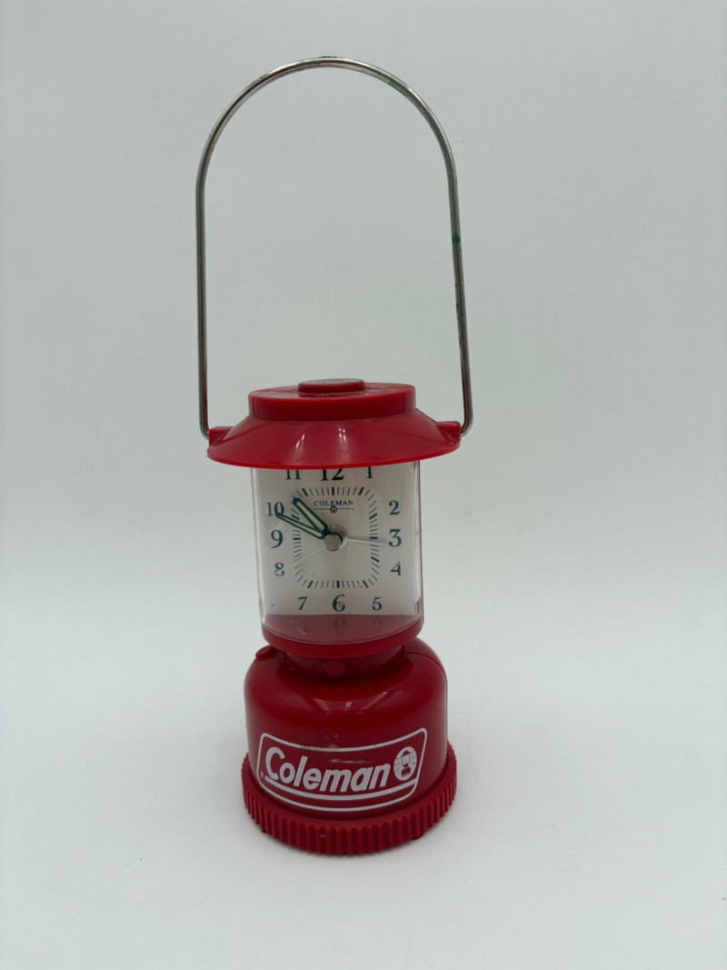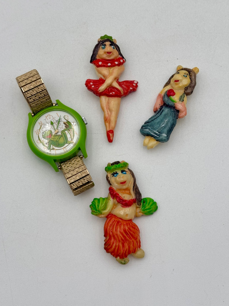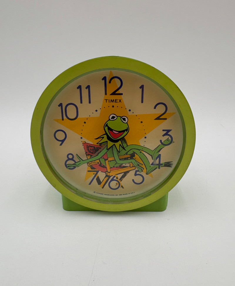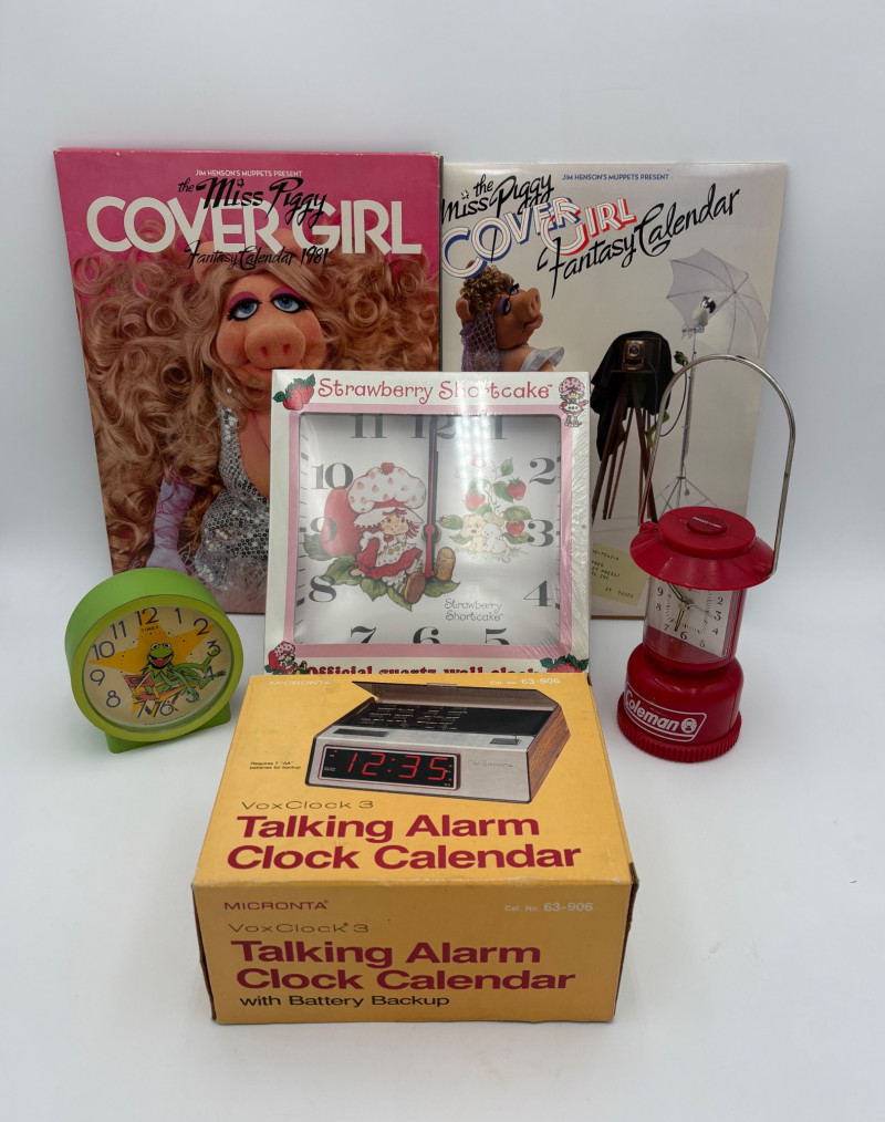 Quartet of vintage clocks from the 1970s/1980s with familiar brand names/characters that will take you back to childhood. Paired with a terrific Miss Piggy calendar. CLOCKS: Strawberry Shortcake Quartz wall clock from Welby by Elgin. New in original shrinkwrap - this square shape appears to be rather rare on the retail market. Measures approx. 8.5" square x 2.5" D. Model #E8125. Kermit the Frog wind-up alarm clock from Timex. Wound it up and it keep good time. Measures approx. 4.5" square x 2" D. Model #95601. Coleman lantern clock (this one is fairly new - from 2008) with glow--in-the-dark hands, top snooze light, & on/off switch at base. Measures approx. 10" with handle up - body is 6.5" H. Talking Alarm/Calendar electric clock from Micronata (for Radio Shack) is a VoxClock 3 Audio/Visual/Time model (#63-906). We think if it's not new, it's nearly new (we noticed one small scratch upon close inspection). Comes with original box and packaging along with original 9V battery (get a new one!). States the time clearly and appears to keep time - lots of different settings to play/program. Measures 2.5" H x 6.5" W x 5.5" D. CALENDAR Bonus: we found some cheesy Miss Piggy pins and a Kermit watch after lead photos were taken - watch needs new battery.