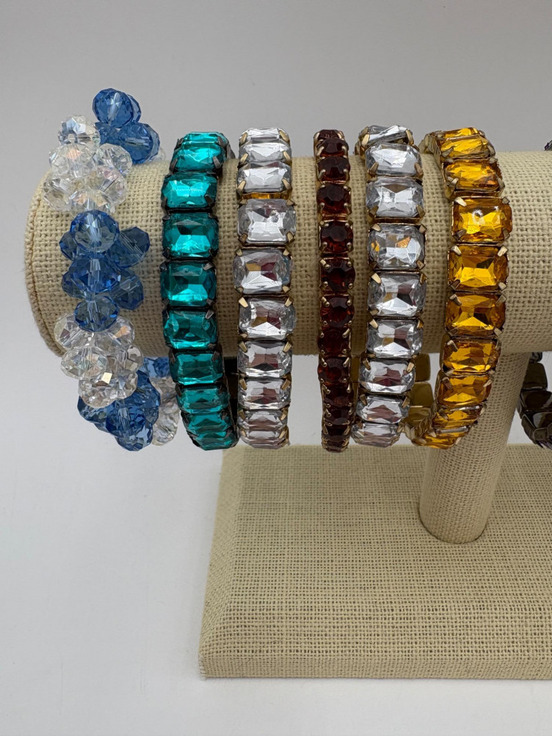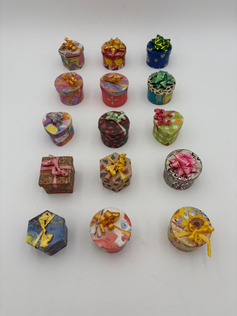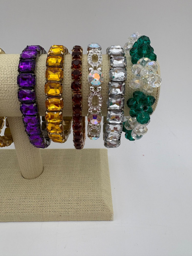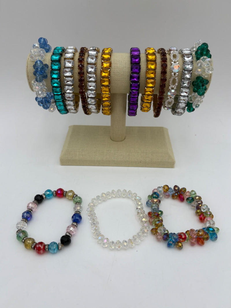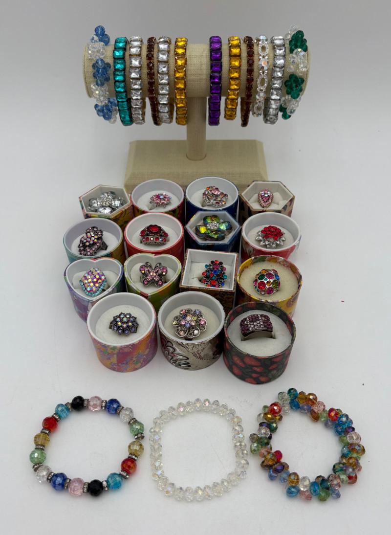 Great group of 15 costume jewelry rings with boxes & 15 bracelets - perfect as children's stocking stuffers or as party favors. These are the kind of rings that are split at the back to adjust to finger size and the bracelets are on stretchy elastic bands - not high end costume jewelry, but terrific for kids or a fancy dress party. Large variety of colors and designs - please see photos since what you see is what you get.