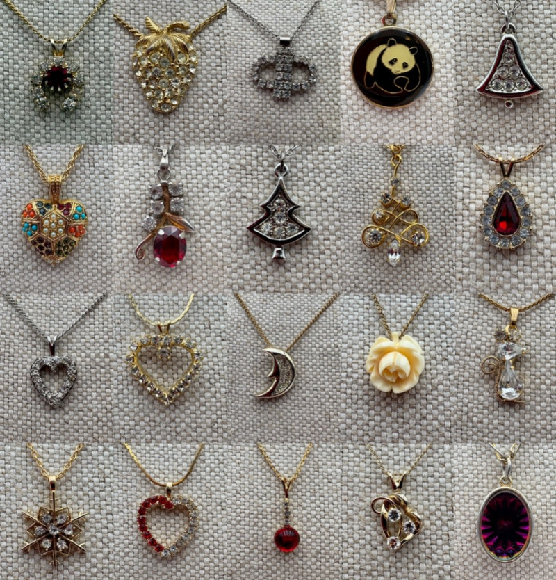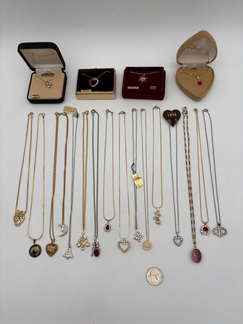 20 necklaces with small delicate pendants; some from name brands and several of Austrian crystal from places like the Bon Marche (now you know why it's vintage and the marked prices are so low - they've been gone for over 20 years!) Perfect for the smaller person or the understated dresser. See photos for details.