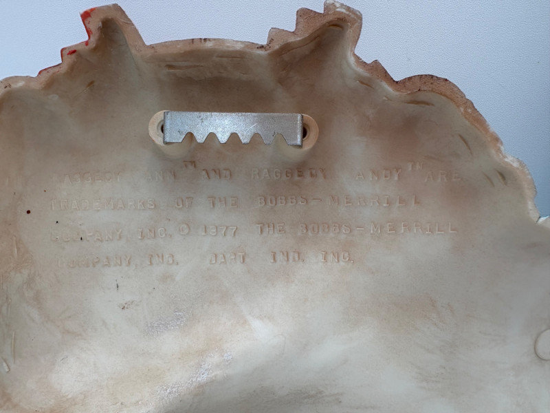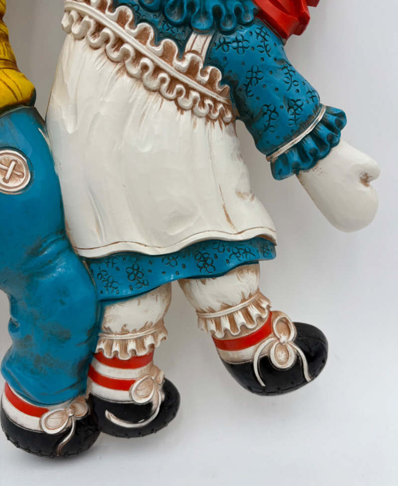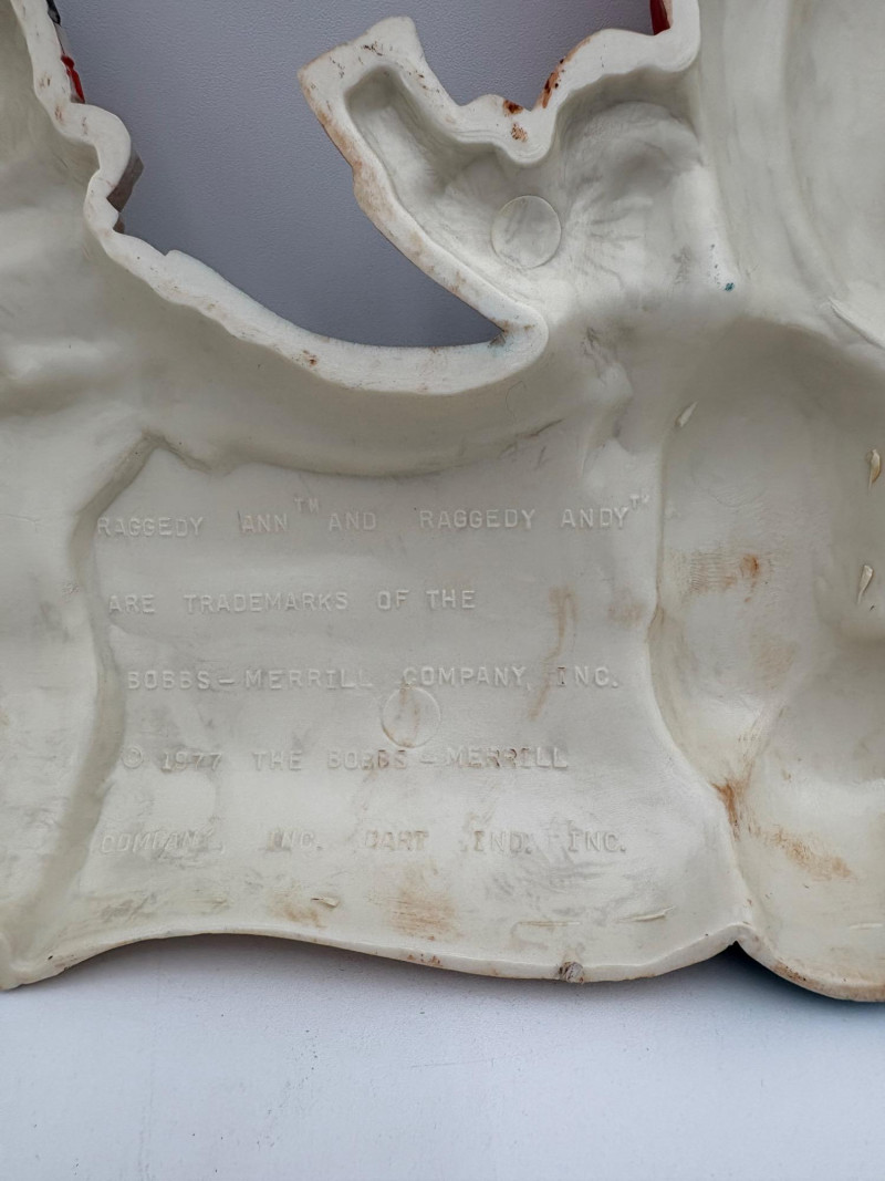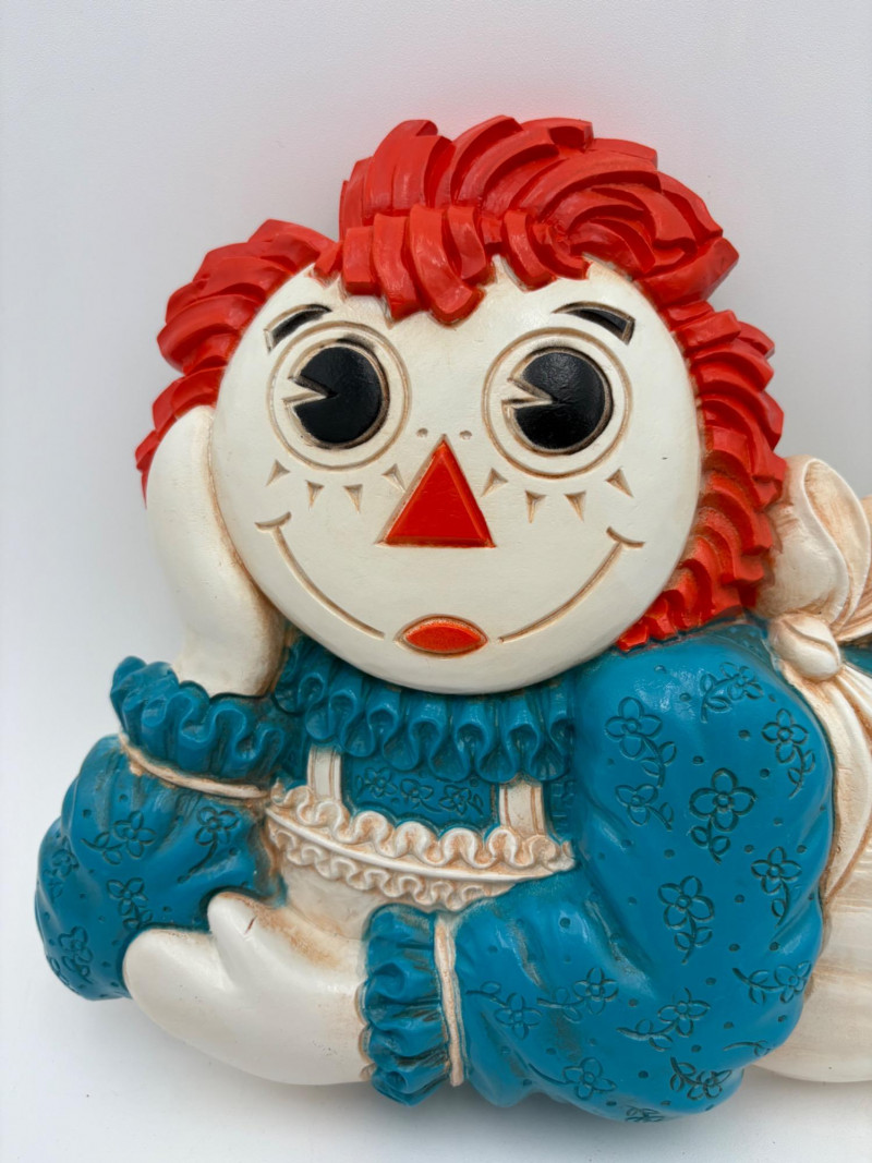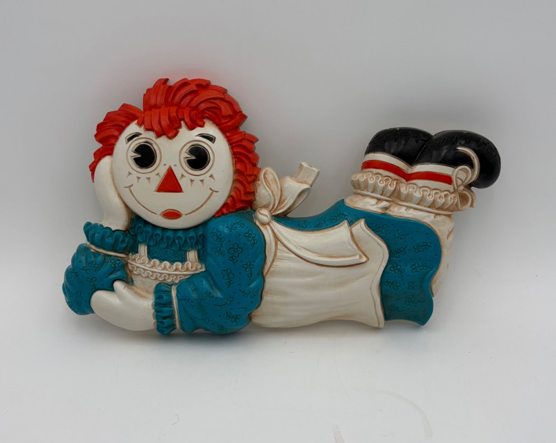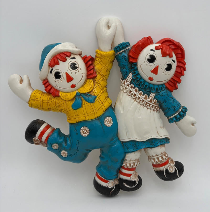 Trio of great 1977 Raggedy Ann & Andy wall hangings in thick molded plastic. They have been hung up for nearly 50 years; the colors are still brilliant but a good scrub would make them look even better than they do now. There are no noticeable flaws. Made by the Bobbs-Merrill Co. of Indiana. Duo measures approx. 15" H x 15" W x 1.5" D. Reclining singles measure approx. 9" H x 14" W x 1.5" D.