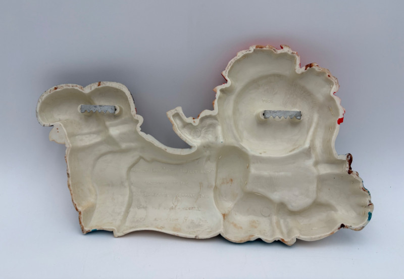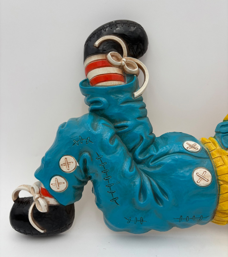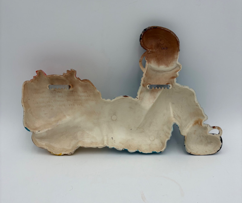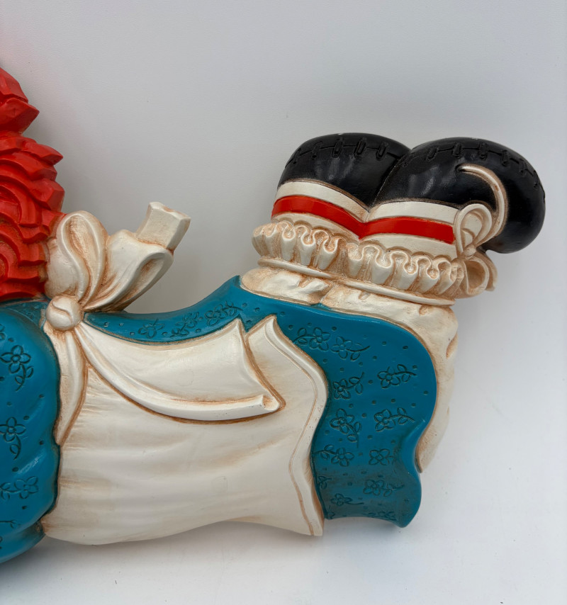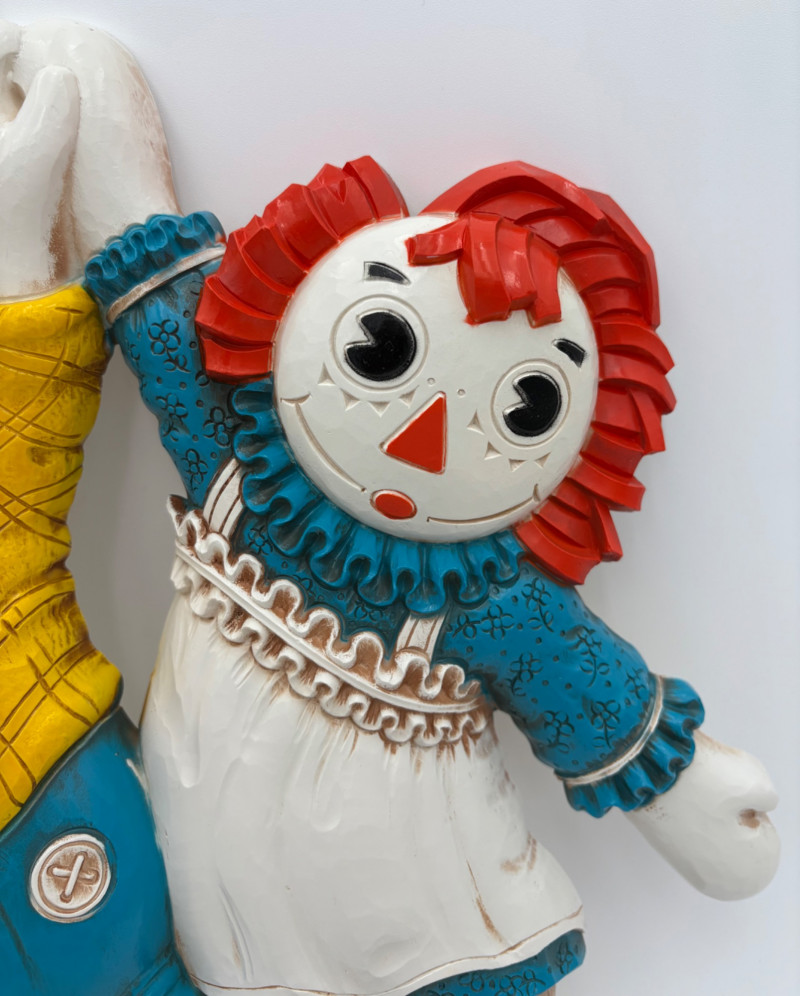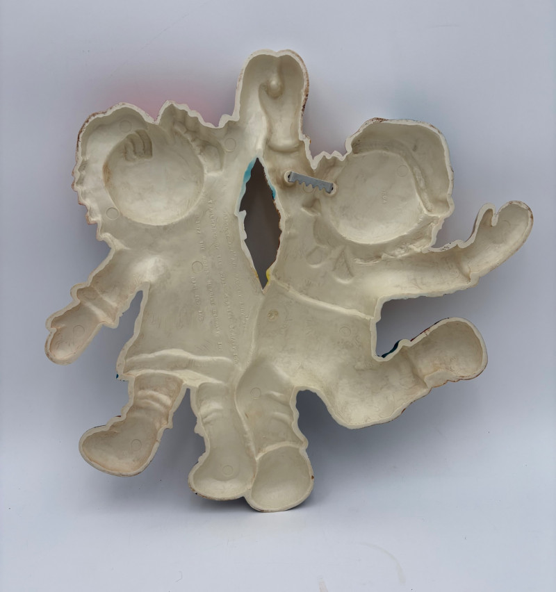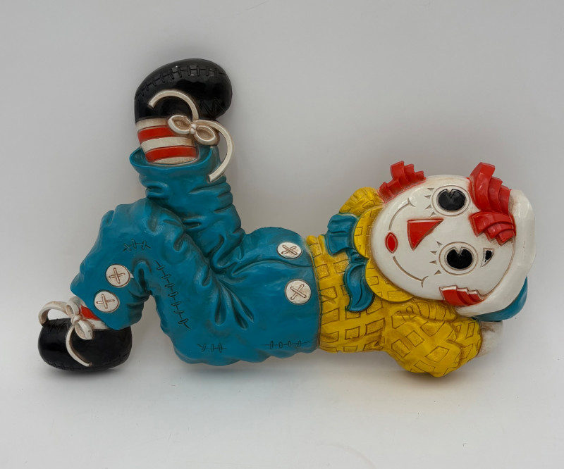 Trio of great 1977 Raggedy Ann & Andy wall hangings in thick molded plastic. They have been hung up for nearly 50 years; the colors are still brilliant but a good scrub would make them look even better than they do now. There are no noticeable flaws. Made by the Bobbs-Merrill Co. of Indiana. Duo measures approx. 15" H x 15" W x 1.5" D. Reclining singles measure approx. 9" H x 14" W x 1.5" D.