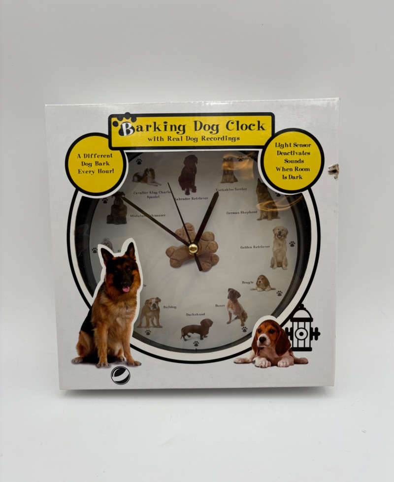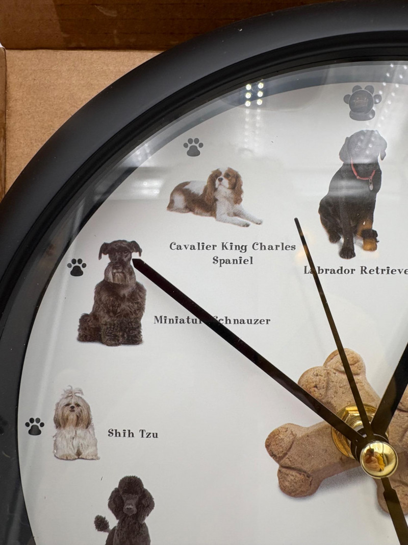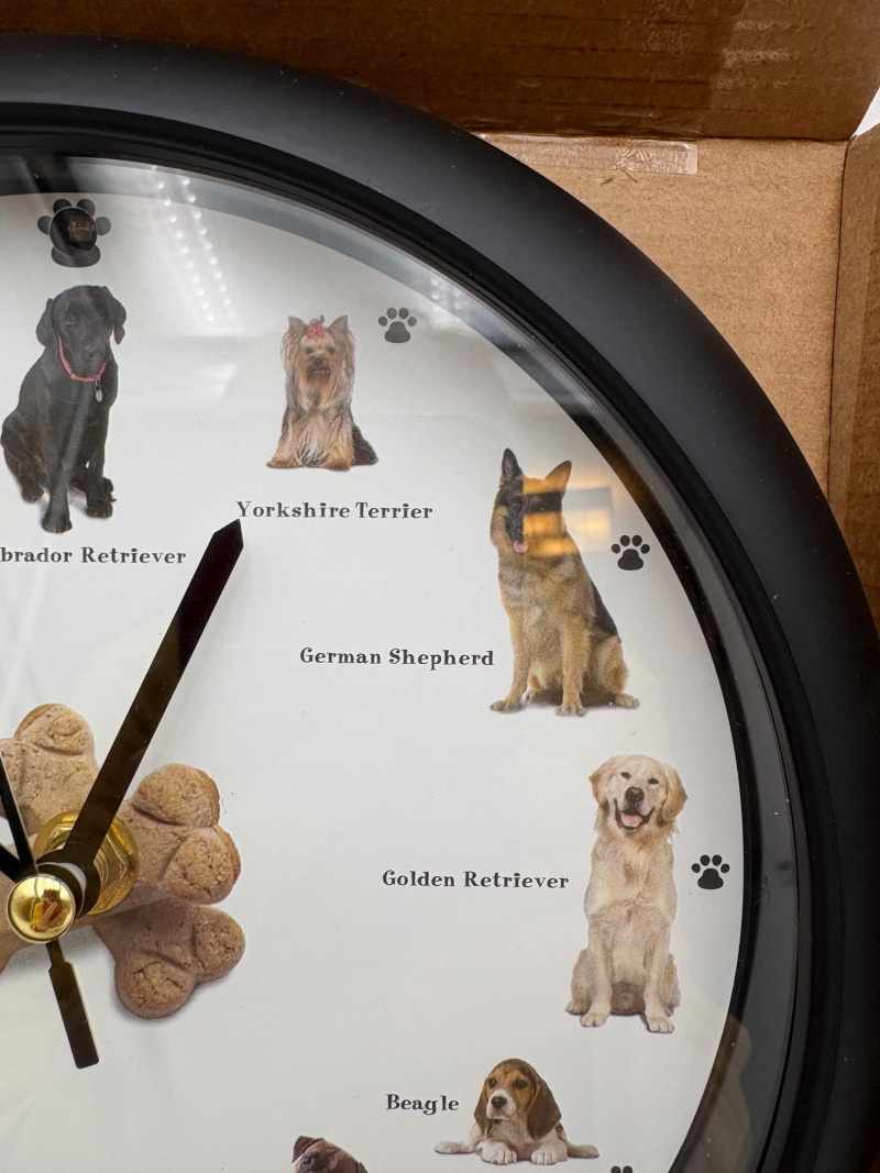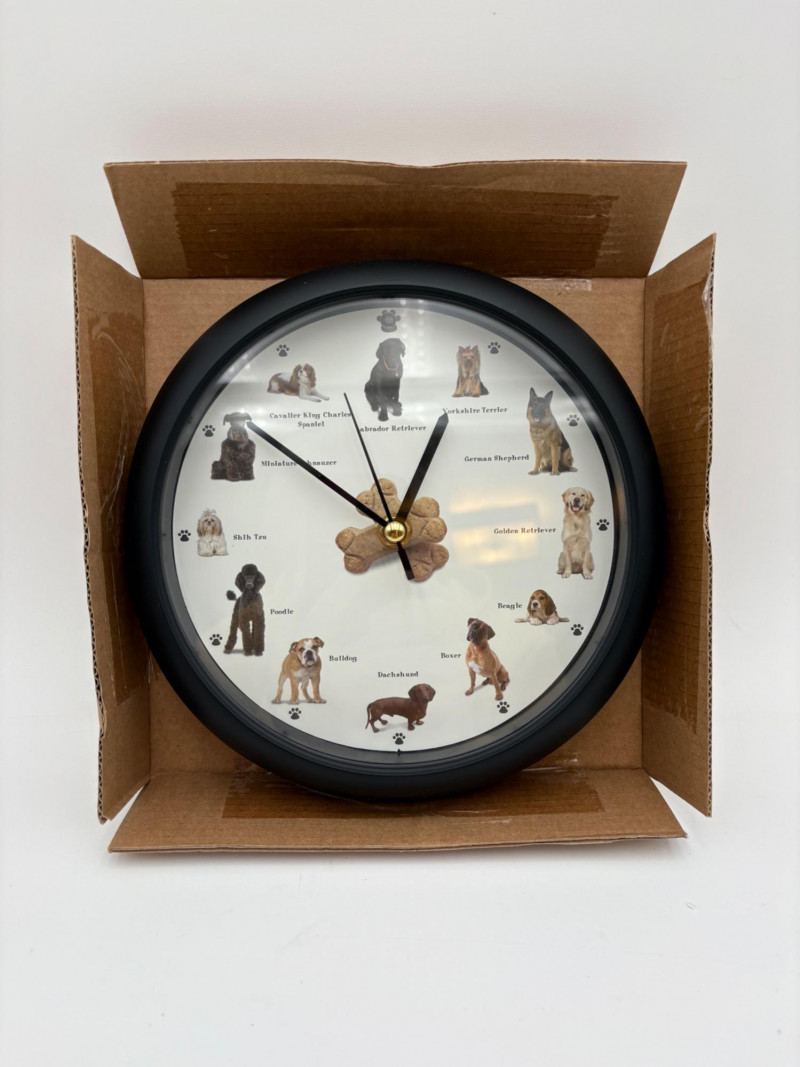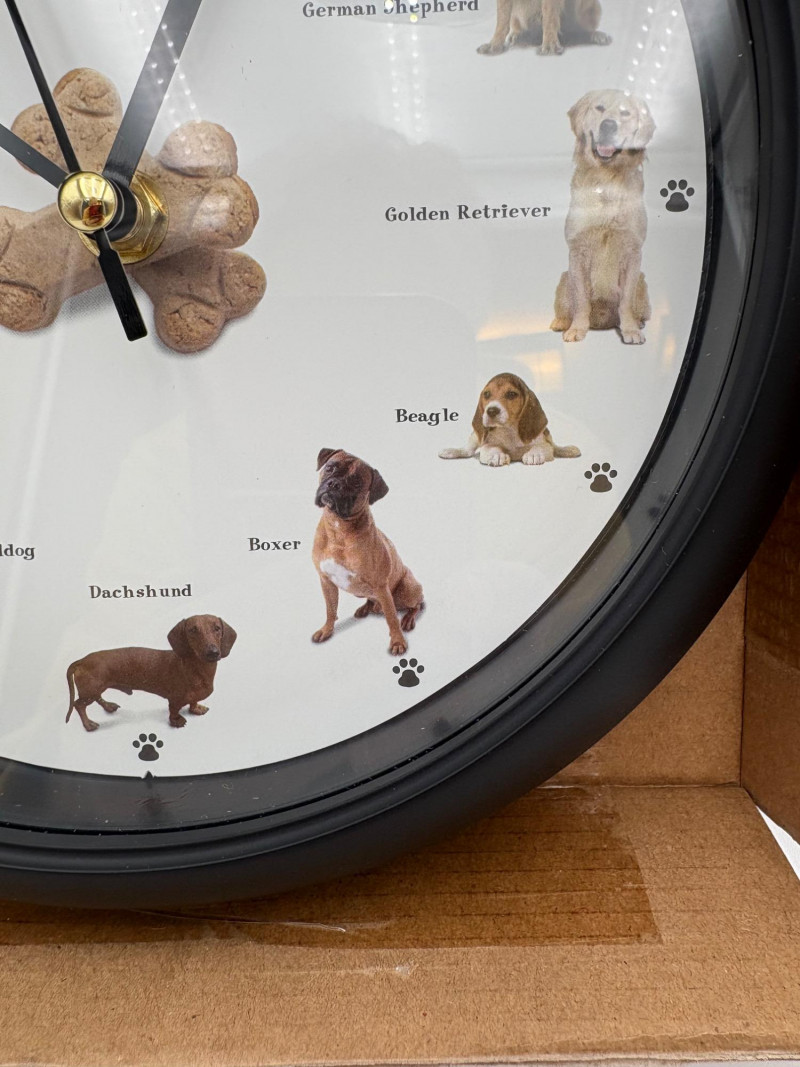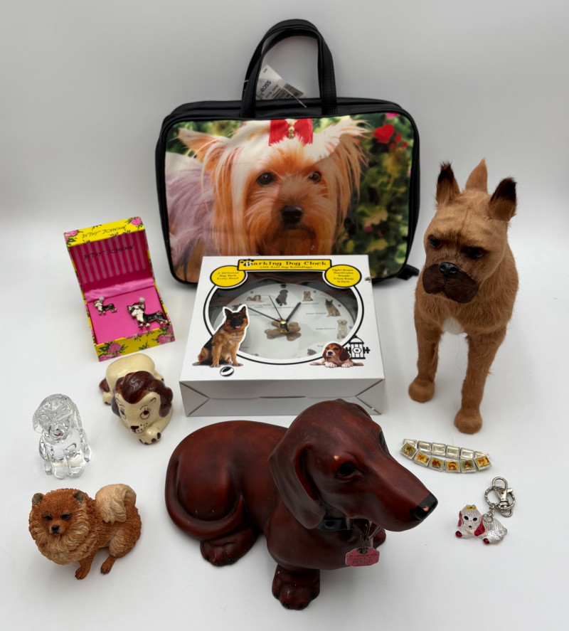 All things dog - vintage and not! - Barking dog clock - a different bark for each hour. We are not sure who wants to wake up to a barking dog, but different strokes for different folks. The clock is new & unused (still attached to its cardboard package) and when we inserted 3 AA batteries it does make barking sounds. Measures approx. 8" W. - Large boxer dog figure whose fur feels real & is super soft. Measures approx. 12" H. - Vintage cream & brown ceramic dog. Measures approx. 3" H. - Dog cosmetic bag. New & unused, but a couple of "sparkles" on one side at the collar missing (see last photo.) measures approx. 8" H x 12" W. - Clear glass dog figure measures approx. 3.5' H. - Cast resin Pomeranian figure measures approx. 4" H. Appears to be new. - Large vintage ceramic Dachshund named "Max" with Pierce Country license tag from 1971. Measures approx. 8" H x 11" L. - 3 dog accessories - a set of Christmas Boxer pins from Betsey Johnson, a plastic dog keychain, and a stretch Christmas dog bracelet.