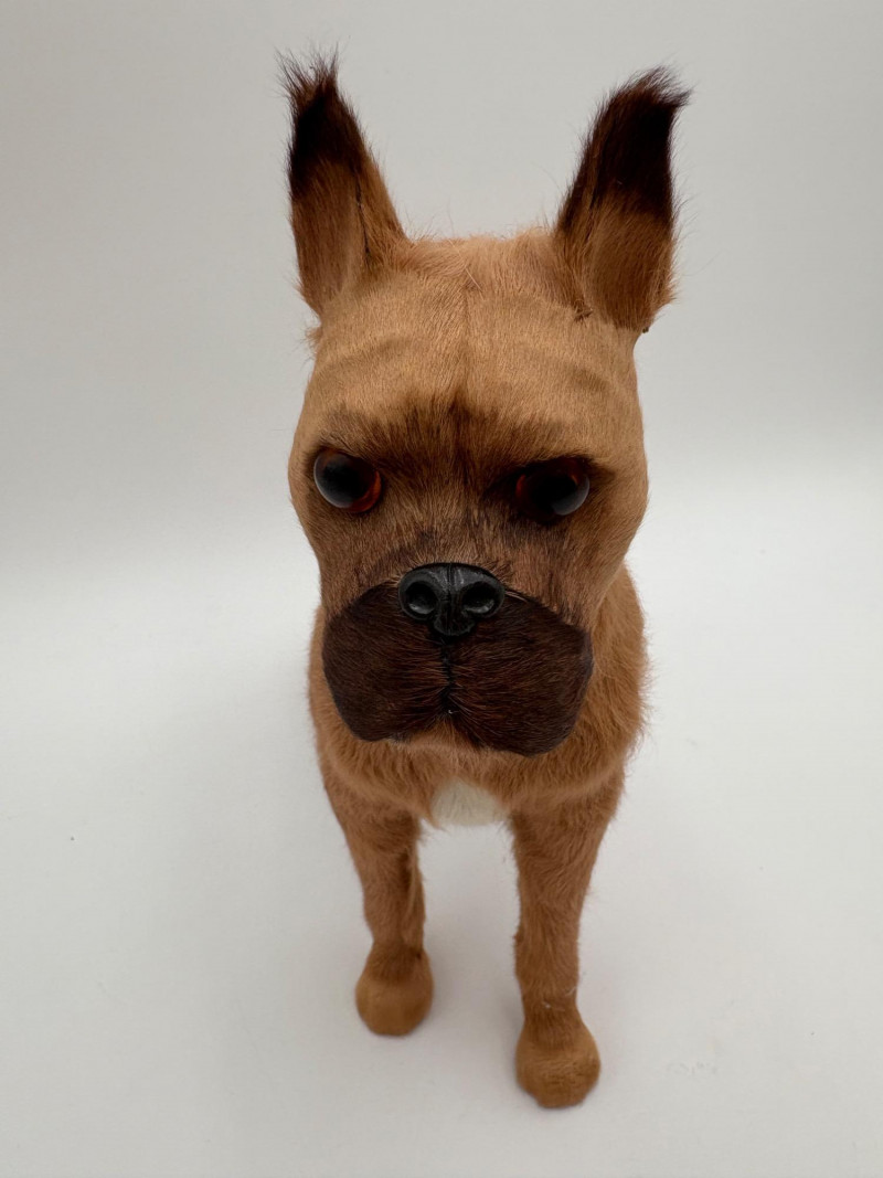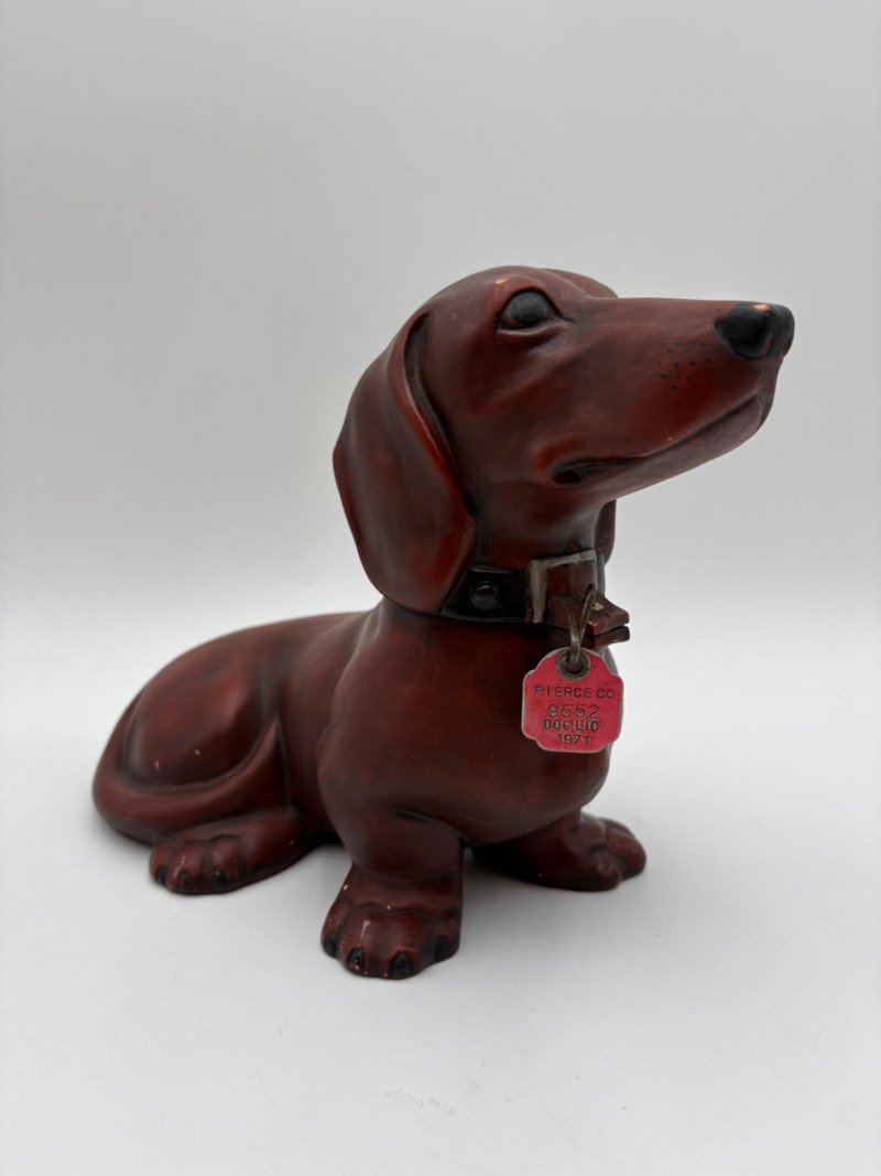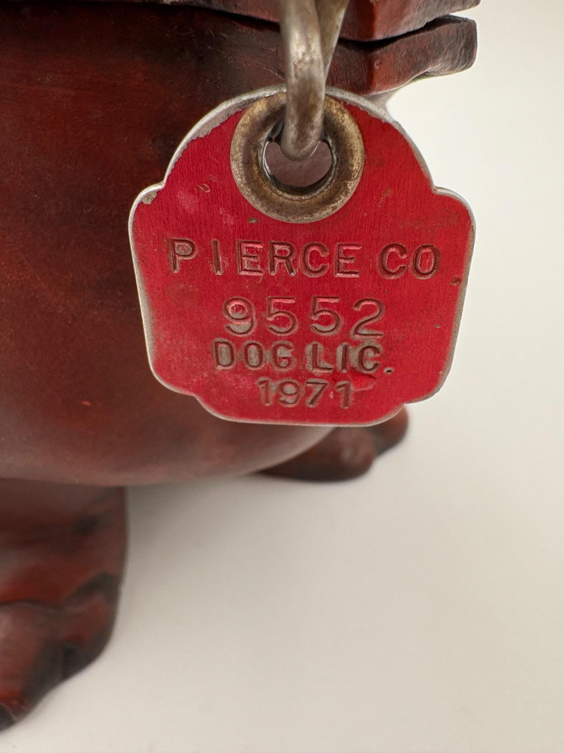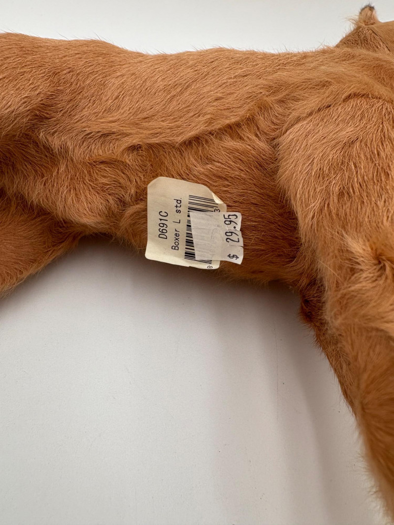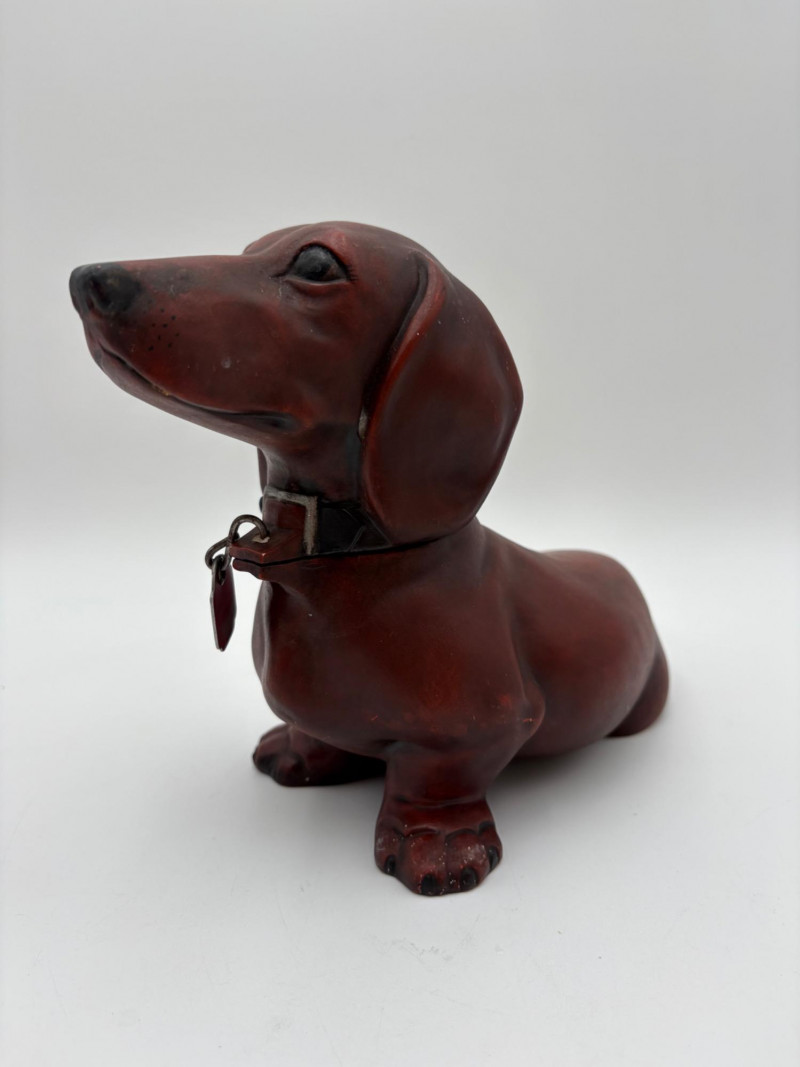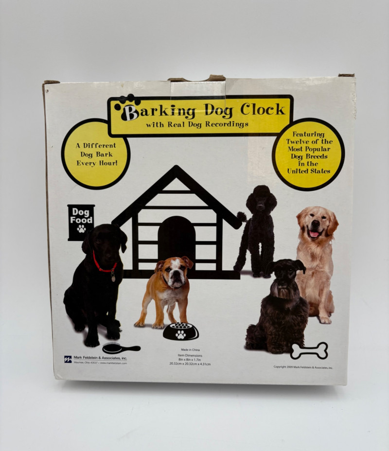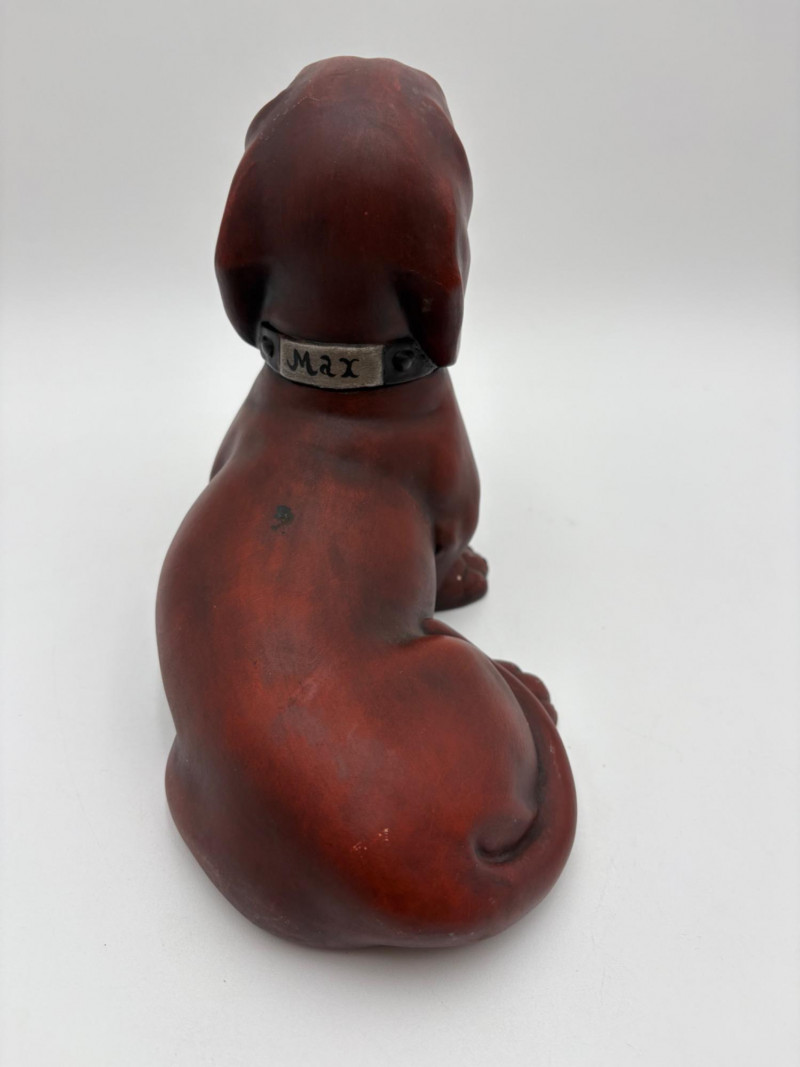 All things dog - vintage and not! - Barking dog clock - a different bark for each hour. We are not sure who wants to wake up to a barking dog, but different strokes for different folks. The clock is new & unused (still attached to its cardboard package) and when we inserted 3 AA batteries it does make barking sounds. Measures approx. 8" W. - Large boxer dog figure whose fur feels real & is super soft. Measures approx. 12" H. - Vintage cream & brown ceramic dog. Measures approx. 3" H. - Dog cosmetic bag. New & unused, but a couple of "sparkles" on one side at the collar missing (see last photo.) measures approx. 8" H x 12" W. - Clear glass dog figure measures approx. 3.5' H. - Cast resin Pomeranian figure measures approx. 4" H. Appears to be new. - Large vintage ceramic Dachshund named "Max" with Pierce Country license tag from 1971. Measures approx. 8" H x 11" L. - 3 dog accessories - a set of Christmas Boxer pins from Betsey Johnson, a plastic dog keychain, and a stretch Christmas dog bracelet.