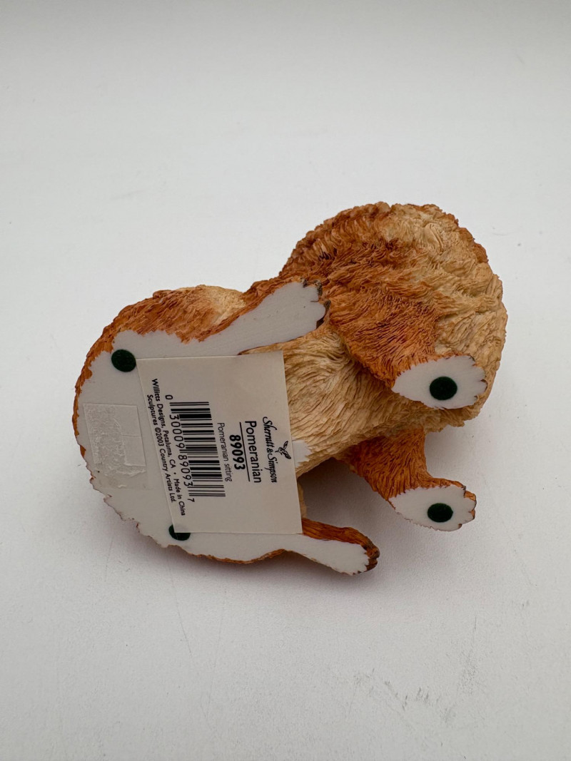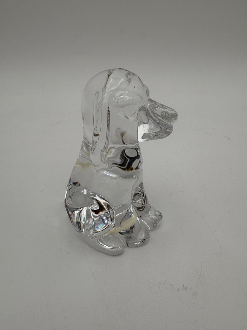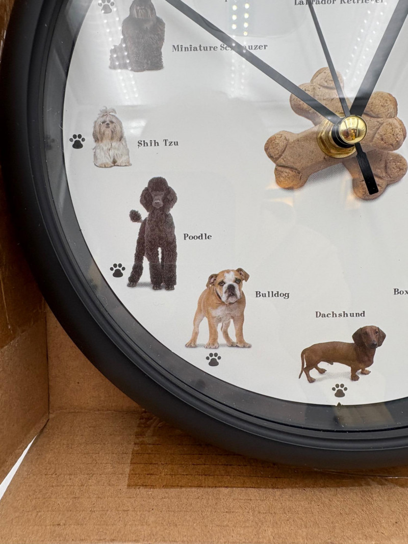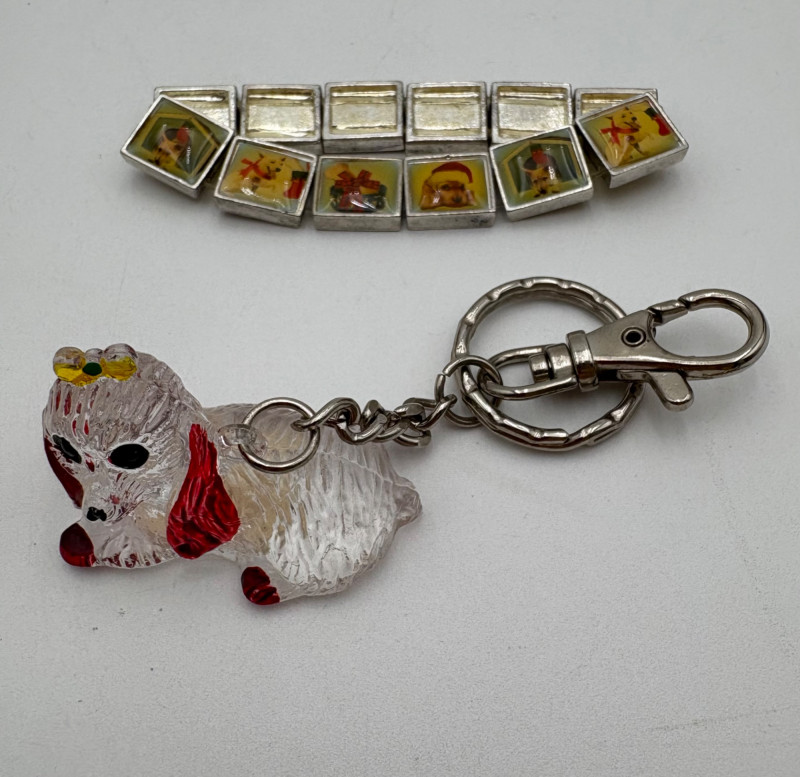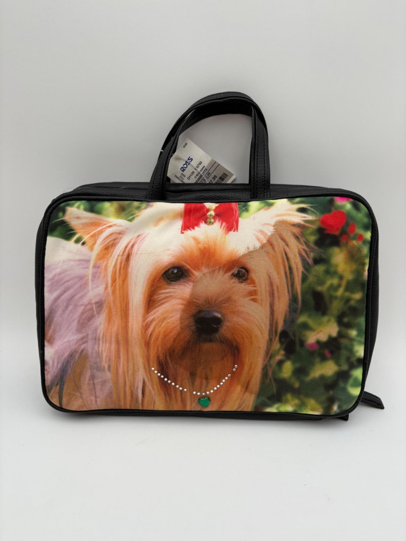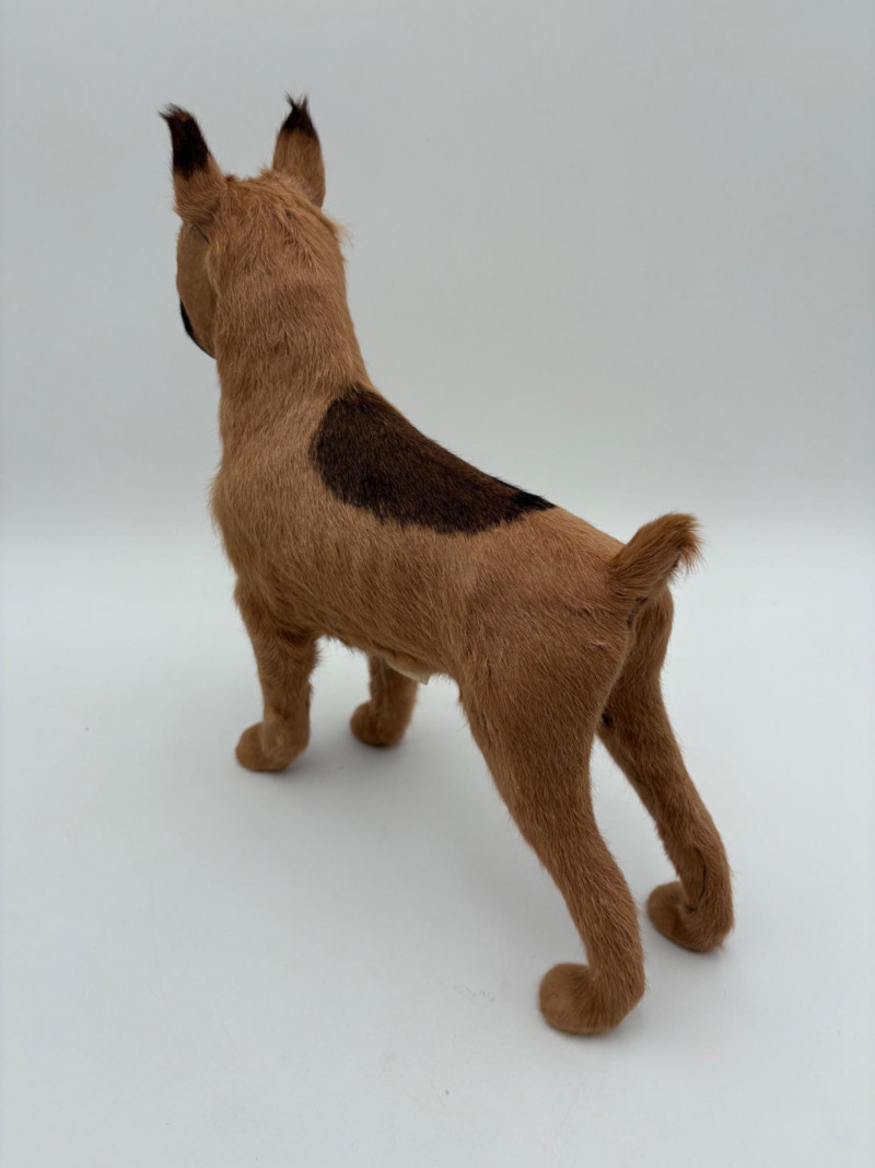All things dog - vintage and not! - Barking dog clock - a different bark for each hour. We are not sure who wants to wake up to a barking dog, but different strokes for different folks. The clock is new & unused (still attached to its cardboard package) and when we inserted 3 AA batteries it does make barking sounds. Measures approx. 8" W. - Large boxer dog figure whose fur feels real & is super soft. Measures approx. 12" H. - Vintage cream & brown ceramic dog. Measures approx. 3" H. - Dog cosmetic bag. New & unused, but a couple of "sparkles" on one side at the collar missing (see last photo.) measures approx. 8" H x 12" W. - Clear glass dog figure measures approx. 3.5' H. - Cast resin Pomeranian figure measures approx. 4" H. Appears to be new. - Large vintage ceramic Dachshund named "Max" with Pierce Country license tag from 1971. Measures approx. 8" H x 11" L. - 3 dog accessories - a set of Christmas Boxer pins from Betsey Johnson, a plastic dog keychain, and a stretch Christmas dog bracelet.