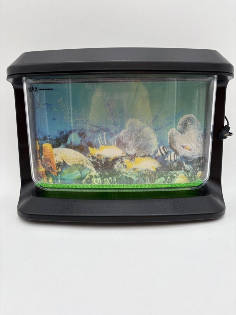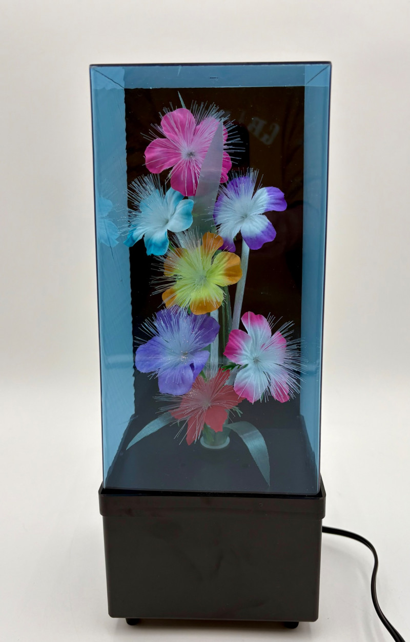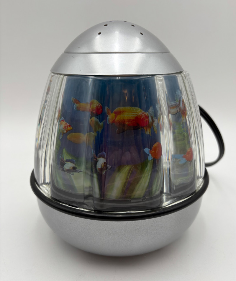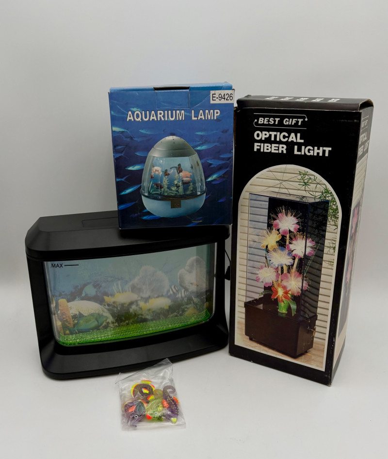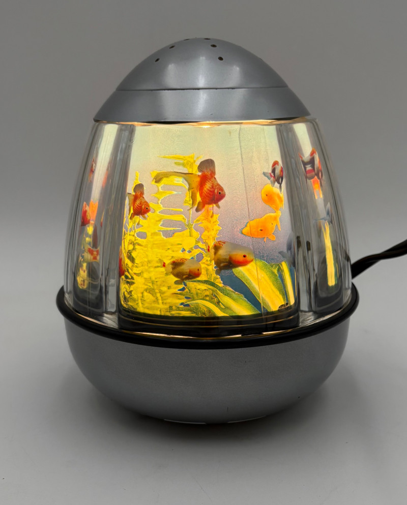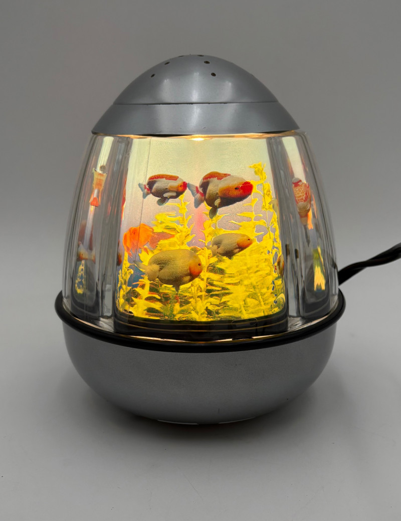 3 blast from the past retro lamps with moving items. All appear to be unused given the packaging and we are guessing they are at minimum 20 years old (probably older). - Fiber optic vase of flowers changes colors and - wait for it - also doubles as a music box (Twinkle Twinkle Little Star)! Light works on a 2-prong cord with on/off switch while music is wind-up. Measures approx. 14" H. - "Rotating" aquarium lamp from Quickiny looks like an egg set on its end and has backlit faux fish that appear to be swimming. Runs on a 2-prong cord with on/off switch. Measures approx. 6" H. . - Real aquarium lamp (you have to add water) that has moving fish. The fish are plastic, so you never have to clean the tank! The exterior box is missing for this item, but it was in its original bag wrap (we had to open it to photograph) and has all pieces noted on the included instructions. Measures approx. 8" H x 12" W x 4" D. Note that we were unable to test this item as we didn't want to add the water and then have to drain the thing & repack when wet.