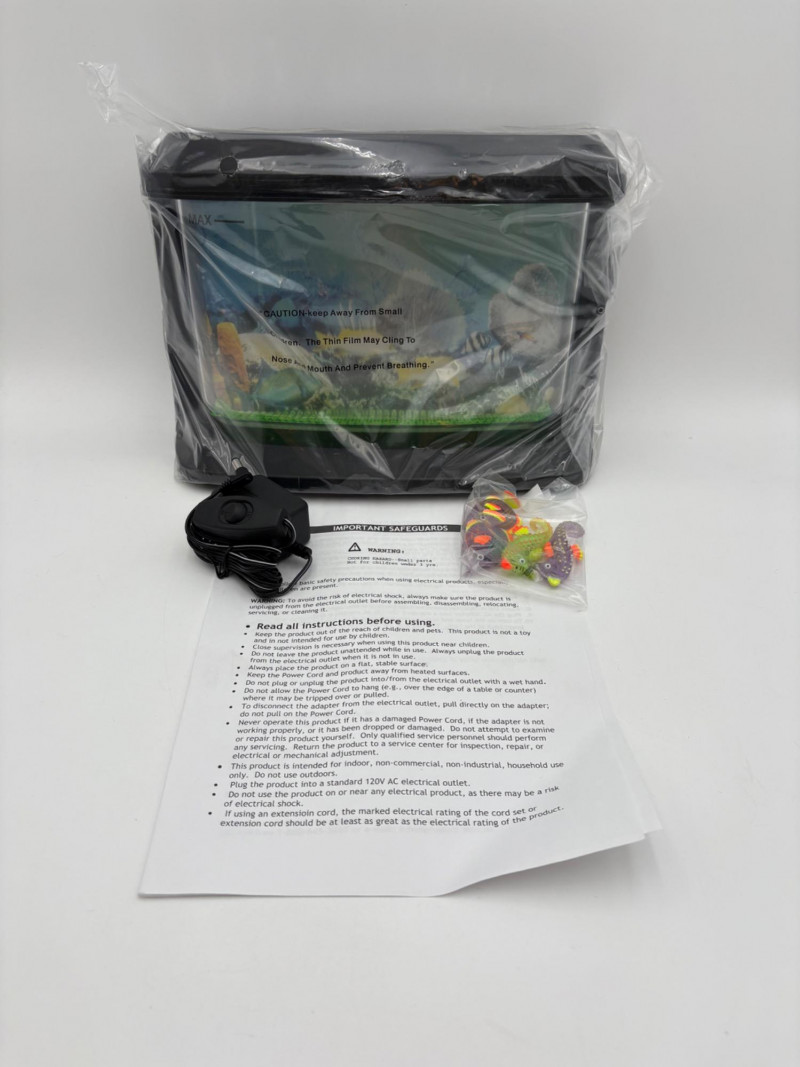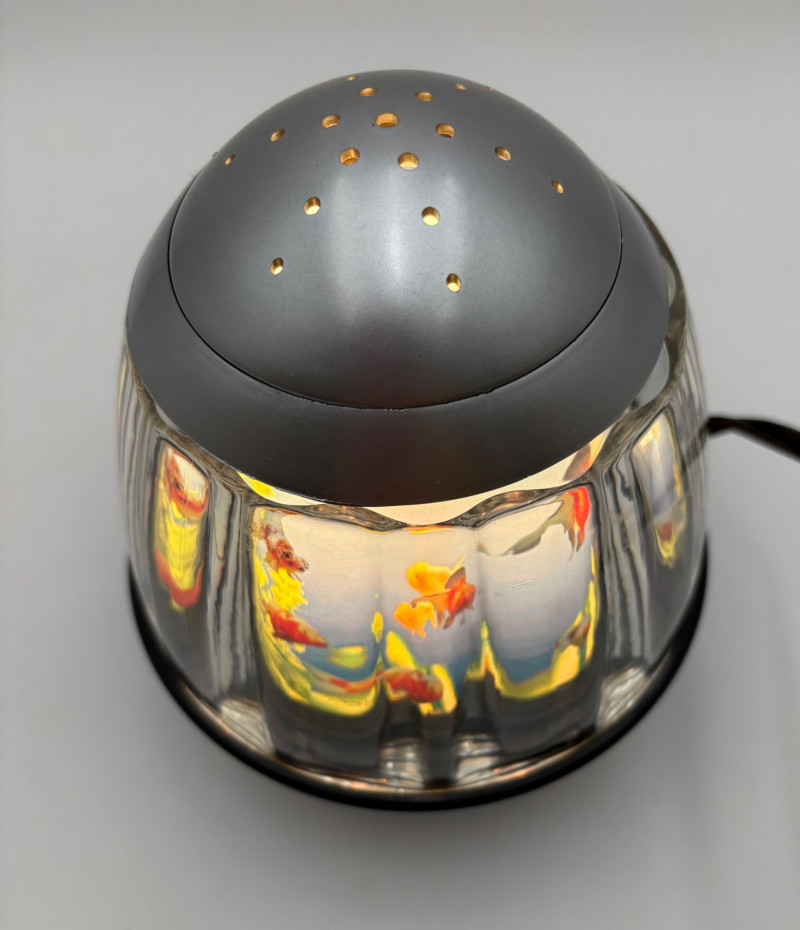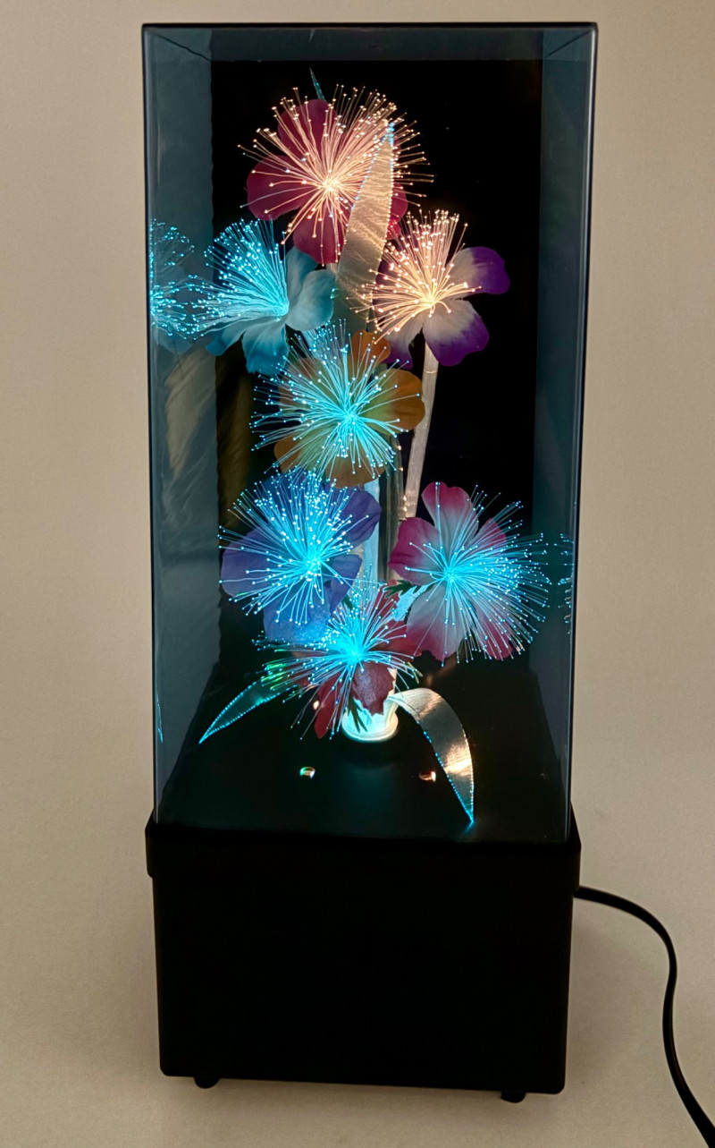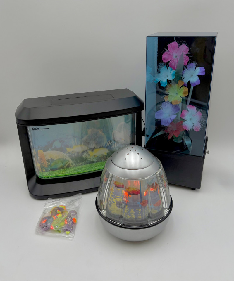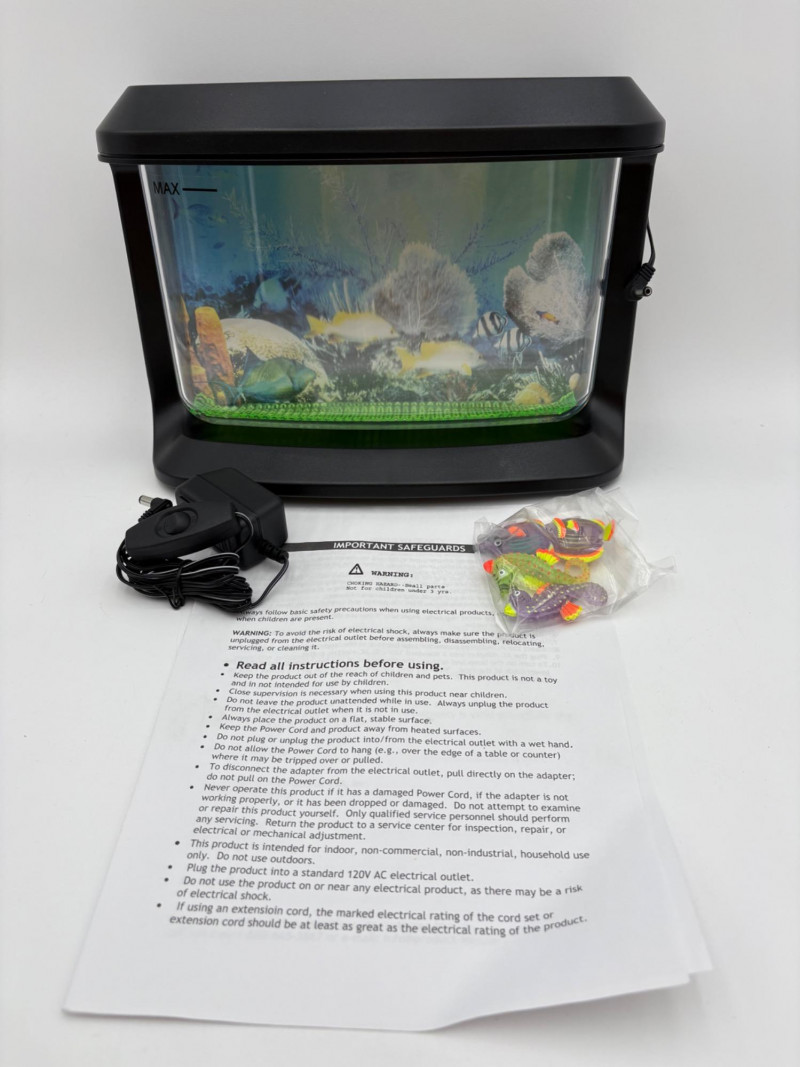 3 blast from the past retro lamps with moving items. All appear to be unused given the packaging and we are guessing they are at minimum 20 years old (probably older). - Fiber optic vase of flowers changes colors and - wait for it - also doubles as a music box (Twinkle Twinkle Little Star)! Light works on a 2-prong cord with on/off switch while music is wind-up. Measures approx. 14" H. - "Rotating" aquarium lamp from Quickiny looks like an egg set on its end and has backlit faux fish that appear to be swimming. Runs on a 2-prong cord with on/off switch. Measures approx. 6" H. . - Real aquarium lamp (you have to add water) that has moving fish. The fish are plastic, so you never have to clean the tank! The exterior box is missing for this item, but it was in its original bag wrap (we had to open it to photograph) and has all pieces noted on the included instructions. Measures approx. 8" H x 12" W x 4" D. Note that we were unable to test this item as we didn't want to add the water and then have to drain the thing & repack when wet.