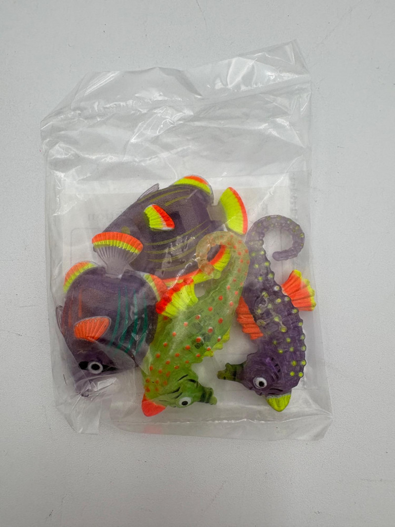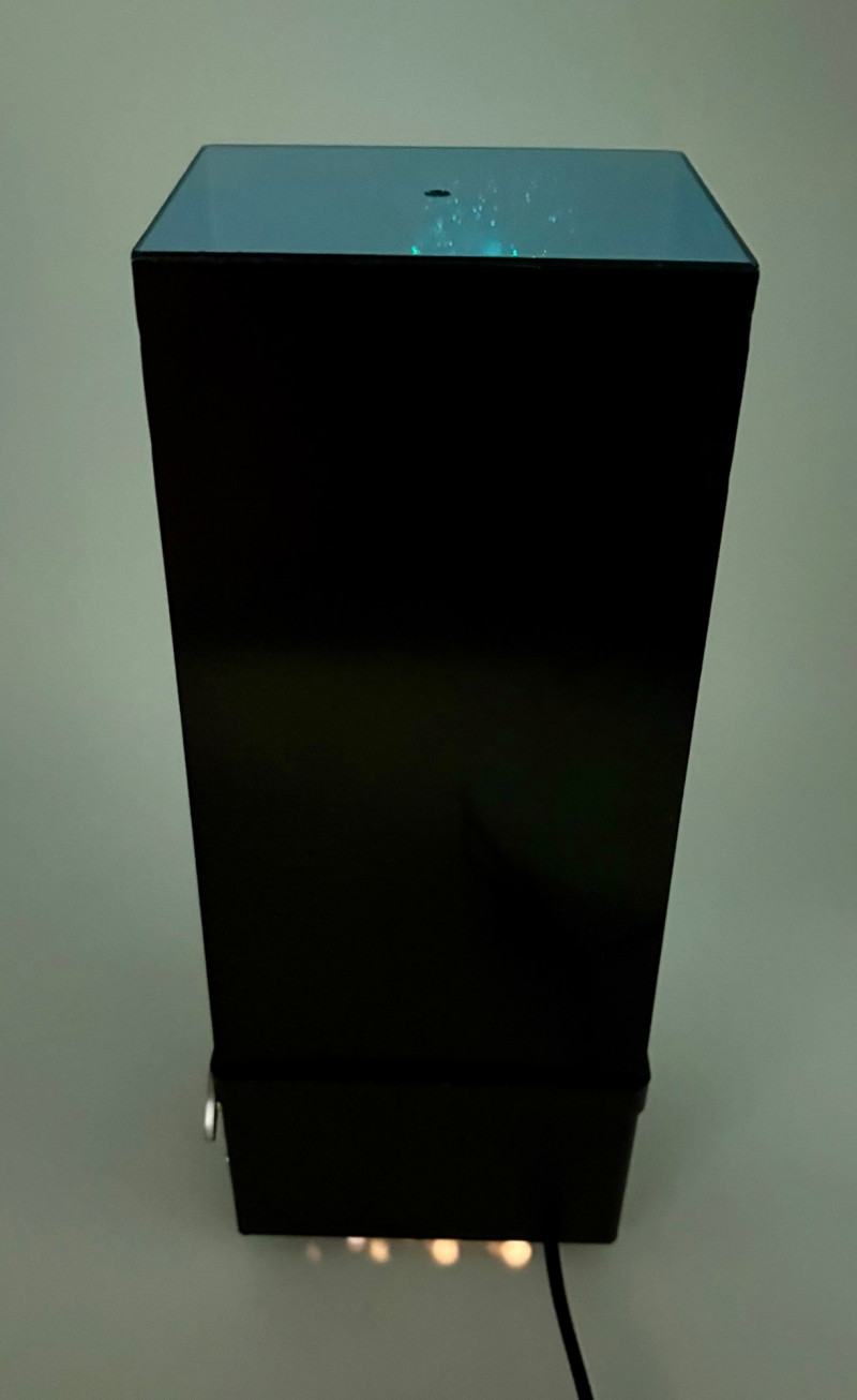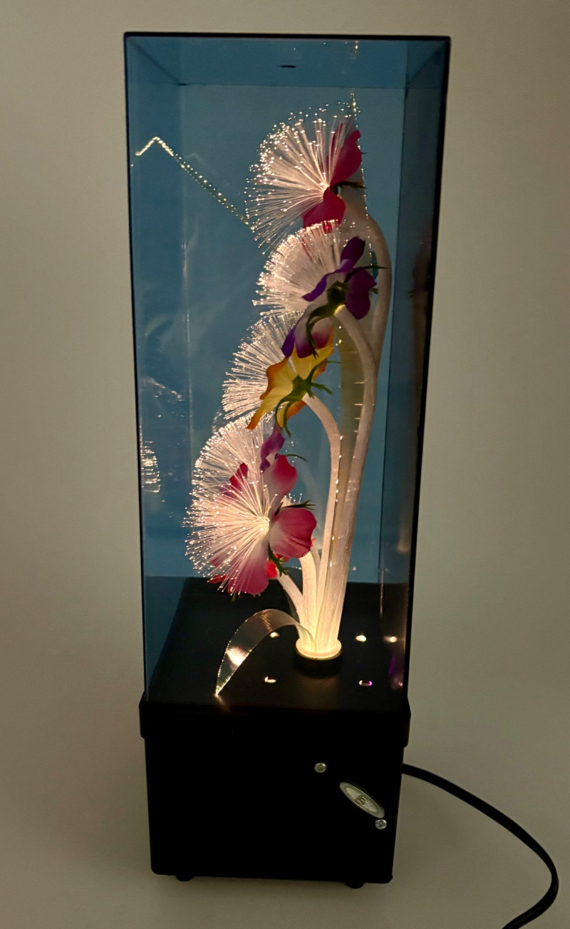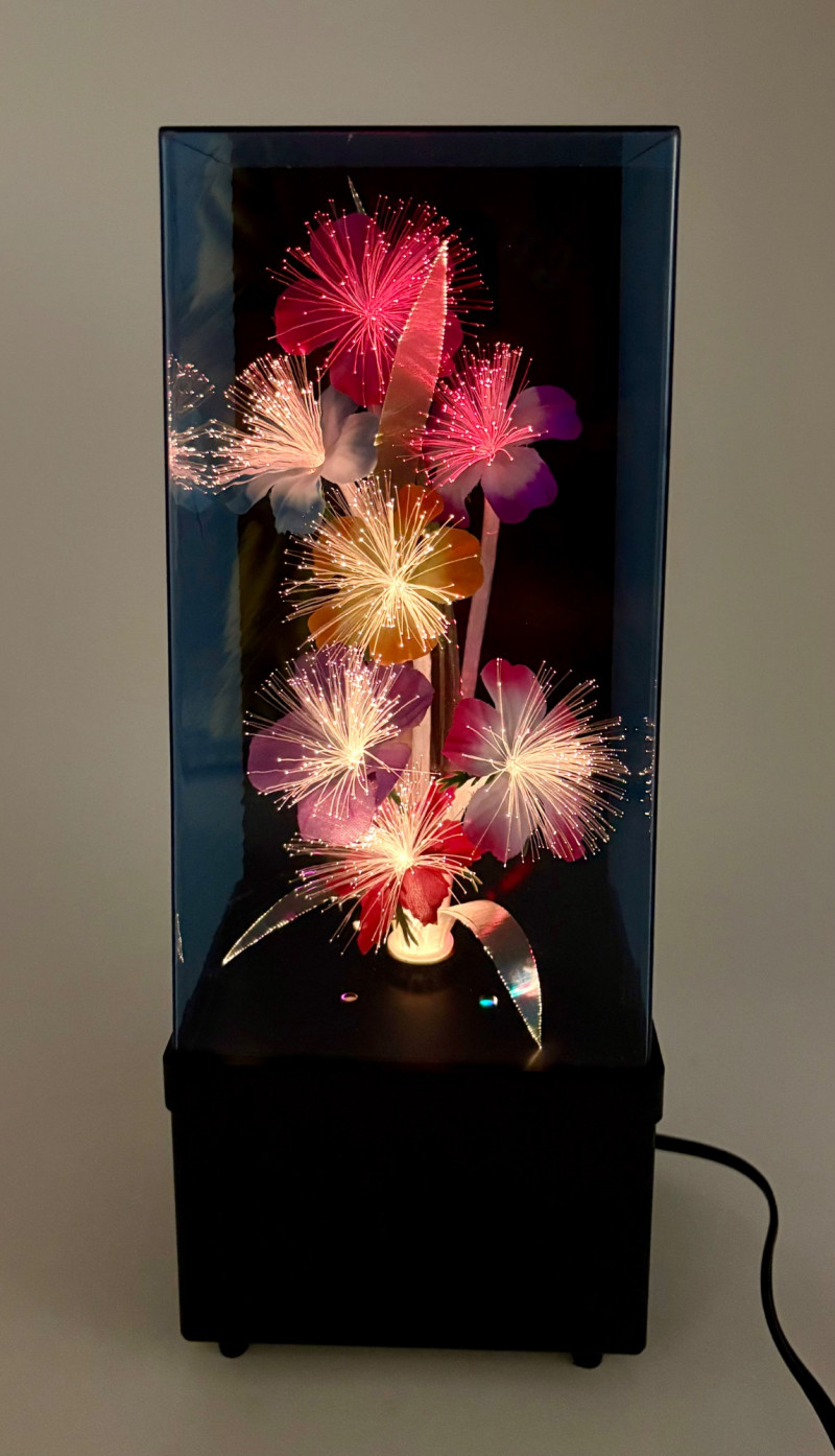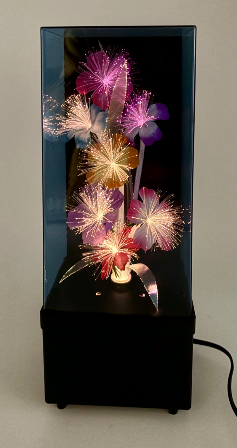 3 blast from the past retro lamps with moving items. All appear to be unused given the packaging and we are guessing they are at minimum 20 years old (probably older). - Fiber optic vase of flowers changes colors and - wait for it - also doubles as a music box (Twinkle Twinkle Little Star)! Light works on a 2-prong cord with on/off switch while music is wind-up. Measures approx. 14" H. - "Rotating" aquarium lamp from Quickiny looks like an egg set on its end and has backlit faux fish that appear to be swimming. Runs on a 2-prong cord with on/off switch. Measures approx. 6" H. . - Real aquarium lamp (you have to add water) that has moving fish. The fish are plastic, so you never have to clean the tank! The exterior box is missing for this item, but it was in its original bag wrap (we had to open it to photograph) and has all pieces noted on the included instructions. Measures approx. 8" H x 12" W x 4" D. Note that we were unable to test this item as we didn't want to add the water and then have to drain the thing & repack when wet.