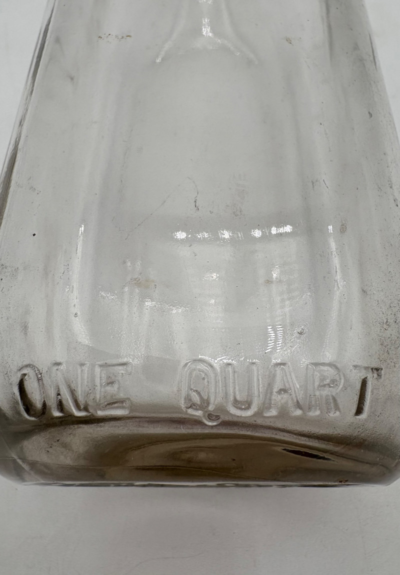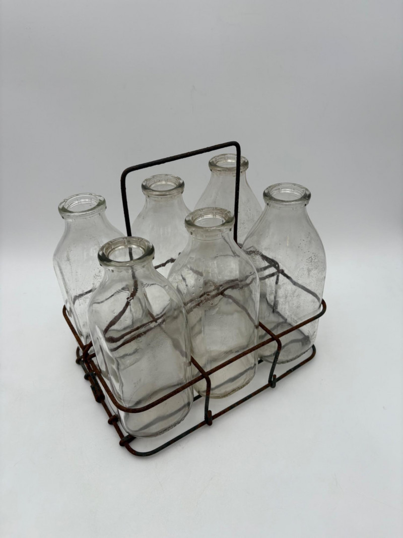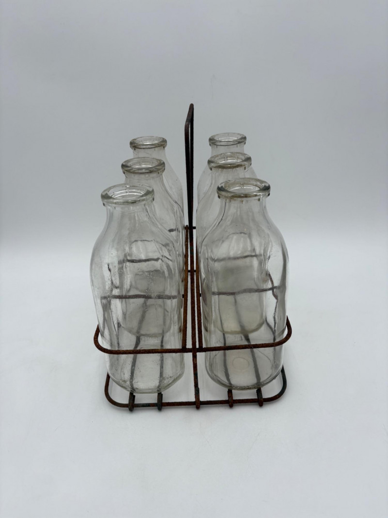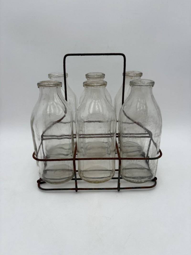 Got Milk? Wonderful half dozen antique milk bottles in heavy glass. Given that this kind of container was phased out by the 1960s, we are guessing they are pre-1950s. They are in excellent condition with no cracks or chips! The glass is labeled "1 Quart", "Sealed L.G.""Liquid", and "773-6 Reg." along the bottom edge. Bottles measure approx. 9" H. Come with (rusty) carry rack.