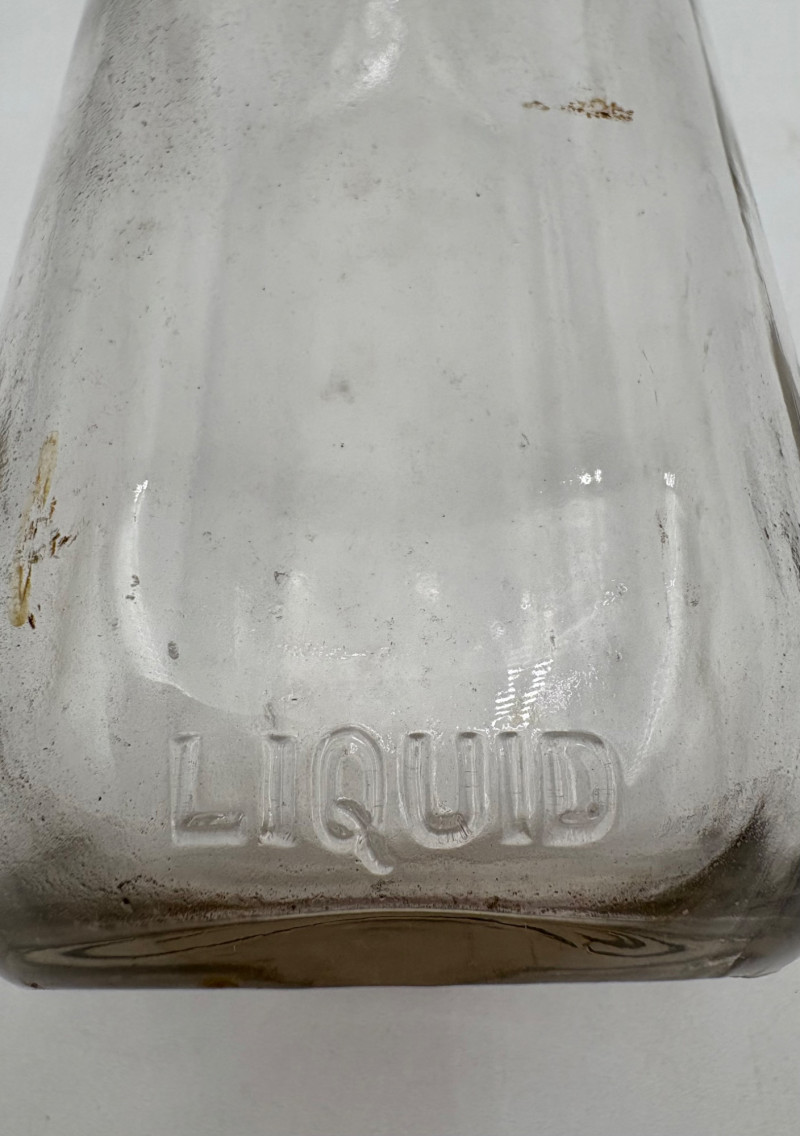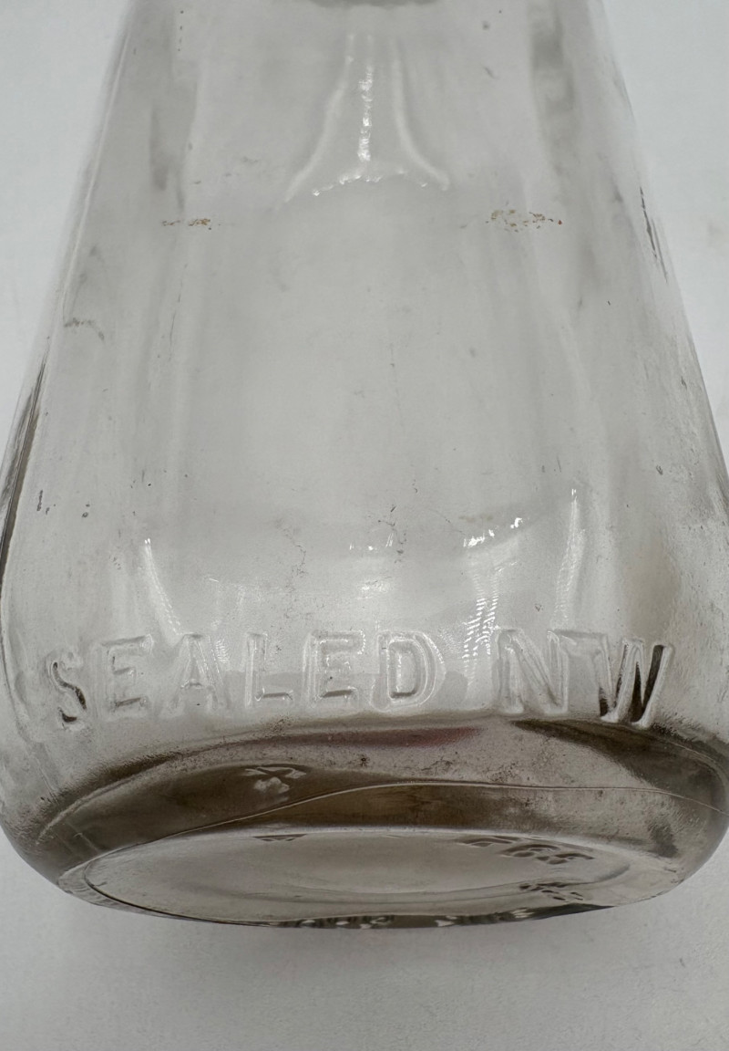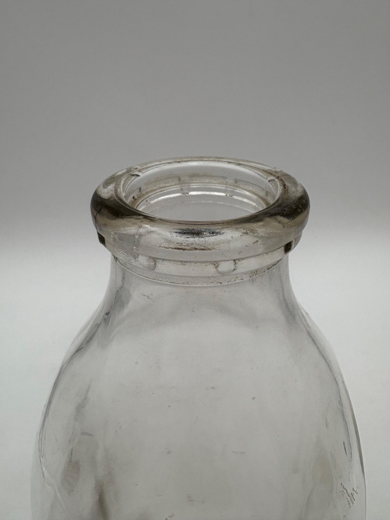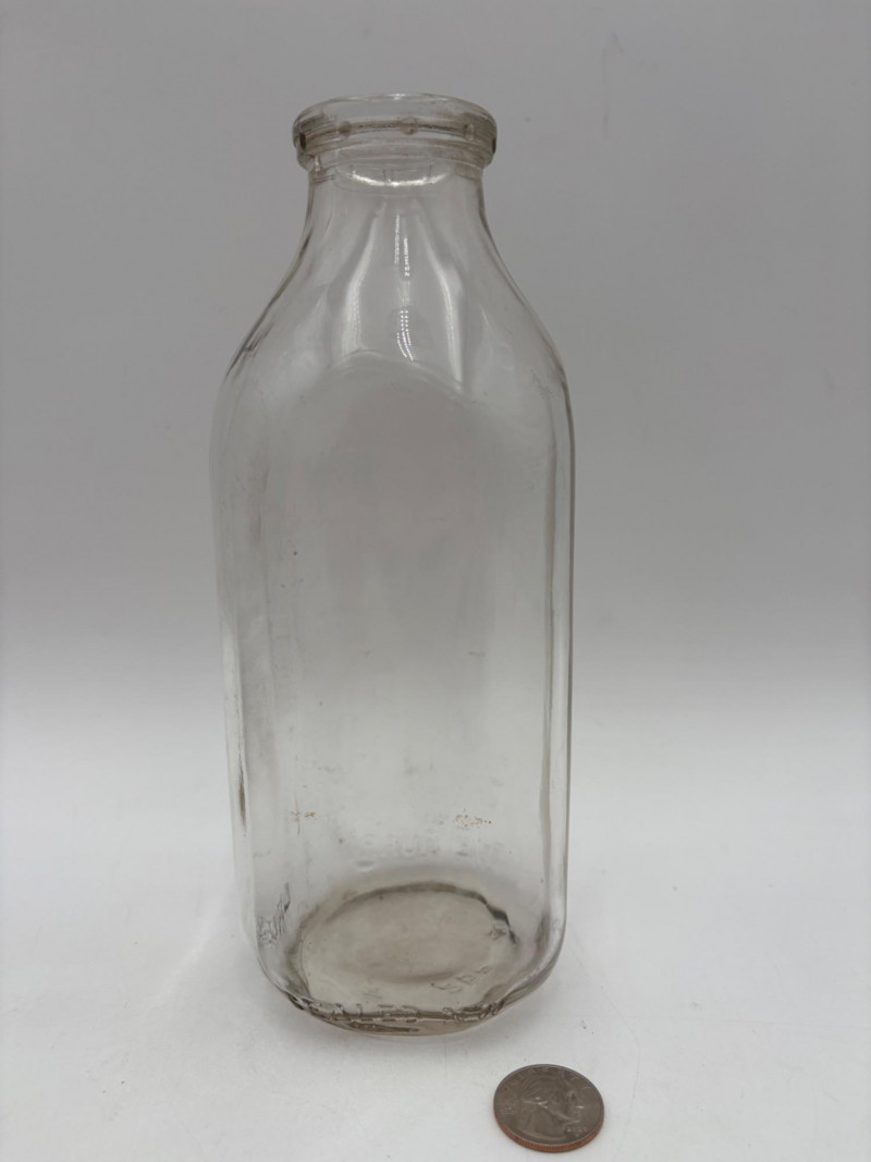 Got Milk? Wonderful half dozen antique milk bottles in heavy glass. Given that this kind of container was phased out by the 1960s, we are guessing they are pre-1950s. They are in excellent condition with no cracks or chips! The glass is labeled "1 Quart", "Sealed L.G.""Liquid", and "773-6 Reg." along the bottom edge. Bottles measure approx. 9" H. Come with (rusty) carry rack.