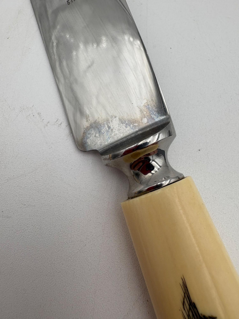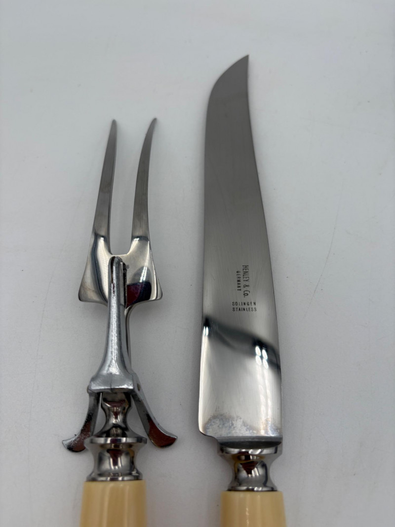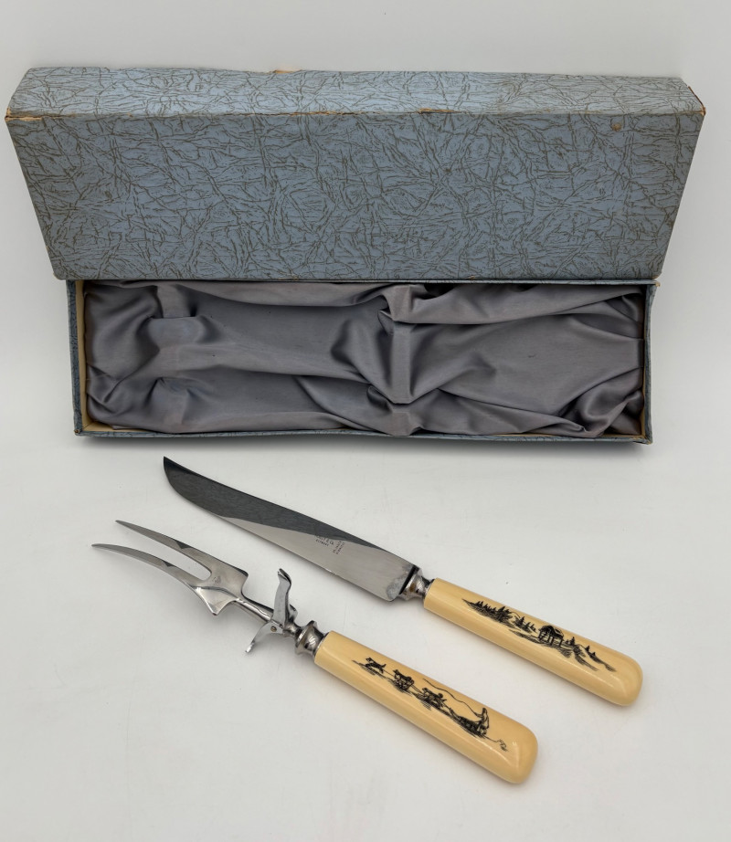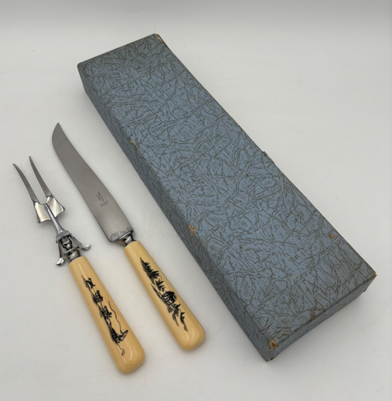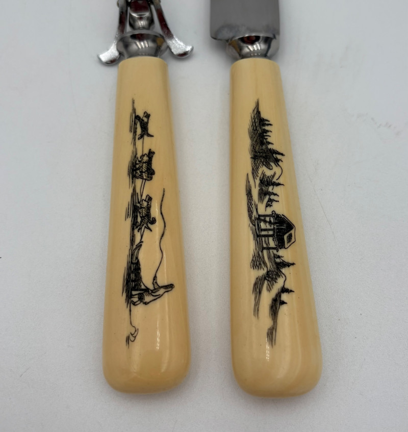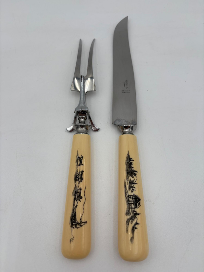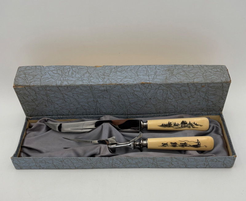Two lovely vintage/antique carving pieces perfect for the holiday turkey, roast, or ham. The knife and carving fork are of forged stainless steel from Henley & Co. of Germany. The handles appear to be bone with scrimshaw portraying a musher with a team of dogs (fork) and a woodland scene with a food cache (knife). They come with a blue satin-lined box - it appears this is the original box, but there are no identifying marks on it (box in fair to poor condition after years in storage). Pieces measure approx. 11" (fork) and 13" (knife). The knife blade has a very gorgeous slight curve to it and the fork has a built-in rest typical of 1950s/60s carving sets. They appear to be new or seldom used - we are guessing they are from the 1950s given the styling. The only slight flaw we see is a bit of tarnish at the base of the knife blade - see last photo.