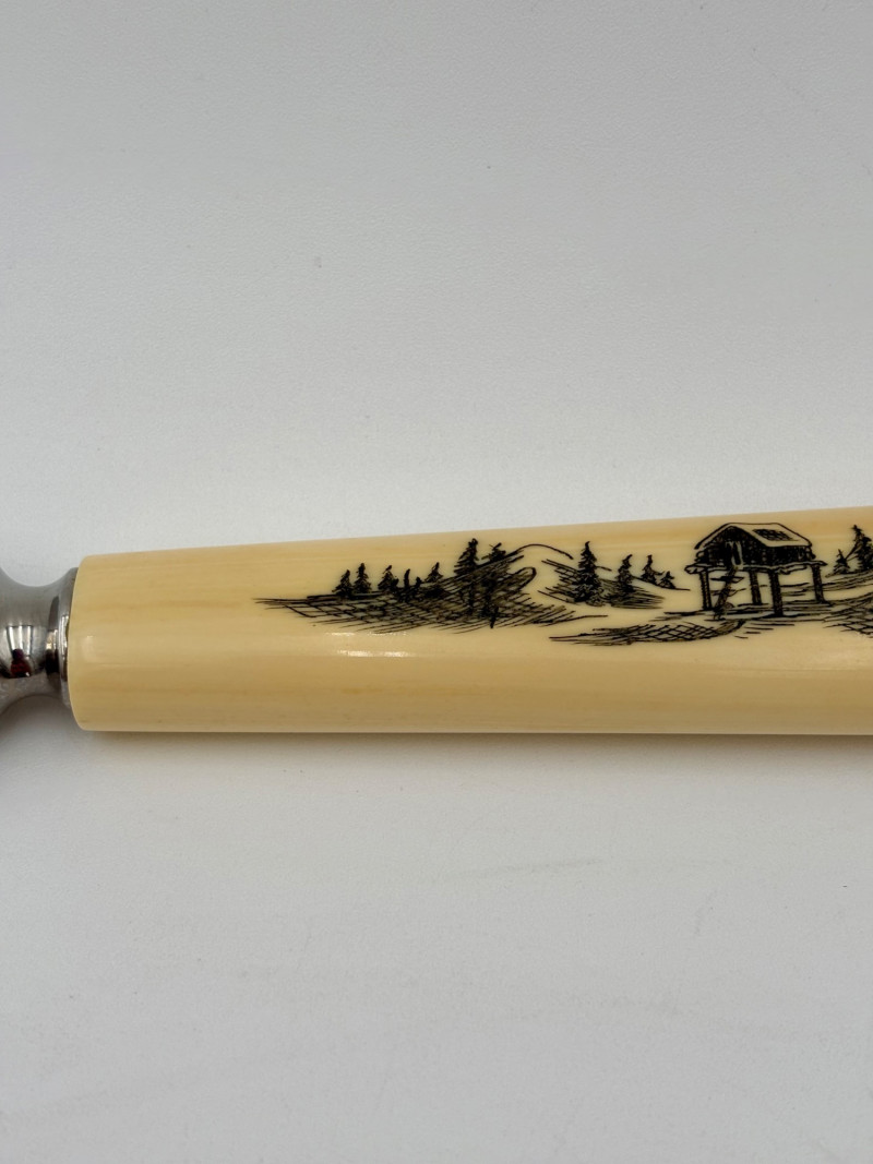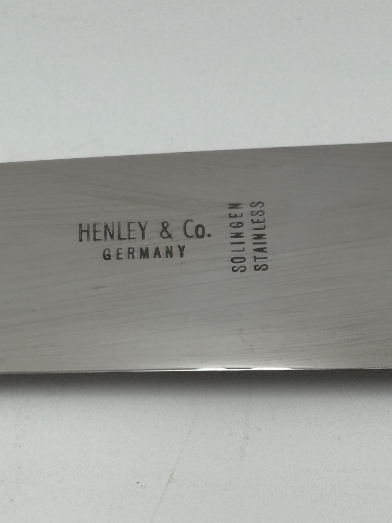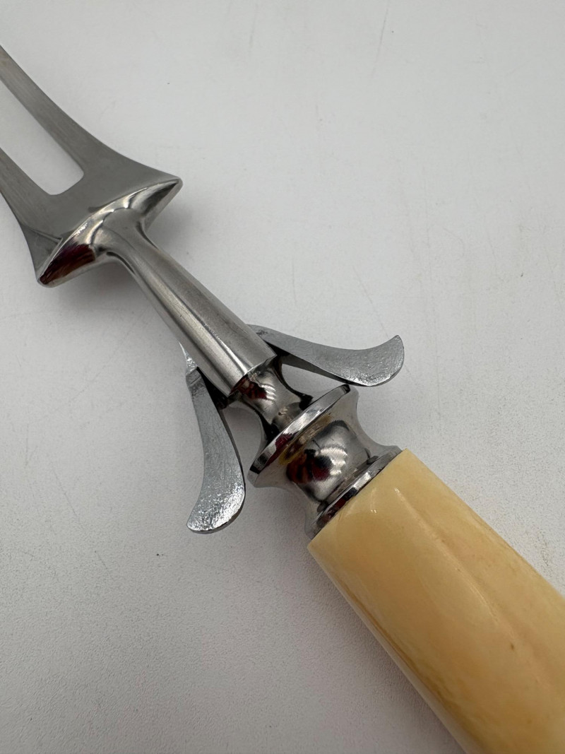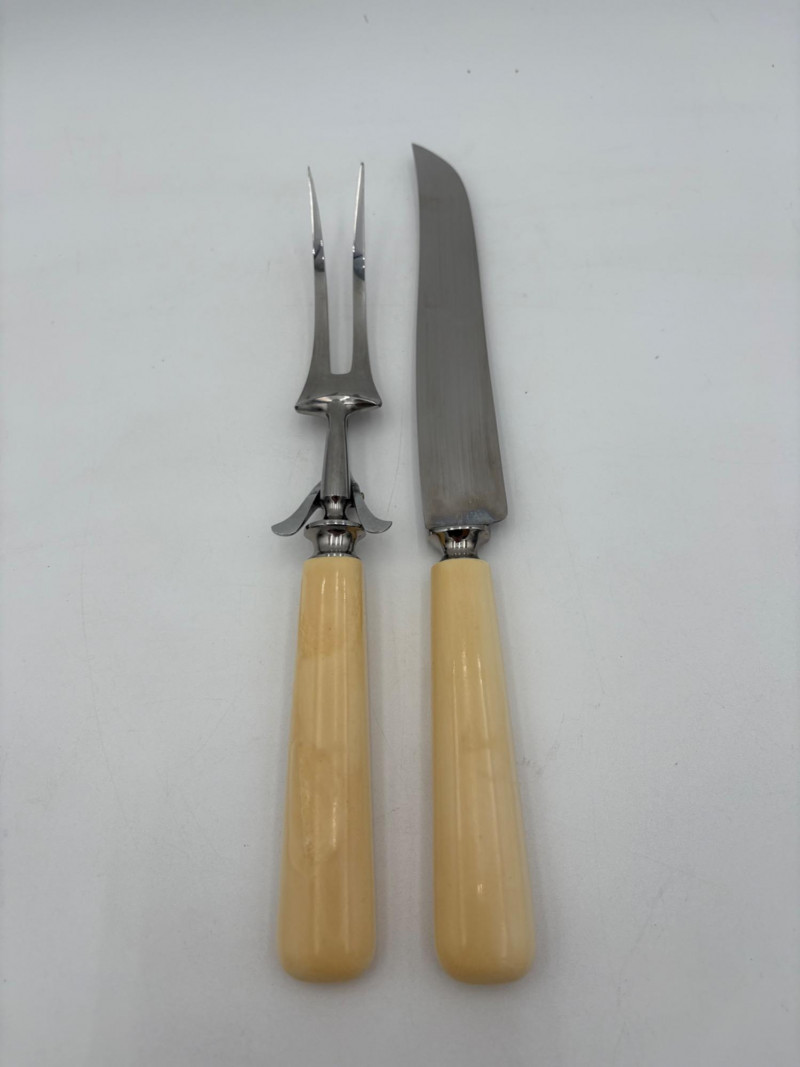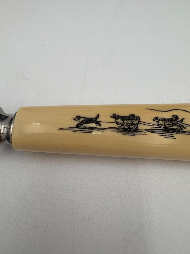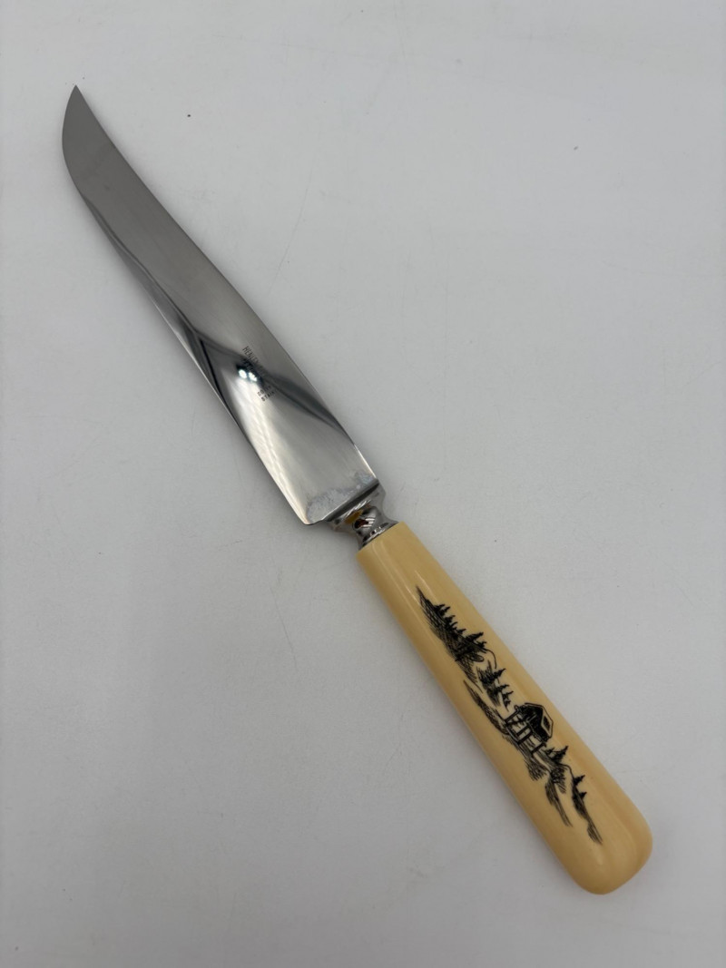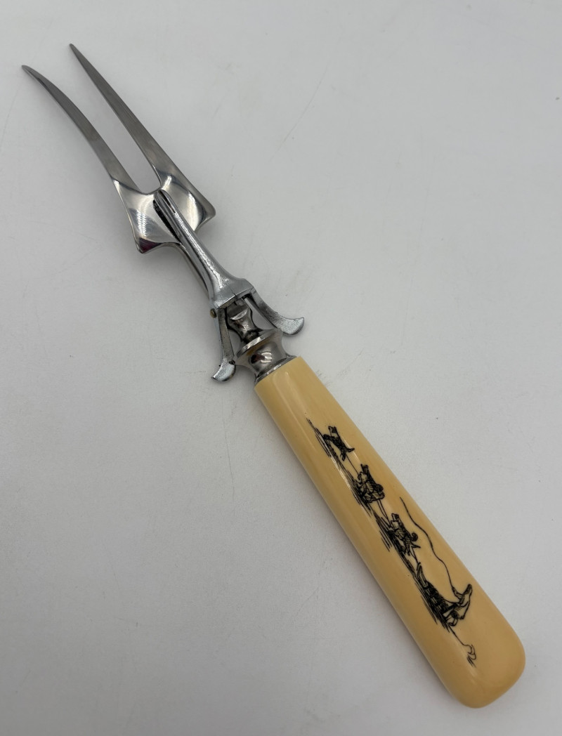 Two lovely vintage/antique carving pieces perfect for the holiday turkey, roast, or ham. The knife and carving fork are of forged stainless steel from Henley & Co. of Germany. The handles appear to be bone with scrimshaw portraying a musher with a team of dogs (fork) and a woodland scene with a food cache (knife). They come with a blue satin-lined box - it appears this is the original box, but there are no identifying marks on it (box in fair to poor condition after years in storage). Pieces measure approx. 11" (fork) and 13" (knife). The knife blade has a very gorgeous slight curve to it and the fork has a built-in rest typical of 1950s/60s carving sets. They appear to be new or seldom used - we are guessing they are from the 1950s given the styling. The only slight flaw we see is a bit of tarnish at the base of the knife blade - see last photo.