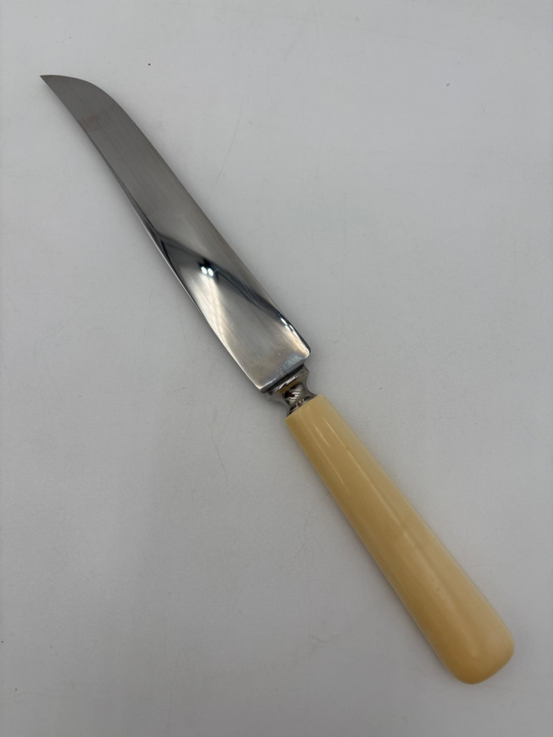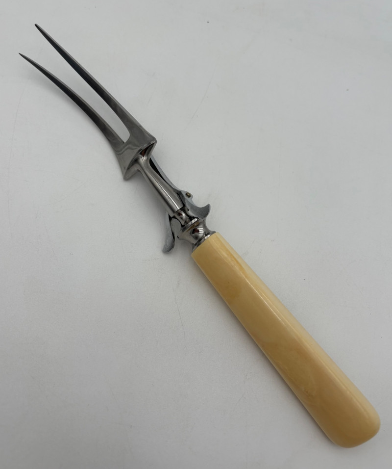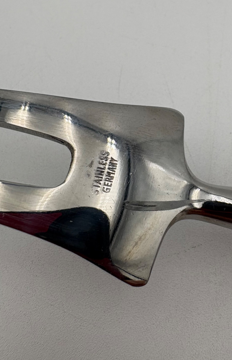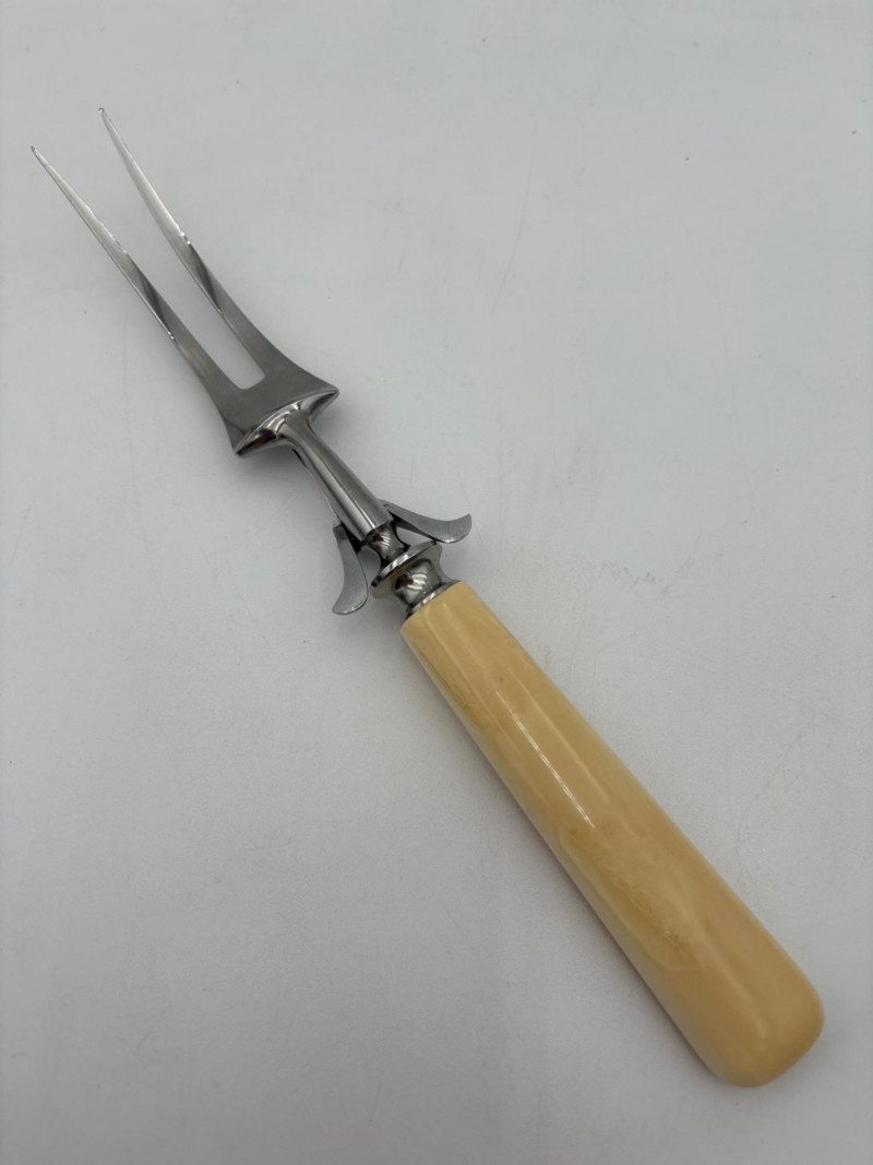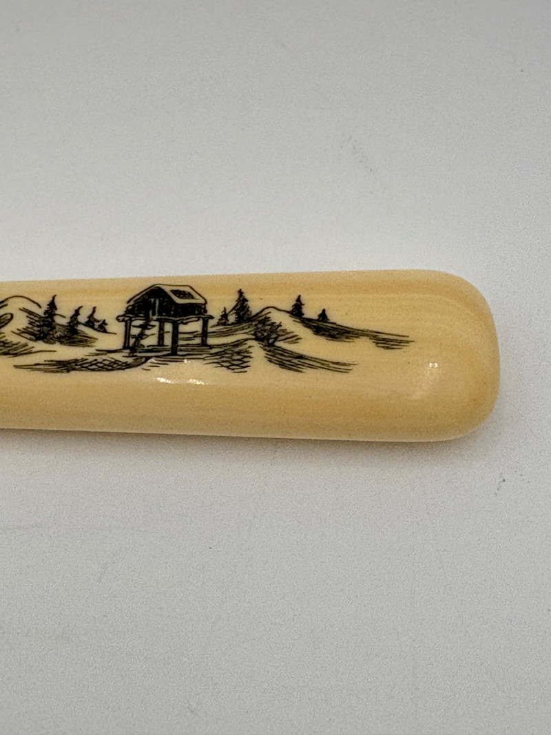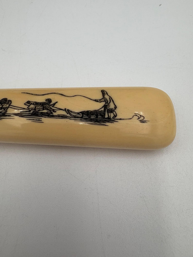 Two lovely vintage/antique carving pieces perfect for the holiday turkey, roast, or ham. The knife and carving fork are of forged stainless steel from Henley & Co. of Germany. The handles appear to be bone with scrimshaw portraying a musher with a team of dogs (fork) and a woodland scene with a food cache (knife). They come with a blue satin-lined box - it appears this is the original box, but there are no identifying marks on it (box in fair to poor condition after years in storage). Pieces measure approx. 11" (fork) and 13" (knife). The knife blade has a very gorgeous slight curve to it and the fork has a built-in rest typical of 1950s/60s carving sets. They appear to be new or seldom used - we are guessing they are from the 1950s given the styling. The only slight flaw we see is a bit of tarnish at the base of the knife blade - see last photo.