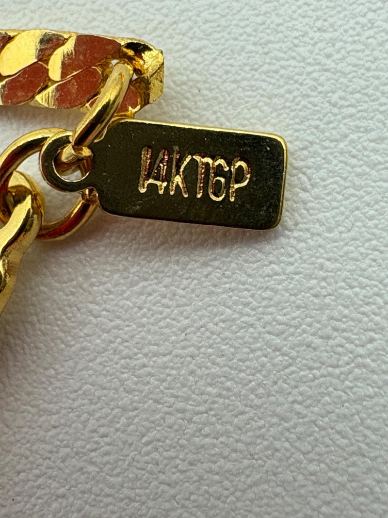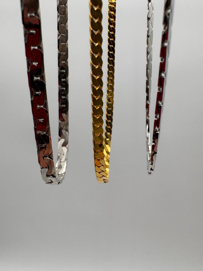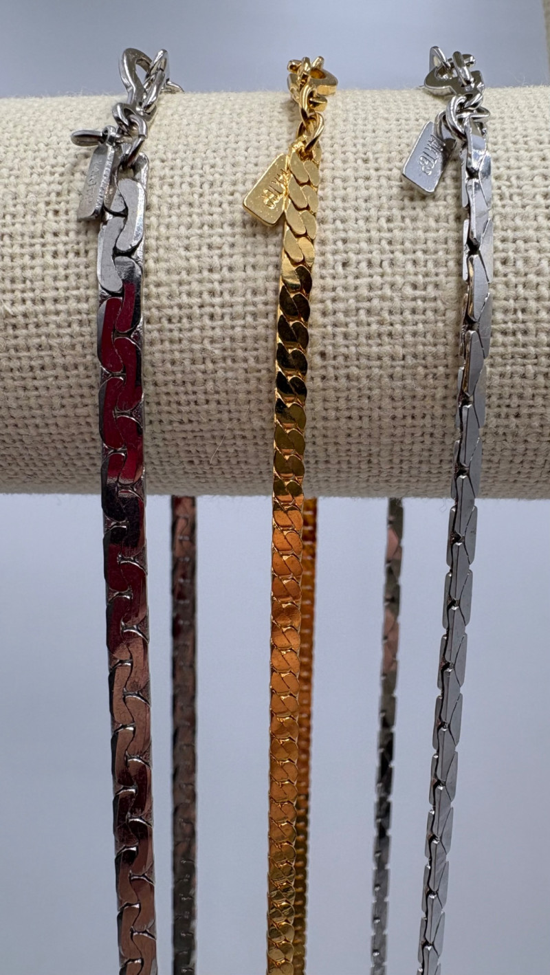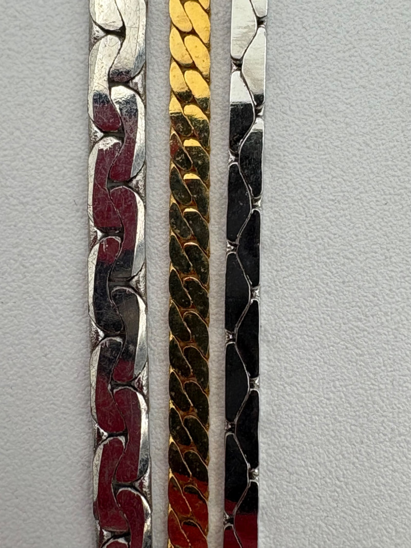 3 rings and 3 chains marked "14 K GP". The chains all measure 16' end to end and have slightly different patterns to the link. Please look closely at the photos for details.