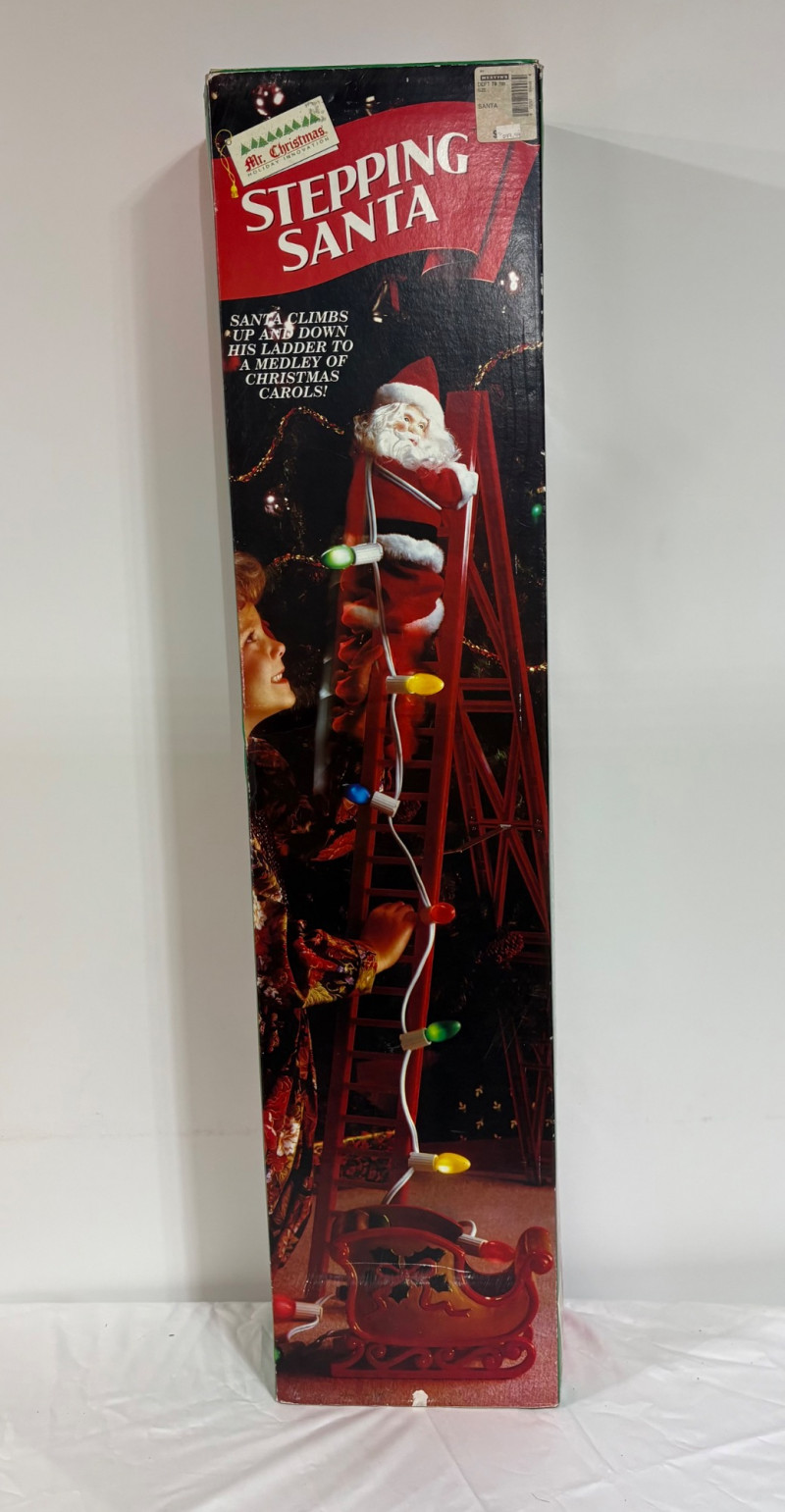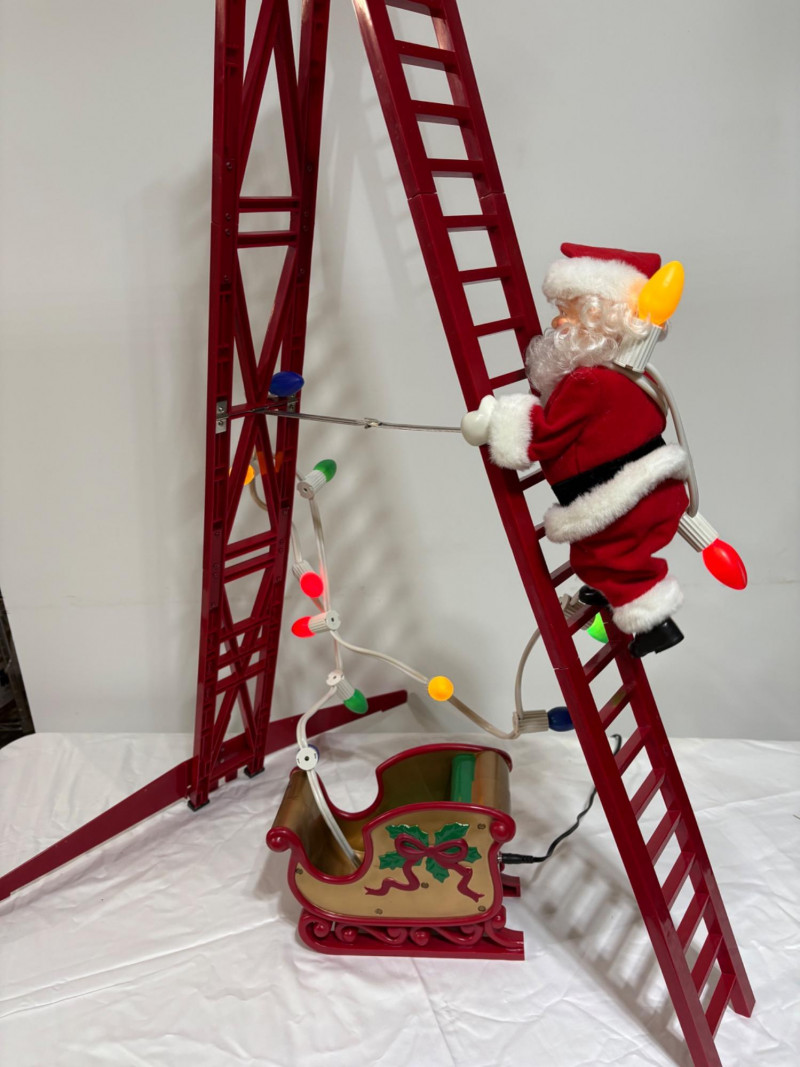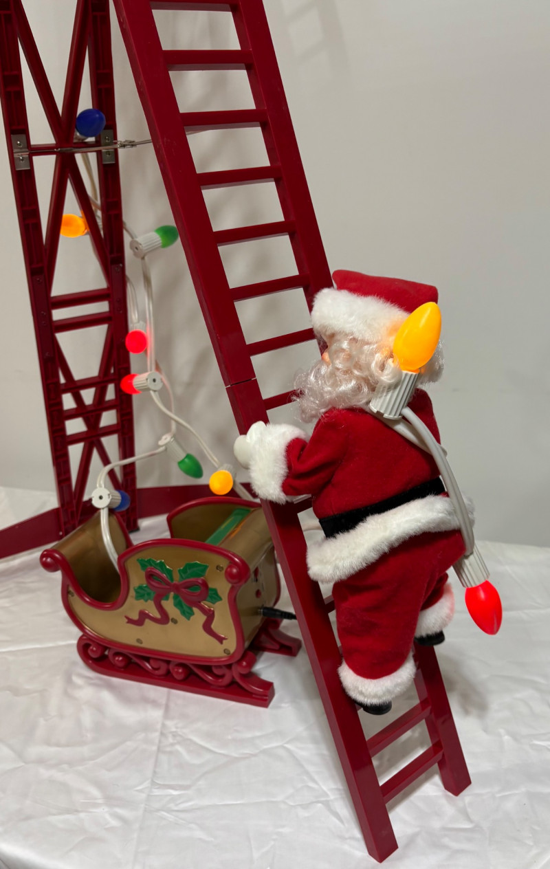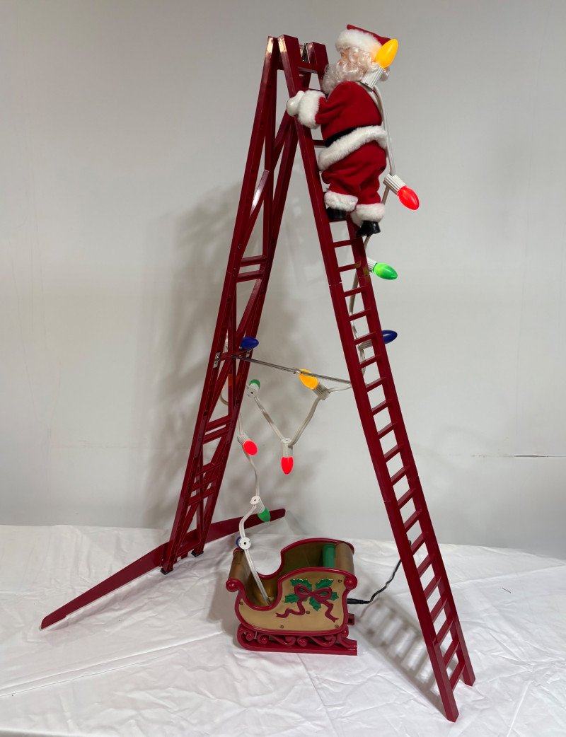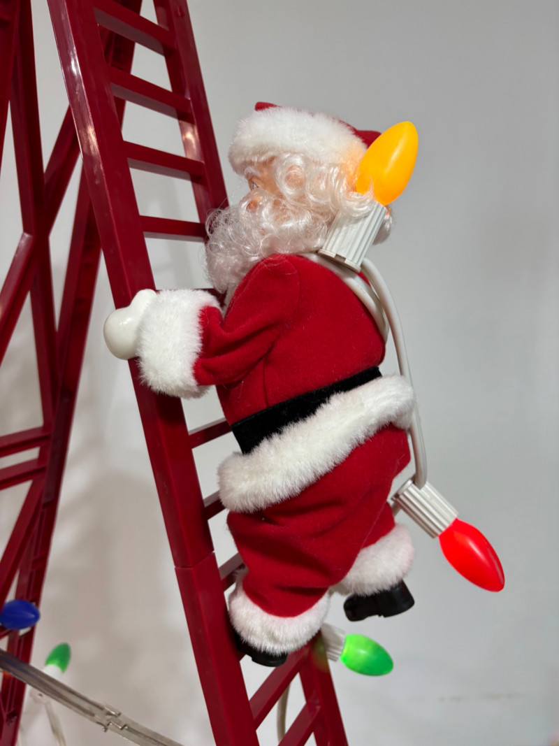 OK, this one from Mr. Christmas (1994) is just plain odd. It's a vintage animatronic Santa who measures about a foot tall and climbs up and down repeatedly on a giant 42" H ladder with his sleigh down below. He seems to work just fine but we’re not sure what the point is - maybe to make kids feel sorry for Santa climbing up and down from everyone’s chimney? Plays music while he hauls that string of lights up and down. Works on an adapter that is included. Note that a couple of the lights are out, but there are extra bulbs included to change them out. Sleigh measures about 7" H and the distance between the ladder bases is about 27". There are some more modern versions of this with a single leaning ladder, but this one appears to be from the early 1990s.