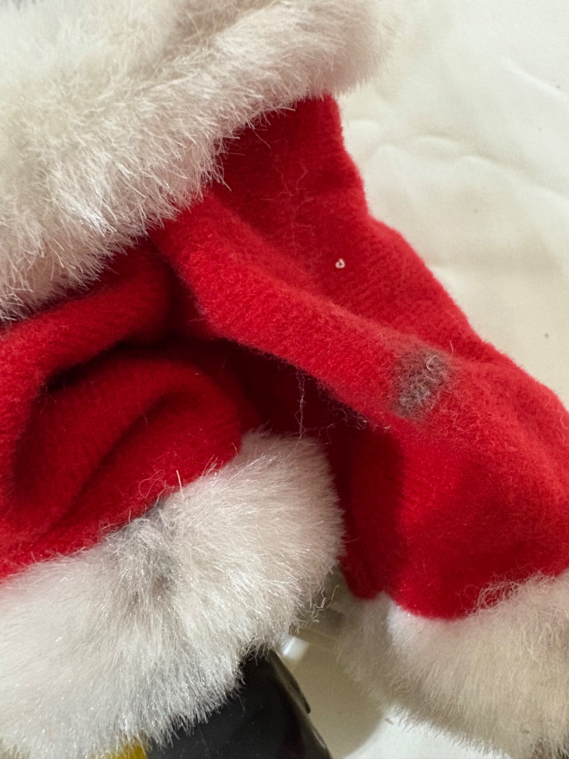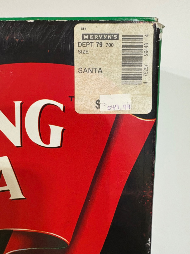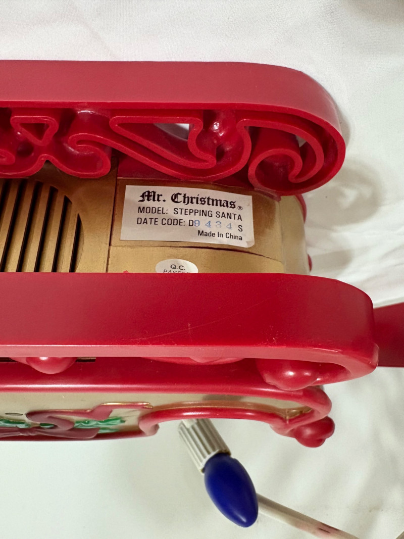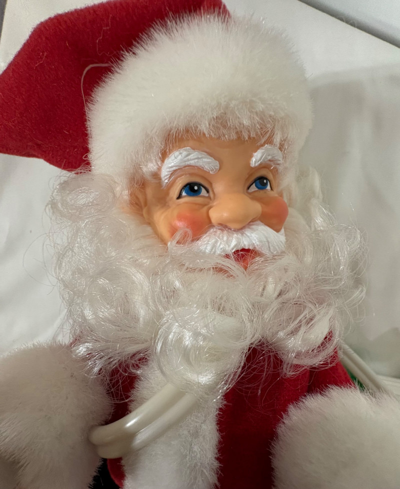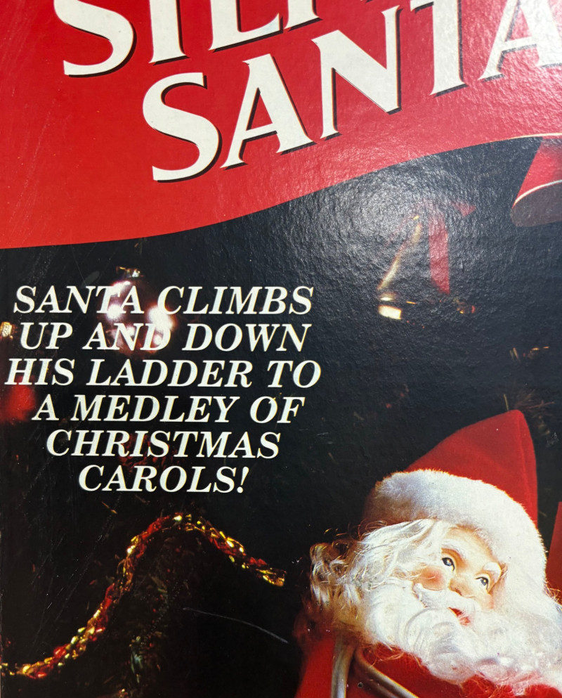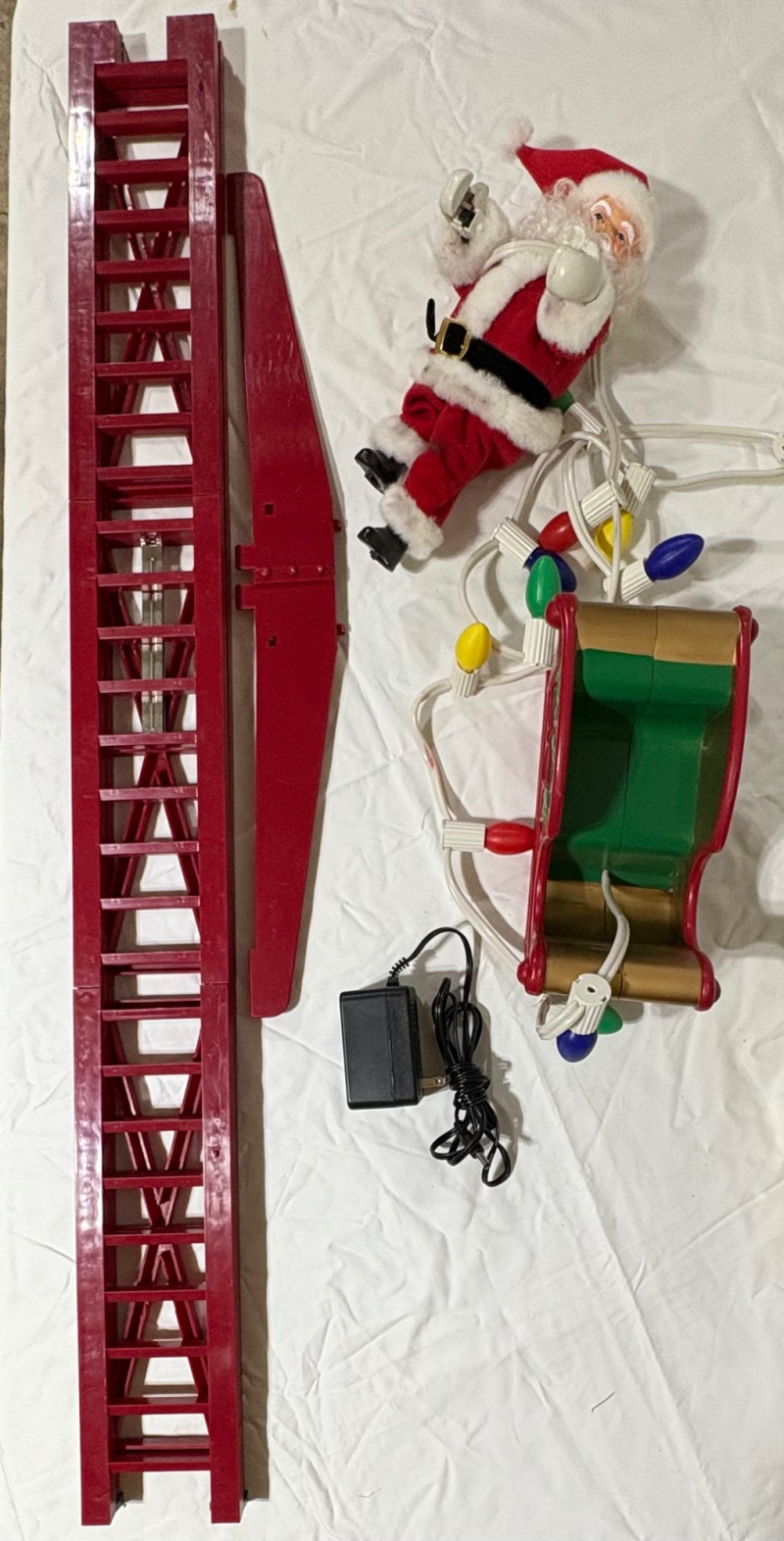 OK, this one from Mr. Christmas (1994) is just plain odd. It's a vintage animatronic Santa who measures about a foot tall and climbs up and down repeatedly on a giant 42" H ladder with his sleigh down below. He seems to work just fine but we’re not sure what the point is - maybe to make kids feel sorry for Santa climbing up and down from everyone’s chimney? Plays music while he hauls that string of lights up and down. Works on an adapter that is included. Note that a couple of the lights are out, but there are extra bulbs included to change them out. Sleigh measures about 7" H and the distance between the ladder bases is about 27". There are some more modern versions of this with a single leaning ladder, but this one appears to be from the early 1990s.