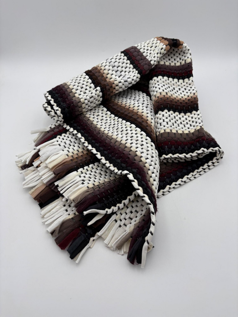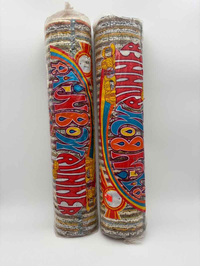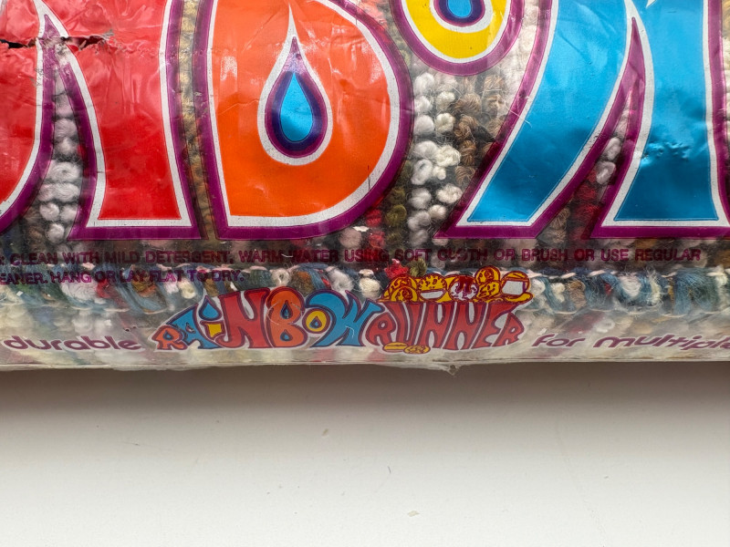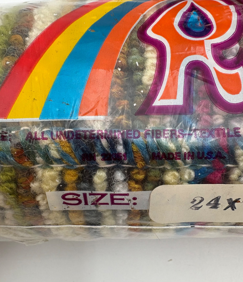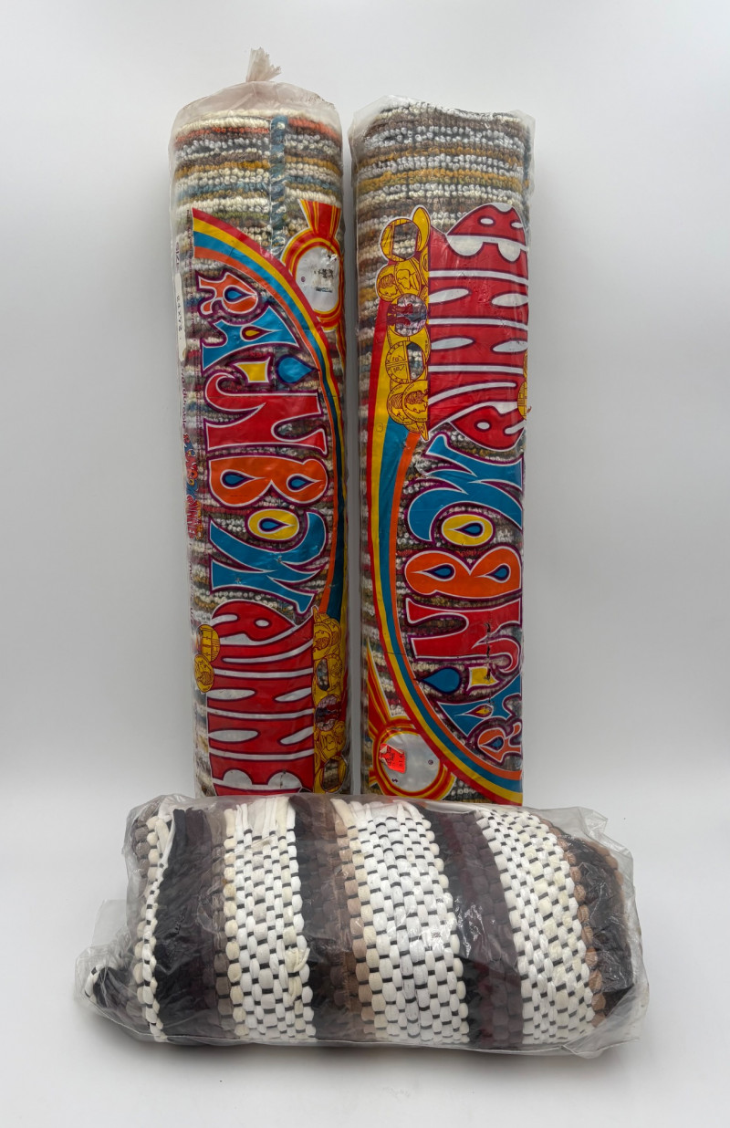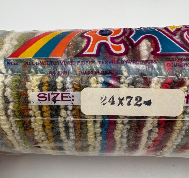 Pair of vintage runners & rag rug perfect for your kitchen or high traffic areas. The pair of "Rainbow Runner" rugs in multi-colored stripes measure 24" x 72". We slid one rug partially out of its wrapping so we could photograph the color accurately with no plastic glare. There is no manufacturer and the fabric content is listed as indeterminate (at least they were honest). Unlike the runners in Lot #12, these 2 rugs have a rough back and will need pads underneath if you plan to use them on hardwood floors. The shades of brown & white rag rug is also new, but we took it out of the package to measure and photo. It feel like polyester. Measures approx. 23" x 44" with fringe on the short sides.