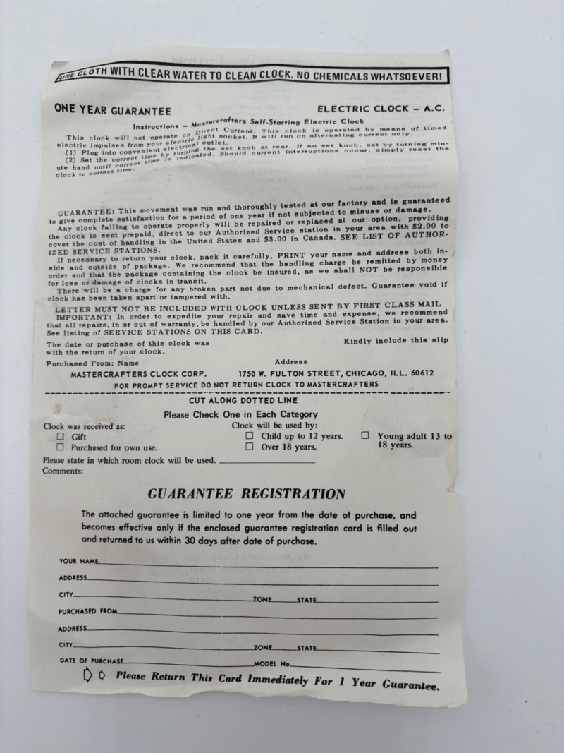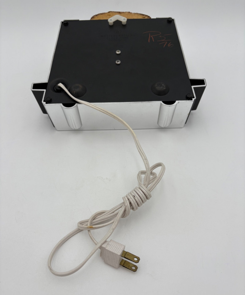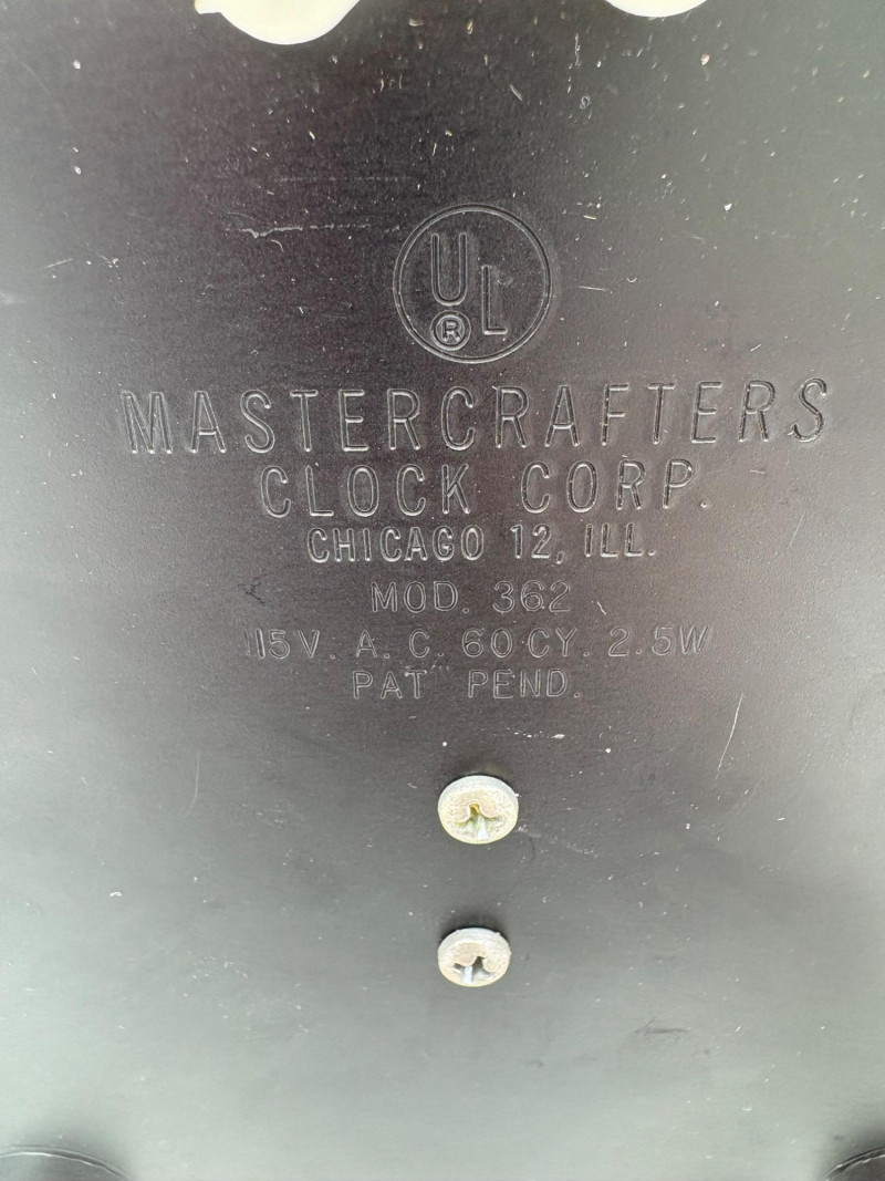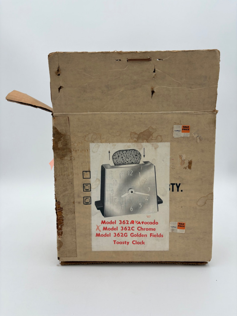 This 1969s electric "Toasty Clock" from Masterclock is in the shape of a MCM toaster and even has a faux piece of foam toast. Model #362C (chrome). Powers on and while it's a bit noisy, the toast rises and falls in the top slot approx. every 5 seconds or so - not sure what the point is, but it's definitely novel! Measures approx. 8.5" square x 3" D. Comes with original box & warranty card - box is in poor shape and a bit smelly, but the clock itself is in good shape. Can be wall hung or sit on a shelf/table.