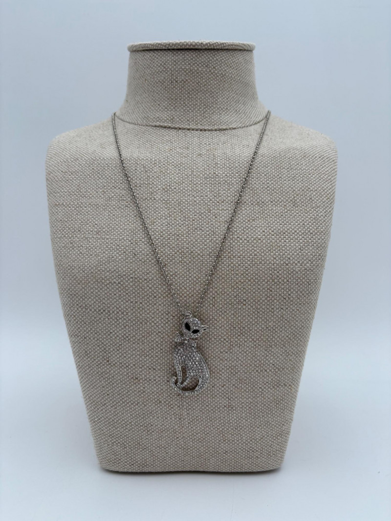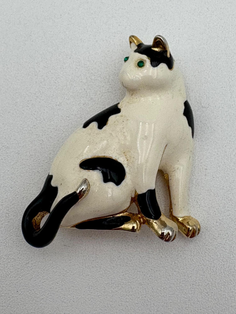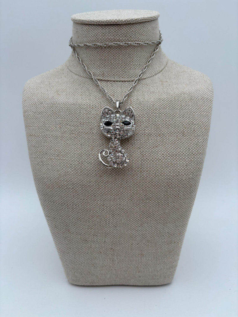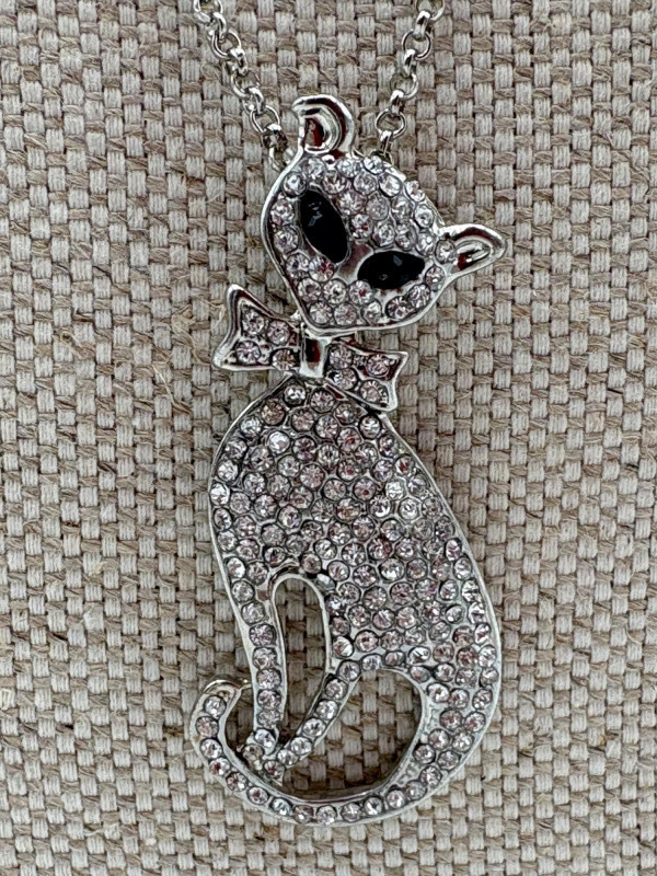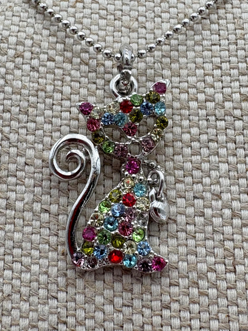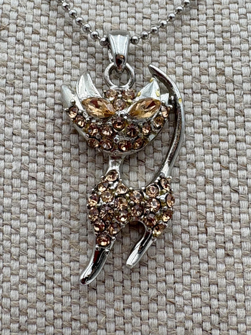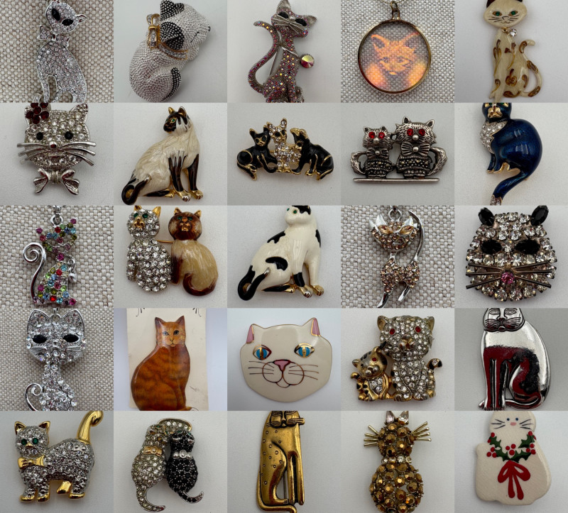 Great mix of 25 different cat-themed pieces of costume jewelry - 5 necklaces and 20 pins. Some are vintage while some are not - please see photos for details. Smallest measures 1" H while largest measures. 3" H.