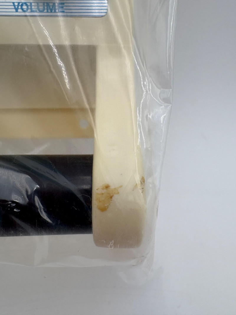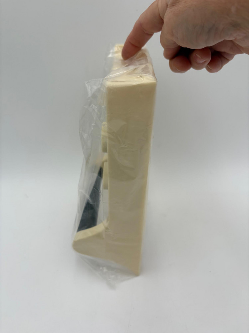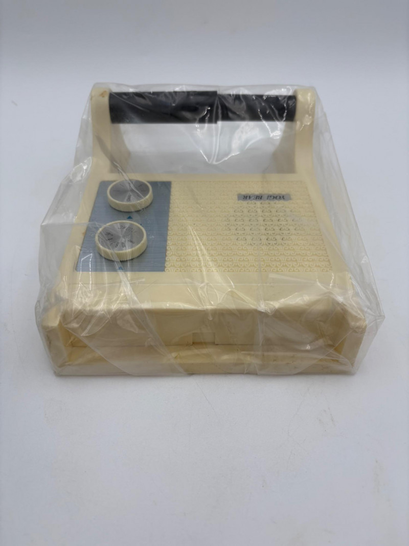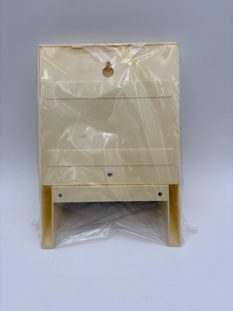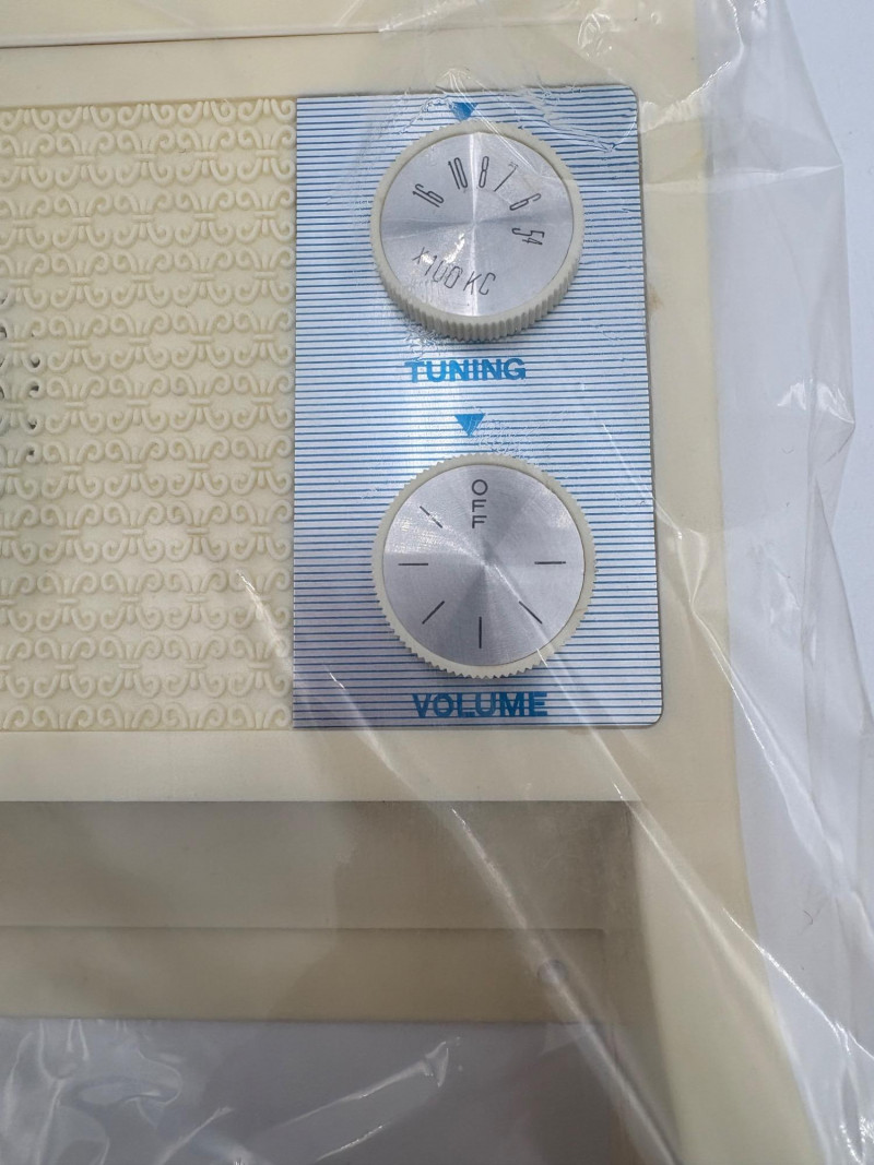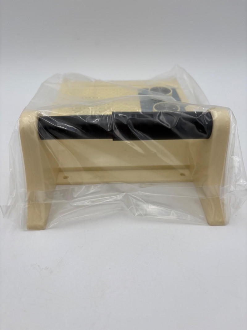 This vintage 1960s item lets you multi-task: listen to the radio while you are doing your business. From Markson Radio of Chicago, this sold-state radio/TP holder wall mounts and holds a standard roll of toilet paper below the speaker. Radio/TP holder unit is new in its original packaging with the original 9V battery to run it still enclosed in the instruction plastic. Also included is the exterior box which does show wear from storage.* Looks to be in great shape although we noticed a discoloration as noted in last photo. Measures approx. 9" H x 6" W x 3" D. * Radio is untested because we didn't want to open the packaging.