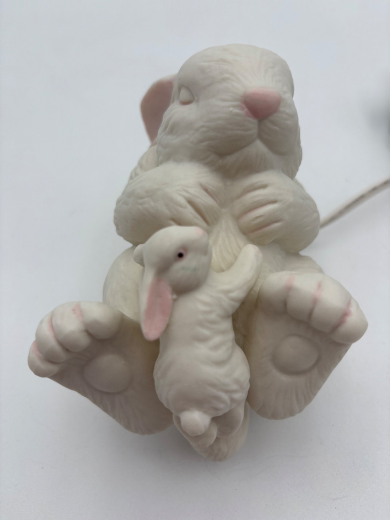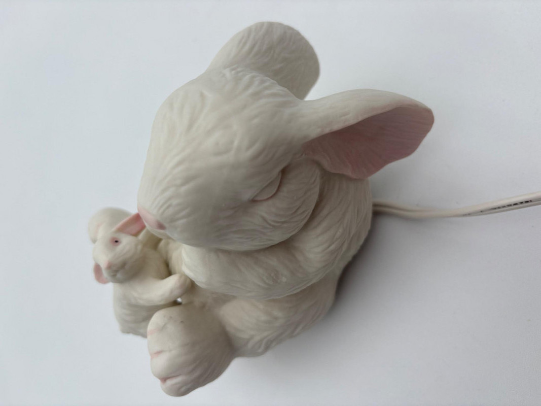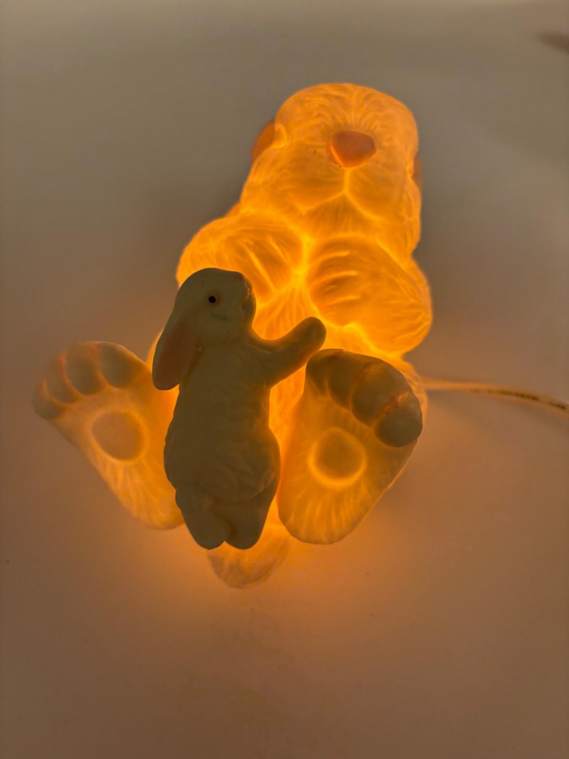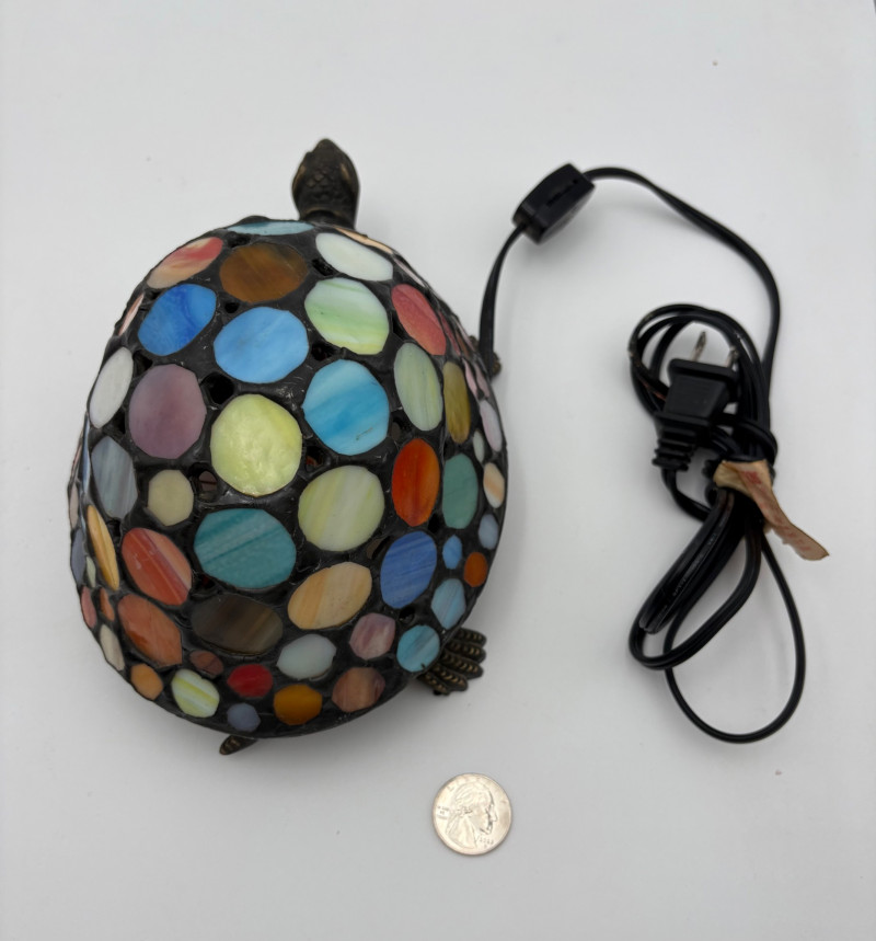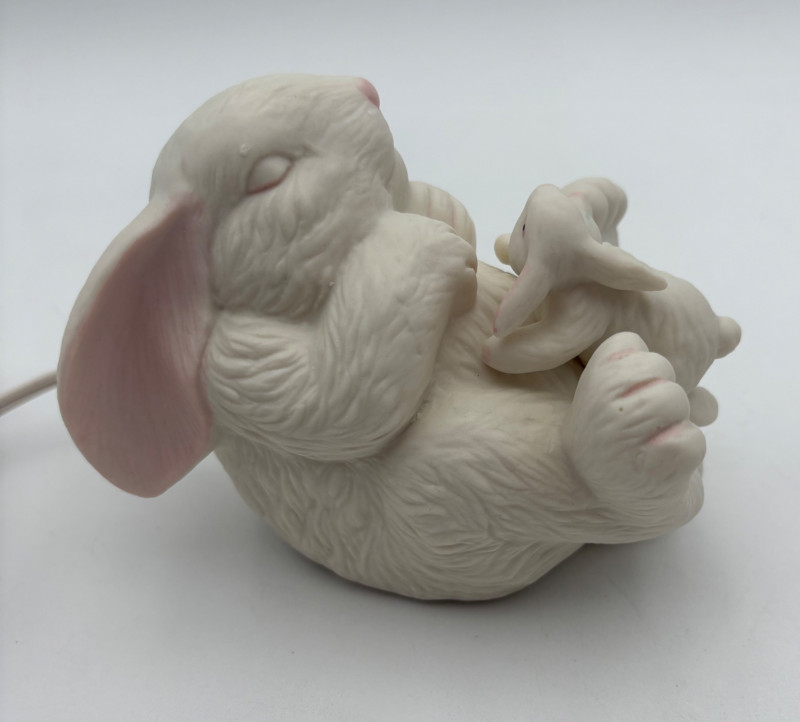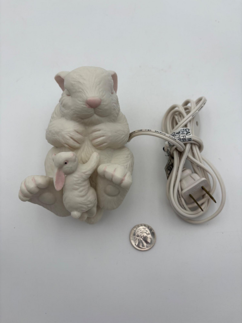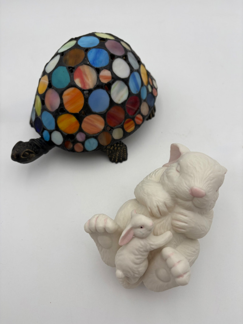 Two lamps that aren't even close in style, but ya gotta love a rabbit & hare! Stained glass tortoise is cast metal with a pieced mutli-colored glass shell held on by clips. 2-pronged cord with roller on/off switch. Measures approx. 4.5" H x 9" L x 6" W. White porcelain rabbit light with baby rabbit on its tummy and pink tinted ears. 2-pronged cord with rolled on/off switch. Measures 4" H x 5.5" L x 3" W.