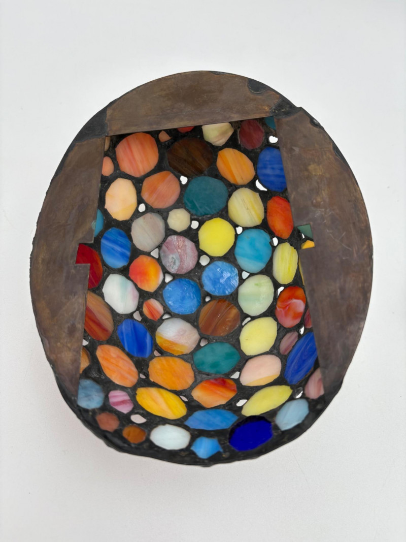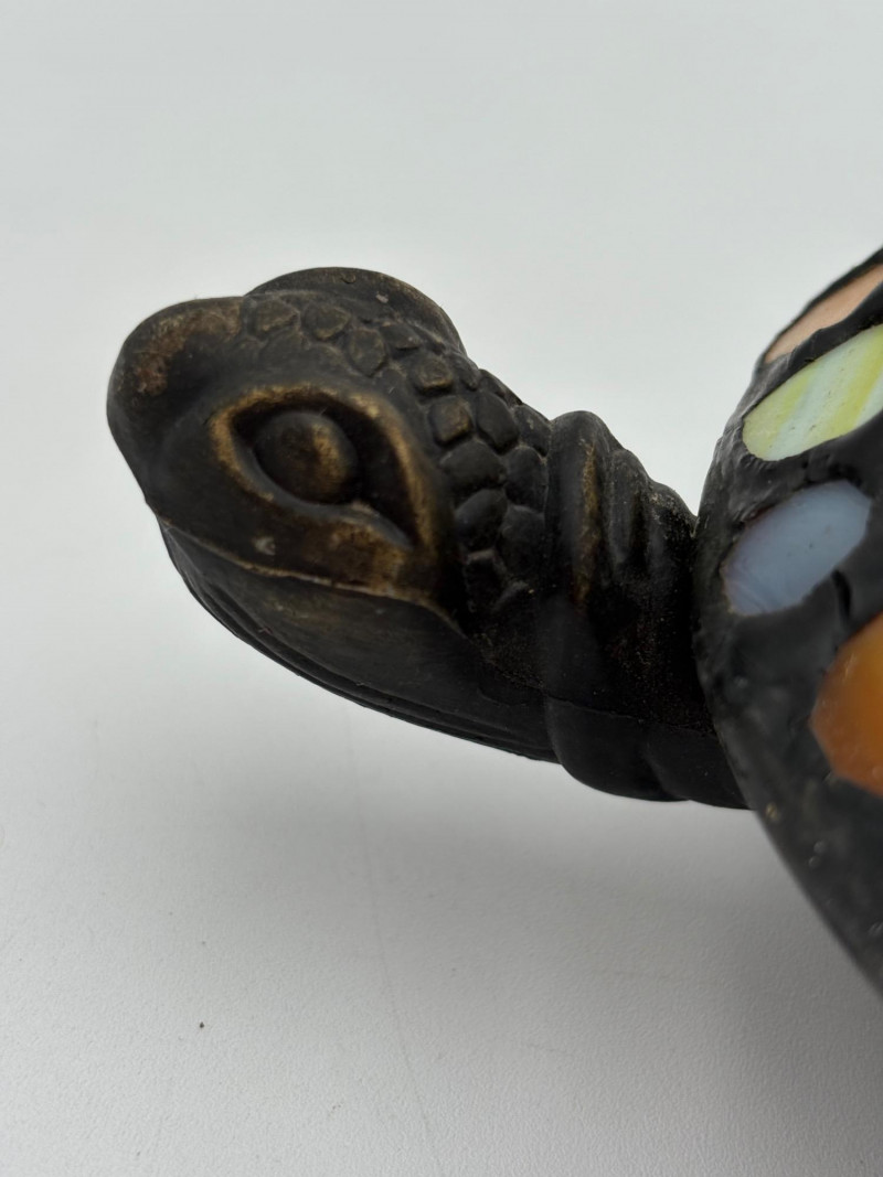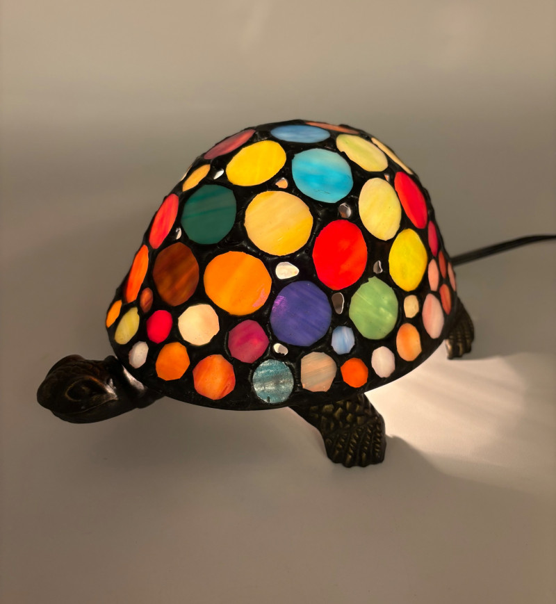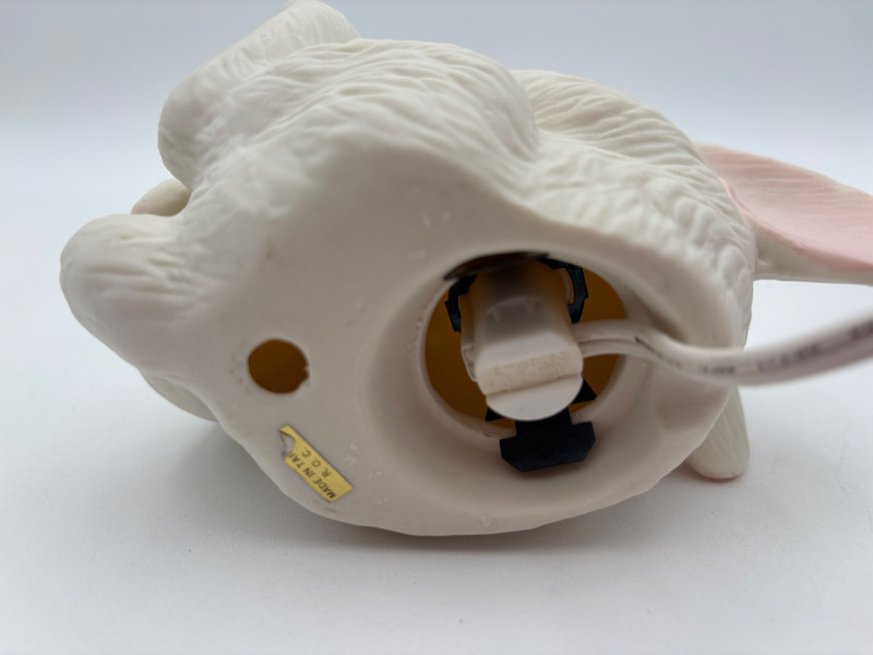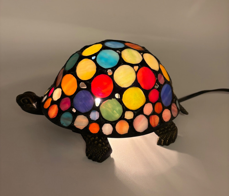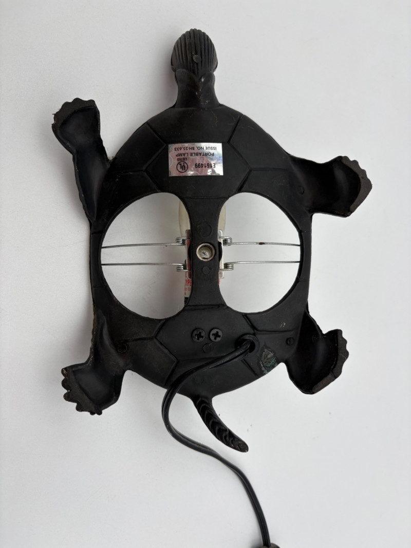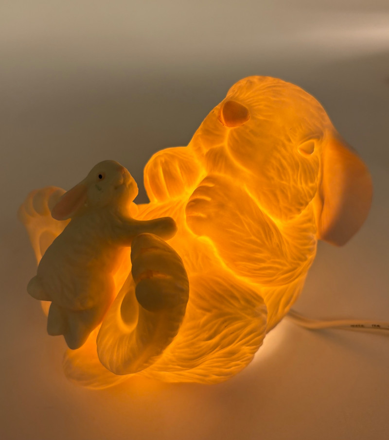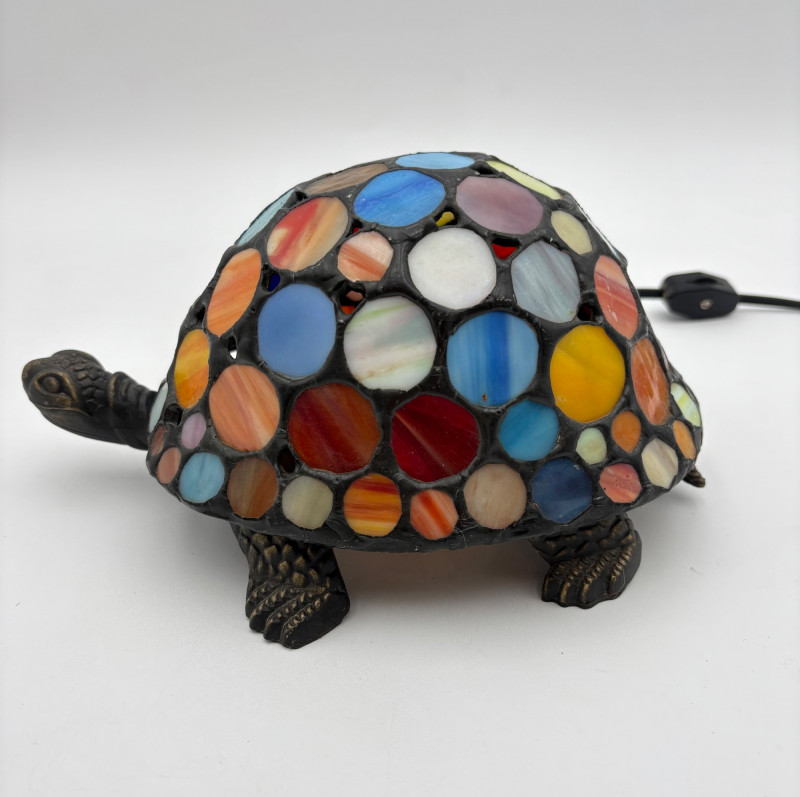 Two lamps that aren't even close in style, but ya gotta love a rabbit & hare! Stained glass tortoise is cast metal with a pieced mutli-colored glass shell held on by clips. 2-pronged cord with roller on/off switch. Measures approx. 4.5" H x 9" L x 6" W. White porcelain rabbit light with baby rabbit on its tummy and pink tinted ears. 2-pronged cord with rolled on/off switch. Measures 4" H x 5.5" L x 3" W.