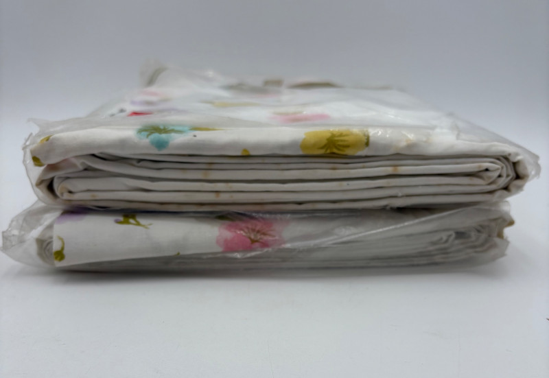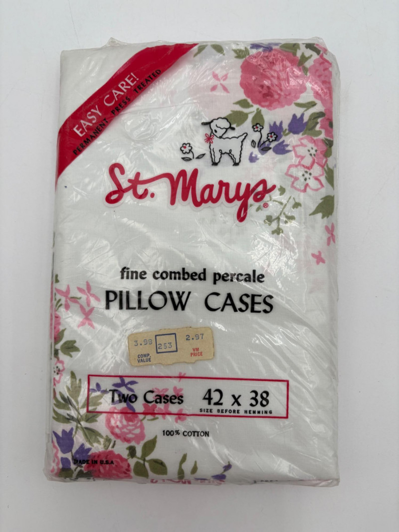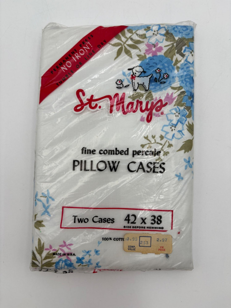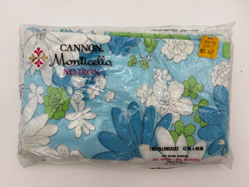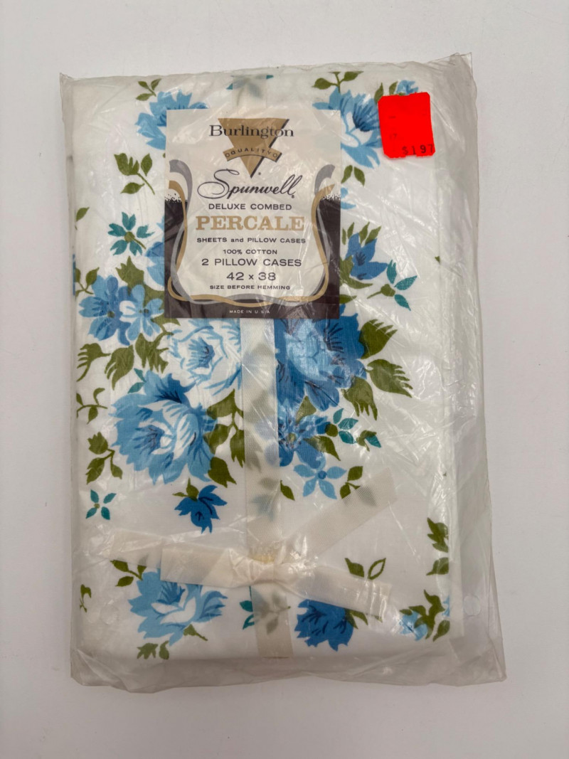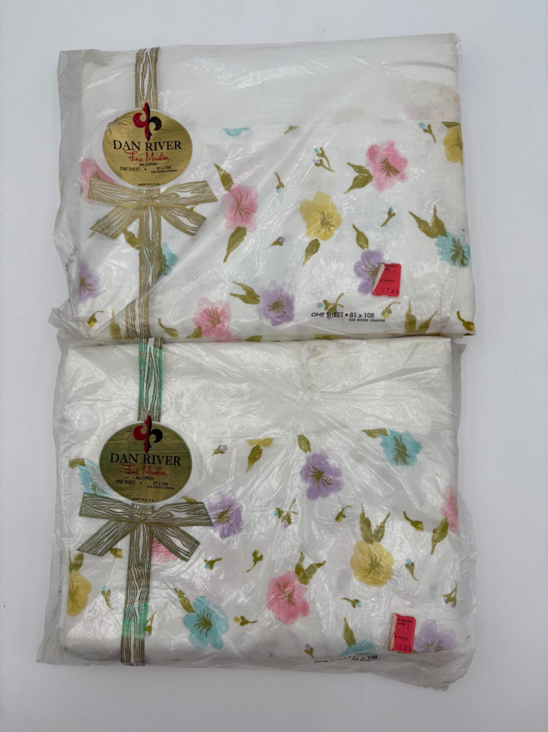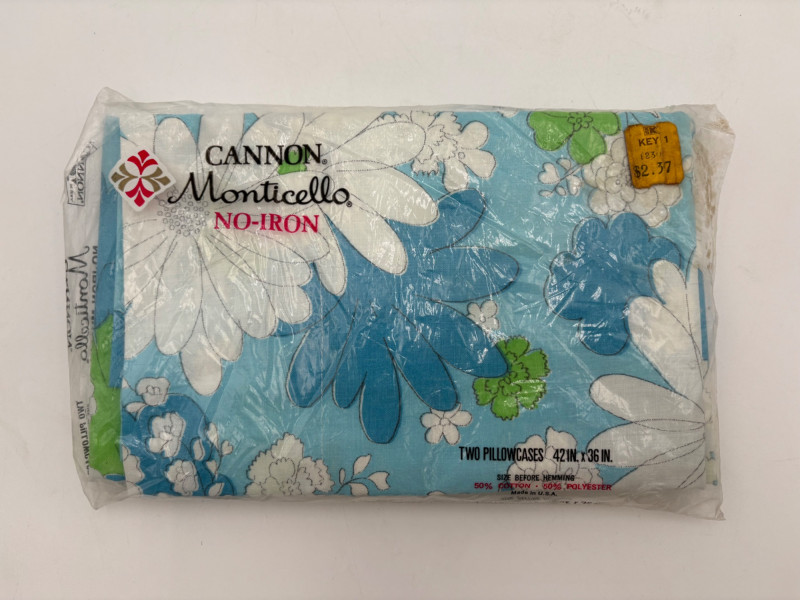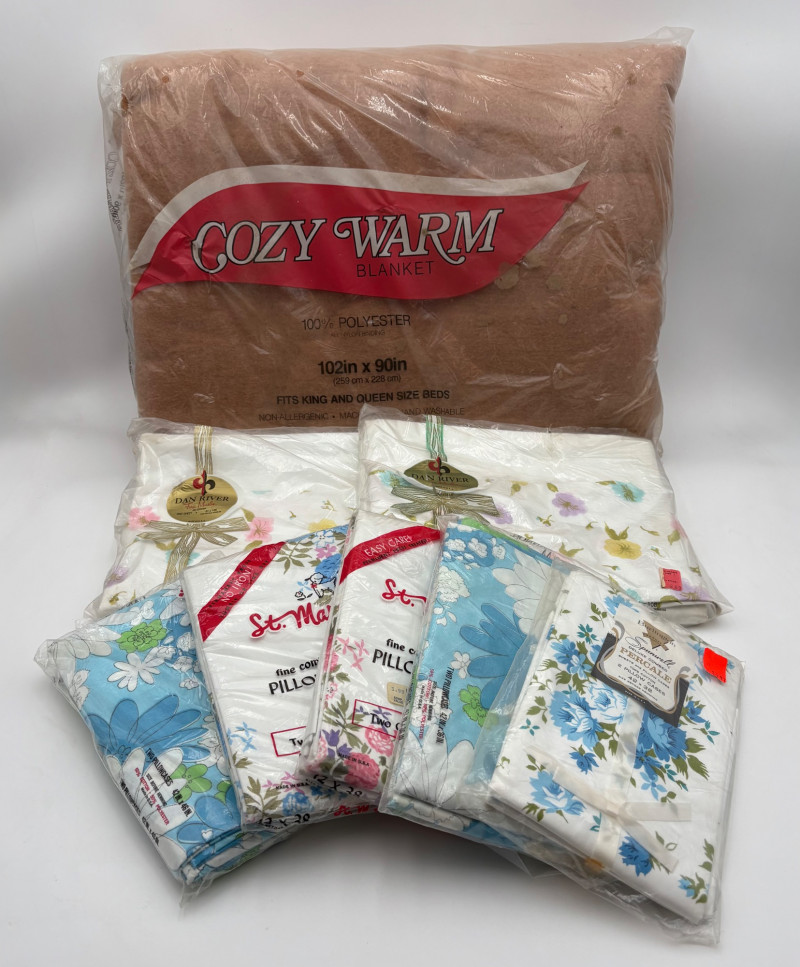 Nice group of vintage linens. All are unused in their original packaging and appear to fit larger beds/pillows such as a king - please see photos for details. All were made in the USA and we think they are from the late 1970s/1980s. 1 king size blanket with ribbon trim on the top & bottom from Owen in a pale tan. Measures 102" x 90". 2 king size flat cotton sheets in soft floral print from Dan River. Measure 81" x 108". Please note that the packaging on these has split on one end of each bag allowing the sheet to be exposed to the environment - there appears to be some faint brown spotting on folded edges - see last photo. May launder out (the same marks washed out of the towels in Lot #50) 5 packages of pillowcase pairs in various sizes (total of 10 pillowcases): - 1 pair of blue, green & white groovy floral from Cannon measure 42" x 36". - 1 pair of blue, green, & white groovy floral from Cannon measure 42" x 46". - 1 pair of blue, green, pink, & white in Mum print from St. Mary's measure 42" x 38". - 1 pair of purple, green, pink & white in Mum print from St. Mary's measure 42" x 38". - 1 pair of green blue and white Rose print from Burlington measure 42" x 38". Note; if you are a seamstress or just know how to thread a needle, these pillowcases are PERFECT for "pillowcase" dresses from little girls - fast & very cute for little effort! 40+ Pillowcase Dresses Free Patterns and Tutorials | So Sew Easy