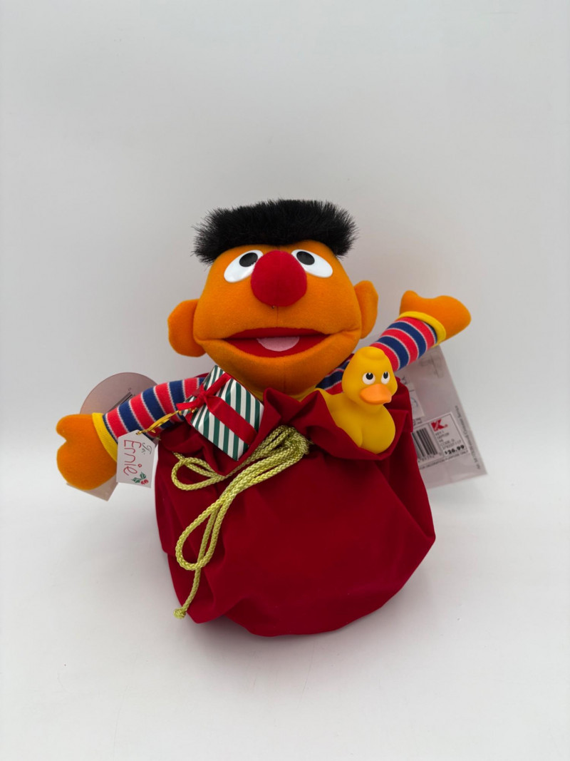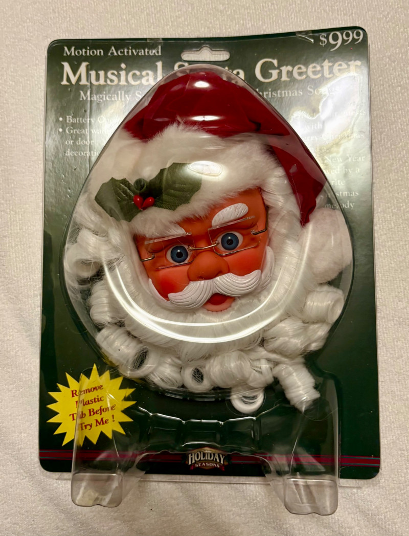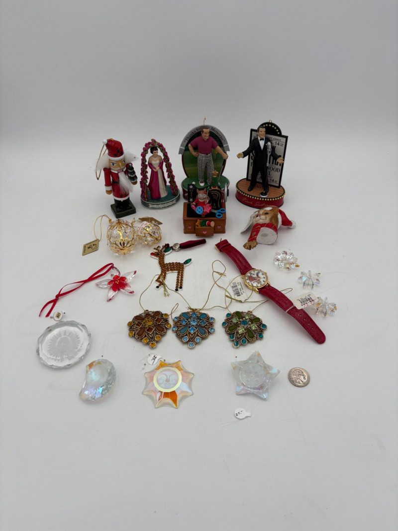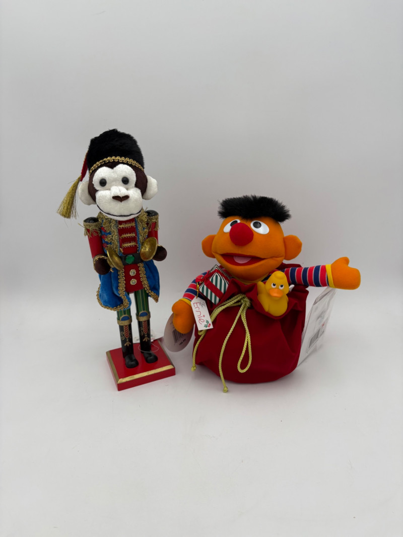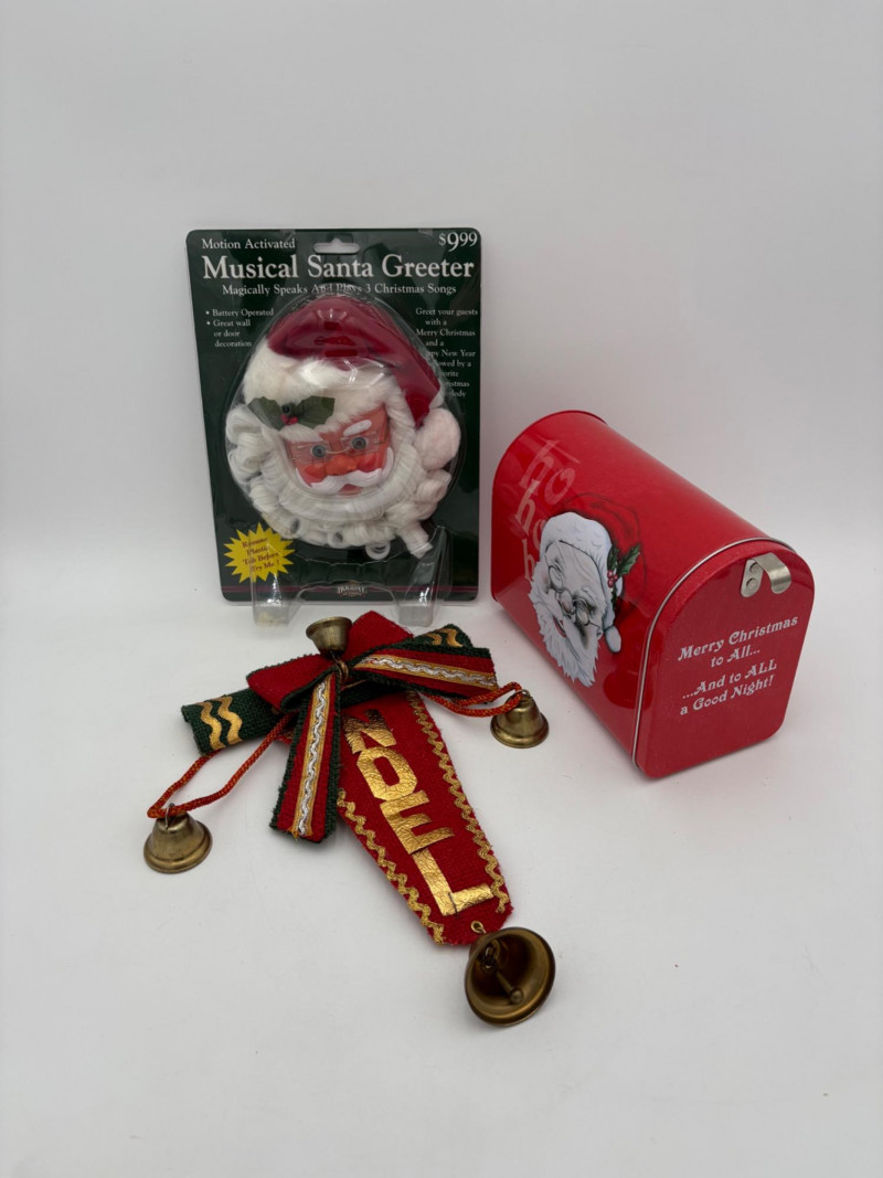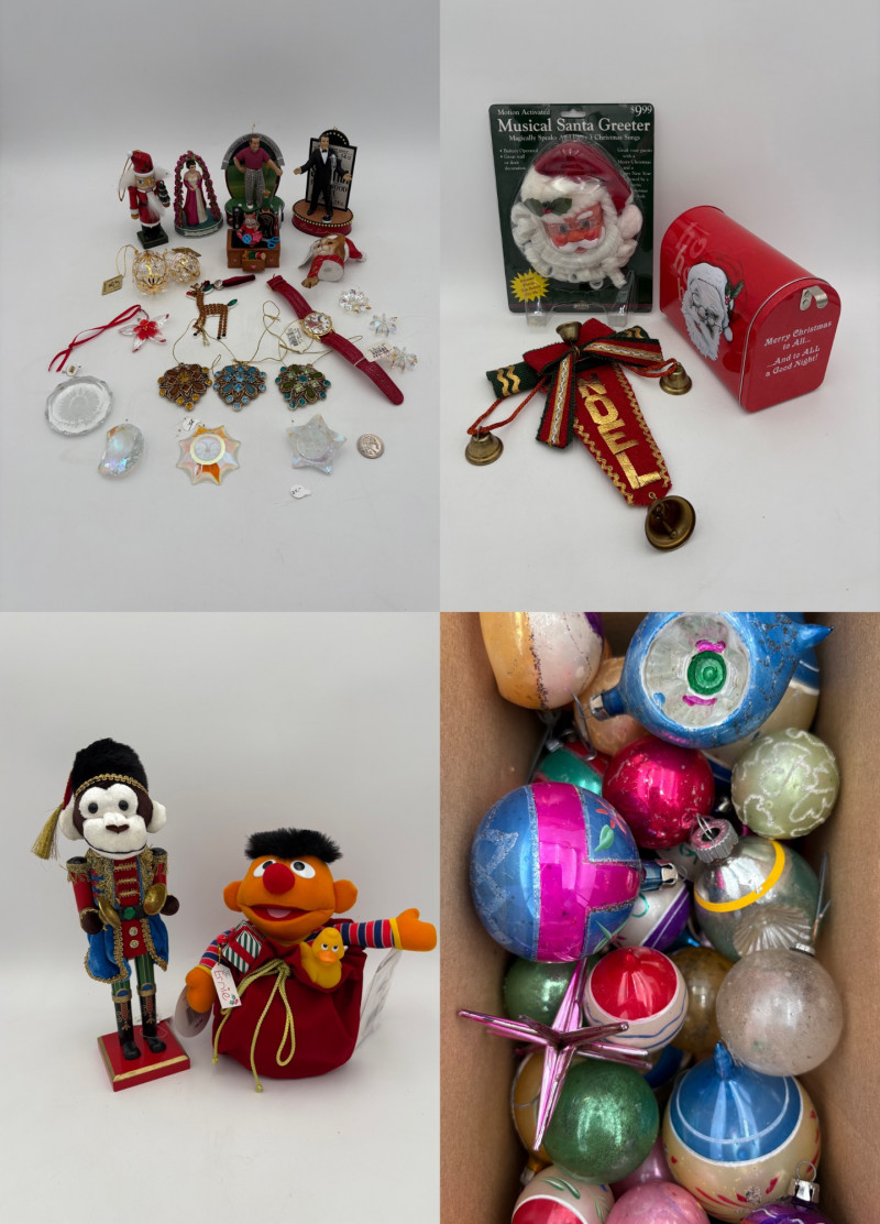Lots of Christmas decorations and such - real variety so everyone should be able to find something they want! - Motion activated Santa greeter head is new in original heavy plastic package - we did not open to test because we wouldn't be able to get it back in with this packaging. Plays music and greets visitors. Measures approx. 7" H. - Monkey nutcracker from JC Penney Home. New with tags. Stands 14" H. - Sesame Street Ernie figure - he goes up and down slowly while he sings (an irritating) song over and over. Exactly what a toddler wants to hear...Uses 2 AA batteries. New with tags. Measures approx. 10" H. - Nice cookie gift tin featuring Santa's head in the shape of a mailbox with flag. Measures approx. 6" H x 8" W x 4" D. Looks new. - Small vintage jingle bell wall hanging with "Noel" down the front. Looks handmade, but it's not - made in Japan. Measures approx. 12" L. - Group of Christmas ornaments - several from Carleton Cards, The Music Box Company, and several good quality prism suncatcher ornaments appropriate year round. Most of this group are new with original boxes/tags. They aren't tested if they move or make sound. - Group of vintage Christmas glass ornaments - these are super thin and appear to be home-painted.