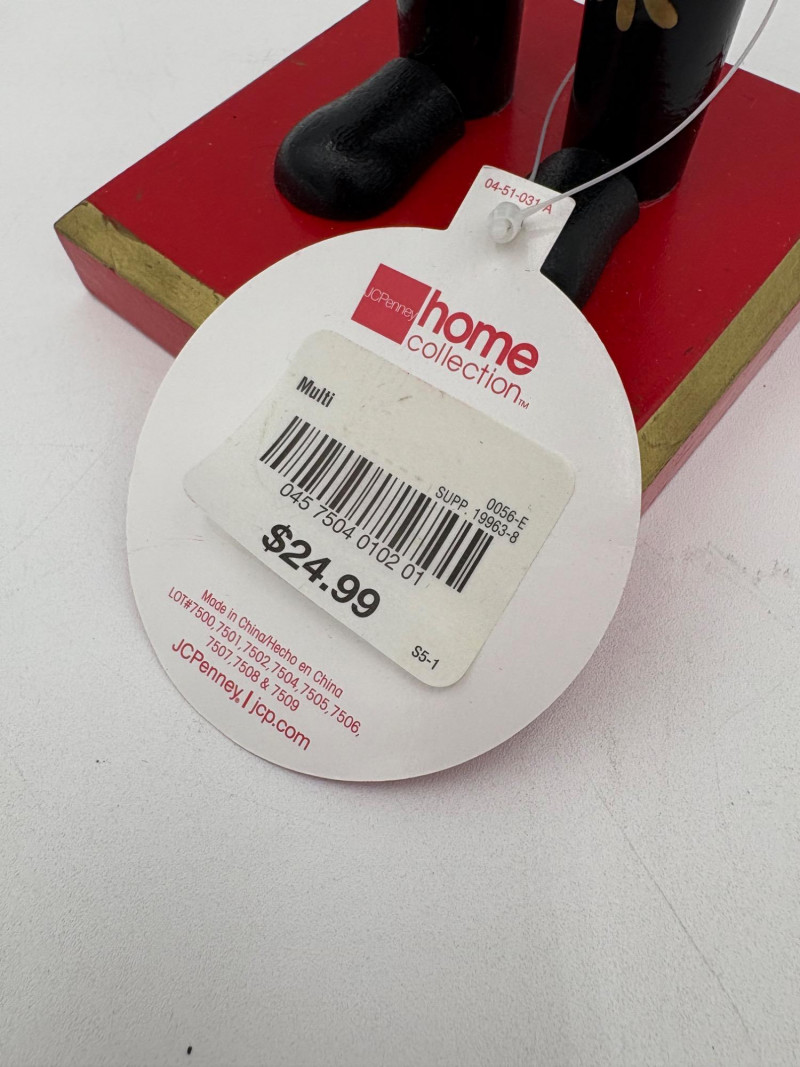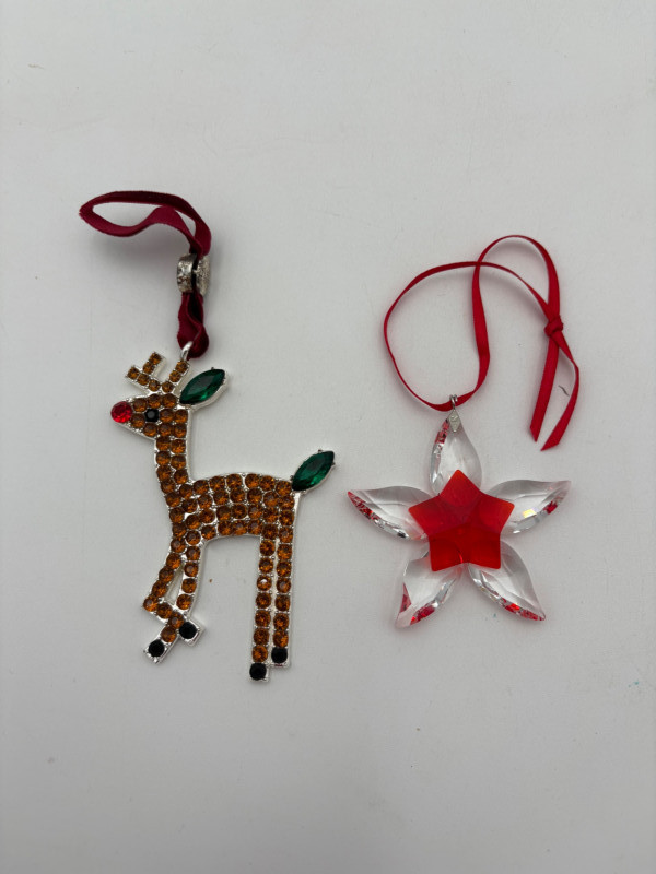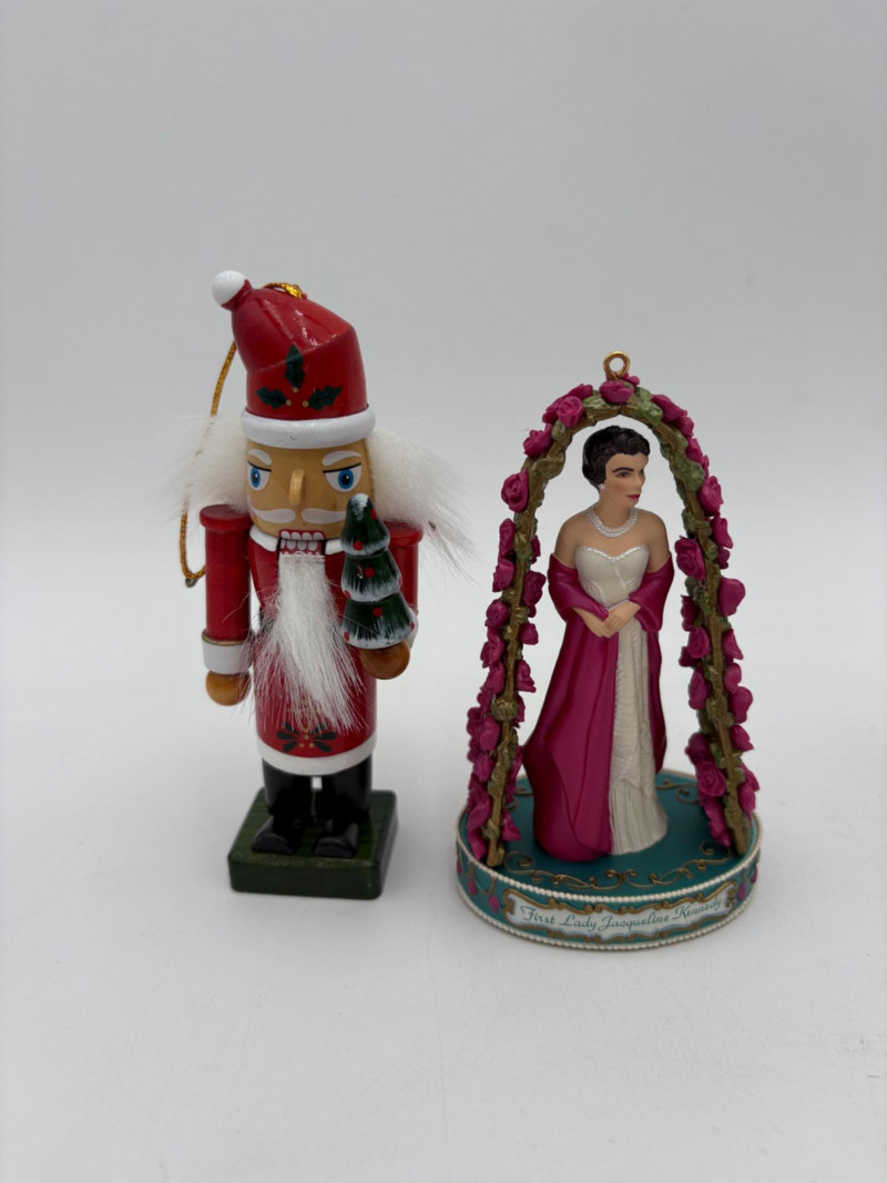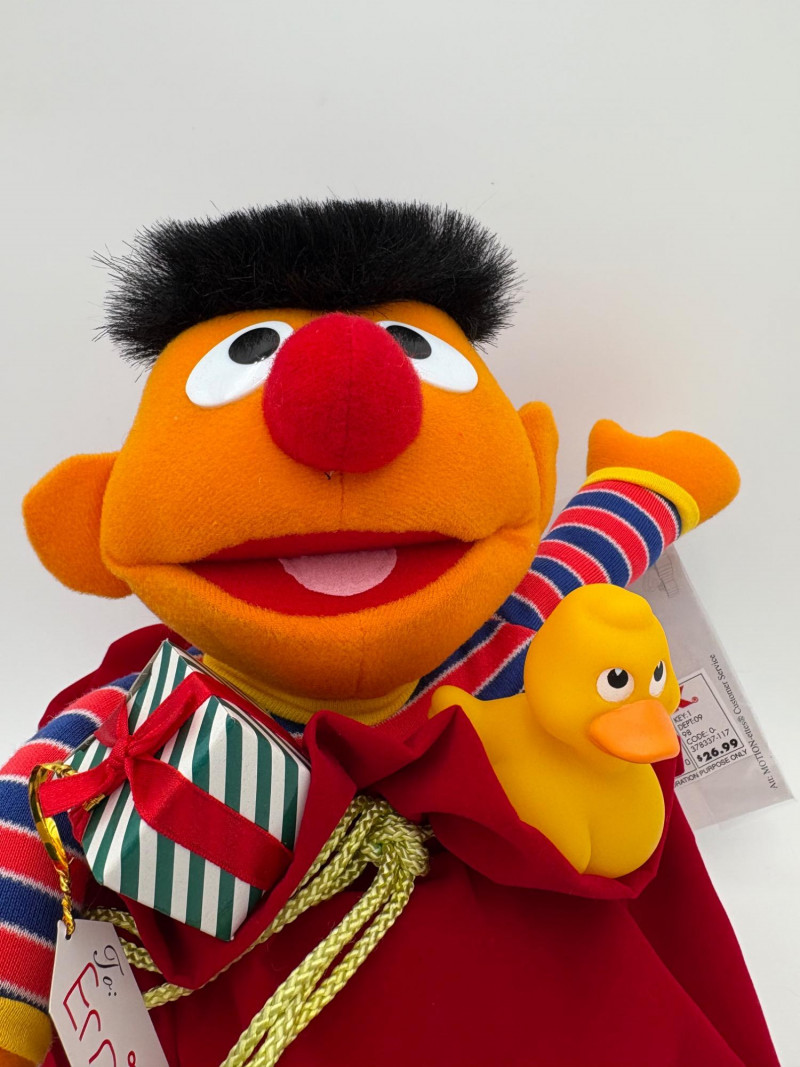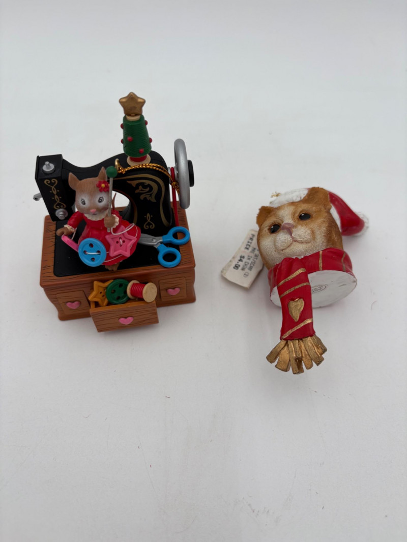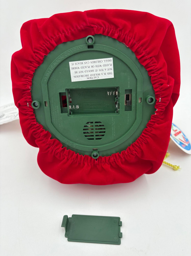Lots of Christmas decorations and such - real variety so everyone should be able to find something they want! - Motion activated Santa greeter head is new in original heavy plastic package - we did not open to test because we wouldn't be able to get it back in with this packaging. Plays music and greets visitors. Measures approx. 7" H. - Monkey nutcracker from JC Penney Home. New with tags. Stands 14" H. - Sesame Street Ernie figure - he goes up and down slowly while he sings (an irritating) song over and over. Exactly what a toddler wants to hear...Uses 2 AA batteries. New with tags. Measures approx. 10" H. - Nice cookie gift tin featuring Santa's head in the shape of a mailbox with flag. Measures approx. 6" H x 8" W x 4" D. Looks new. - Small vintage jingle bell wall hanging with "Noel" down the front. Looks handmade, but it's not - made in Japan. Measures approx. 12" L. - Group of Christmas ornaments - several from Carleton Cards, The Music Box Company, and several good quality prism suncatcher ornaments appropriate year round. Most of this group are new with original boxes/tags. They aren't tested if they move or make sound. - Group of vintage Christmas glass ornaments - these are super thin and appear to be home-painted.